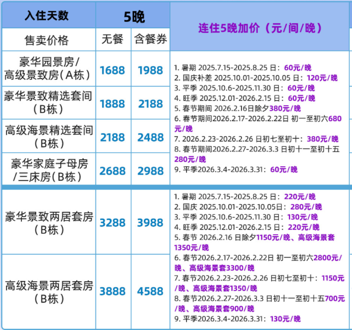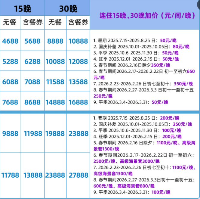 单间含2人餐,2居套含4人餐,3居含6人餐