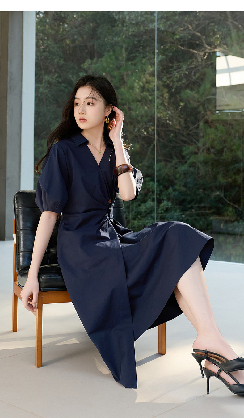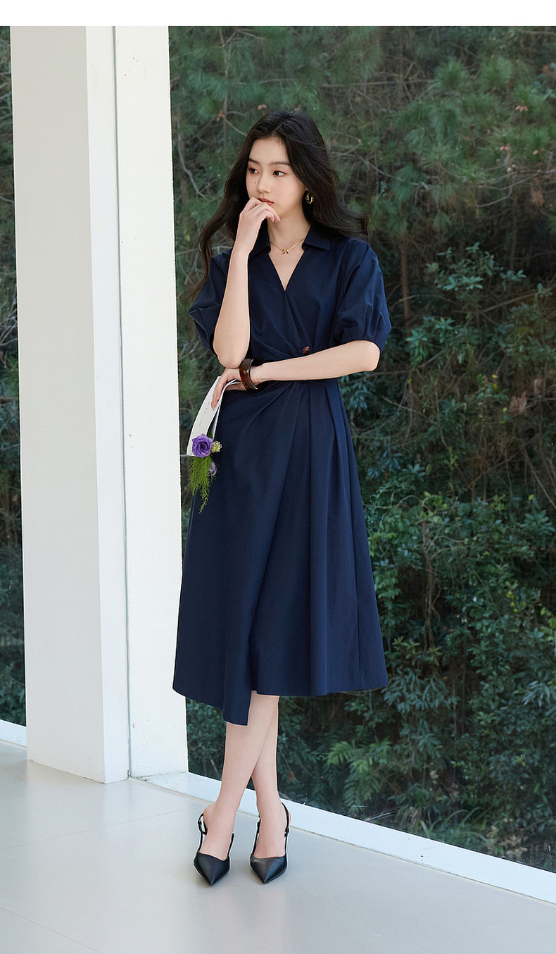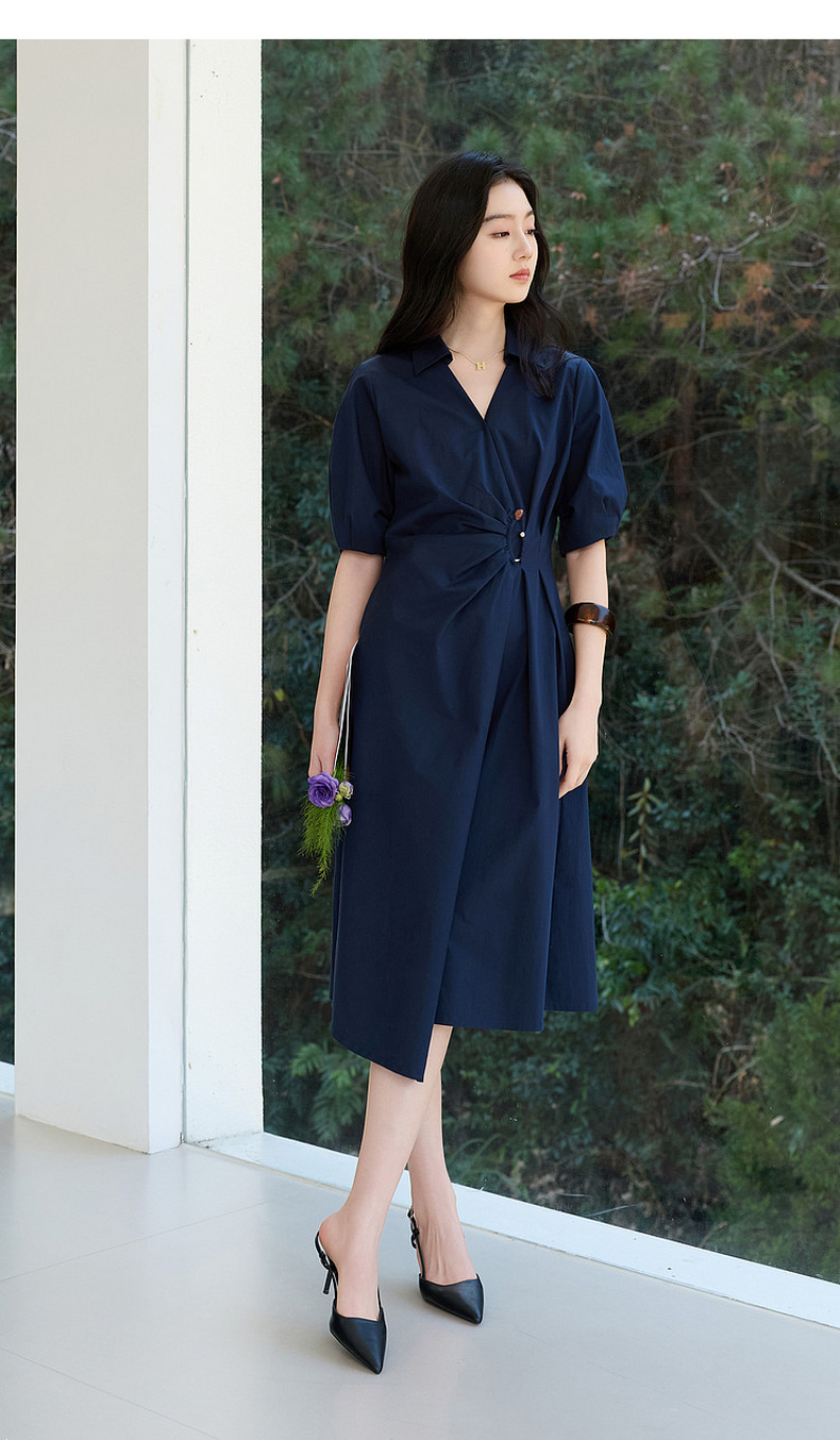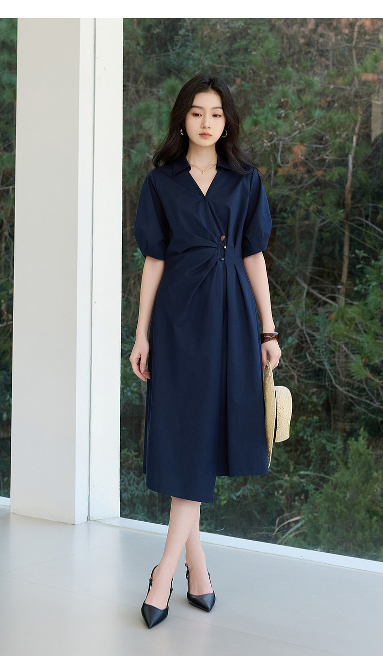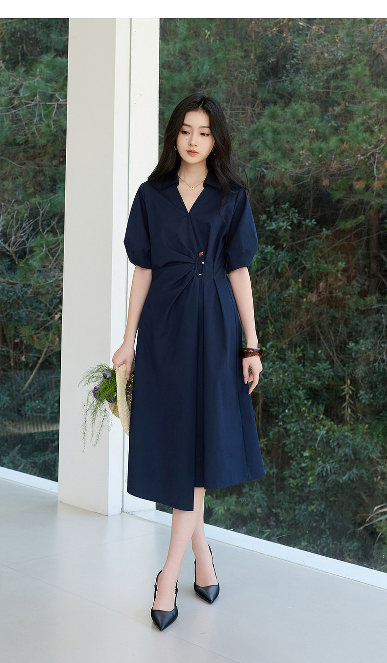 三彩2026春季新款设计感翻领中袖连衣裙A字裙不规则收腰中长裙S