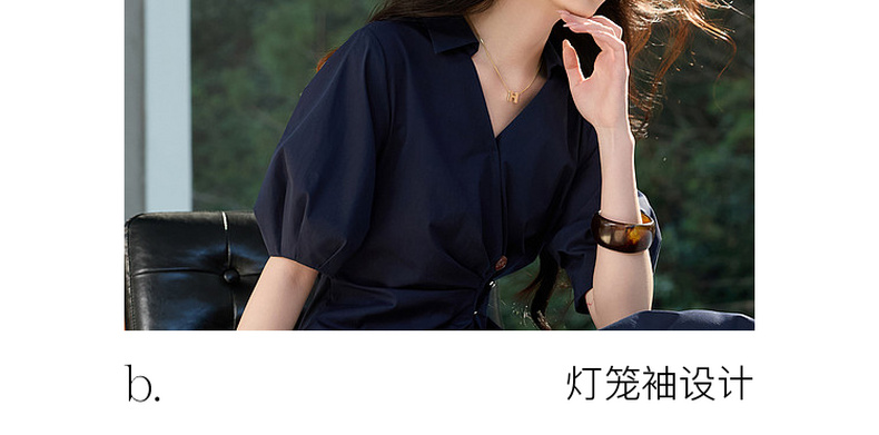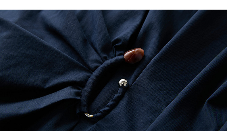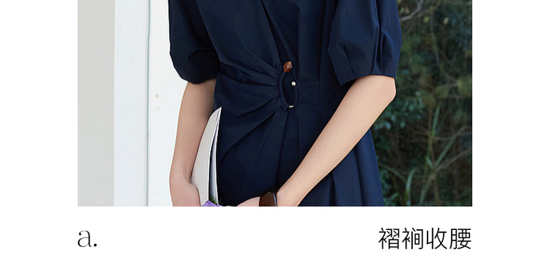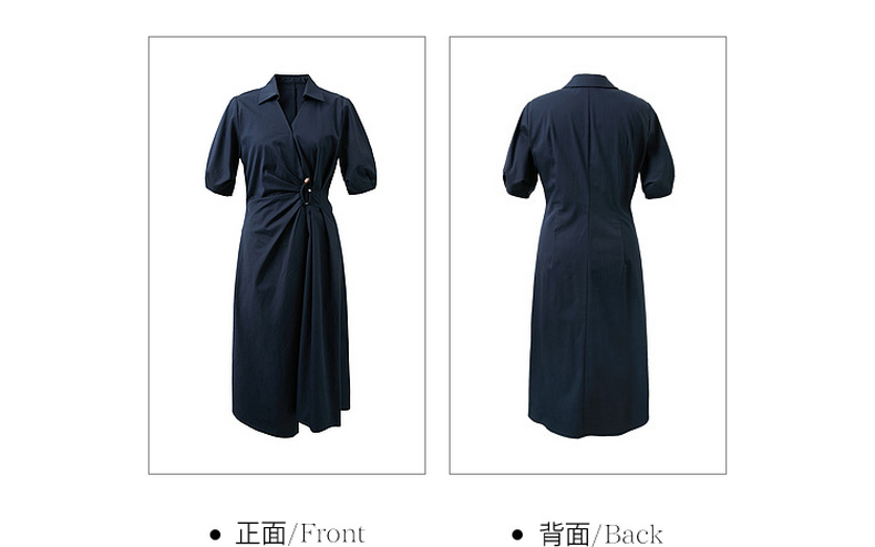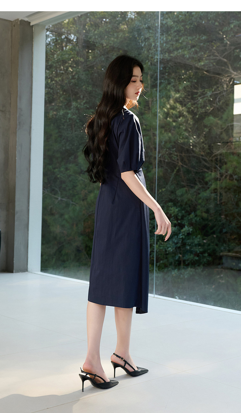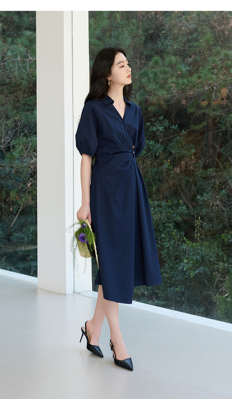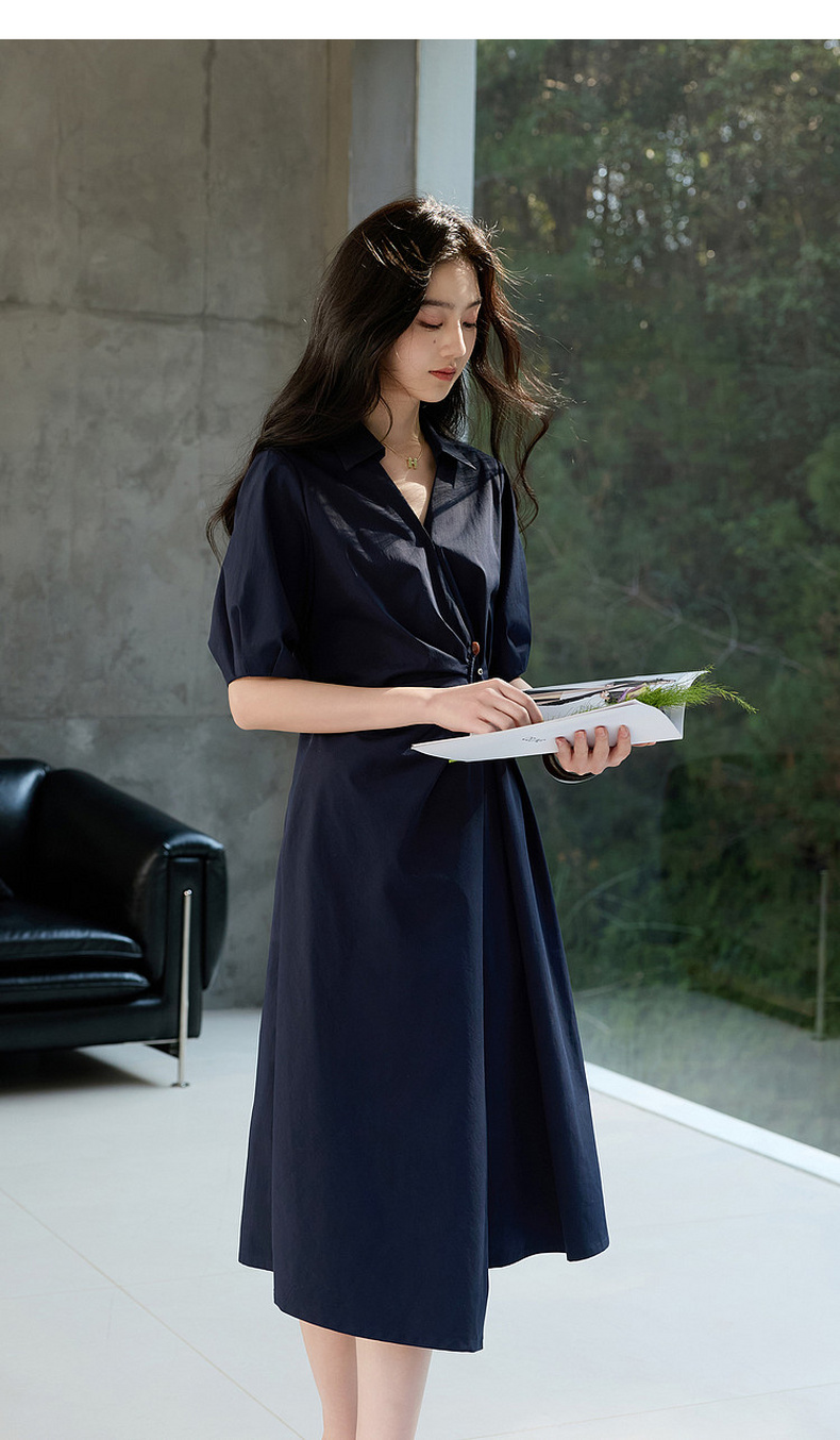 三彩2026春季新款设计感翻领中袖连衣裙A字裙不规则收腰中长裙S