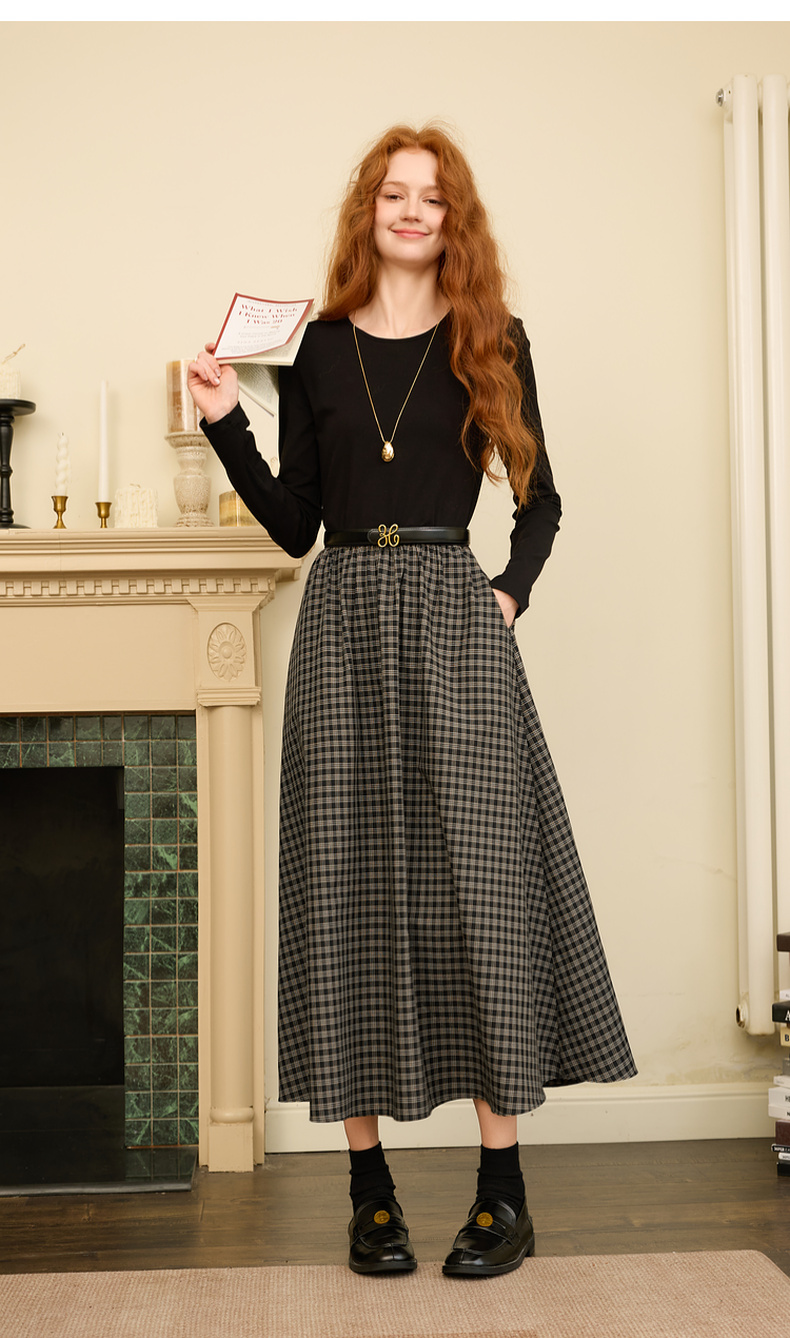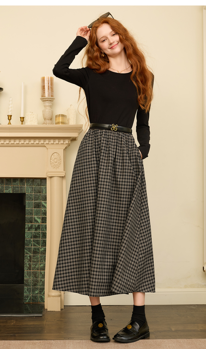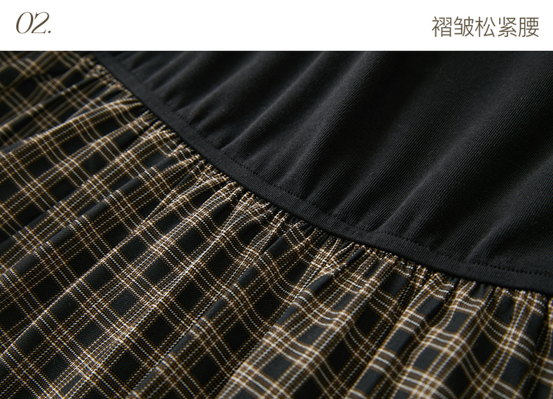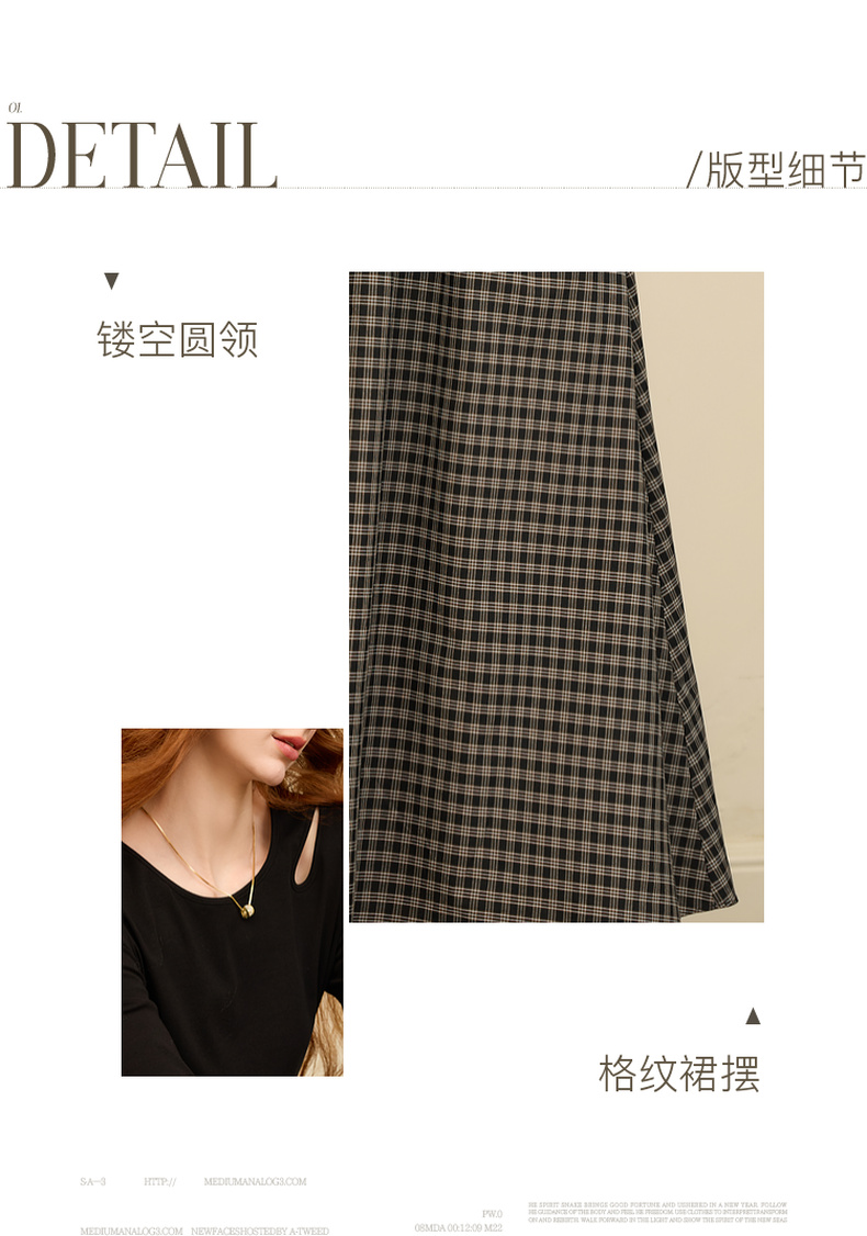 三彩2025冬季新款镂空圆领拼接格纹连衣裙收腰假两件A字裙长裙M