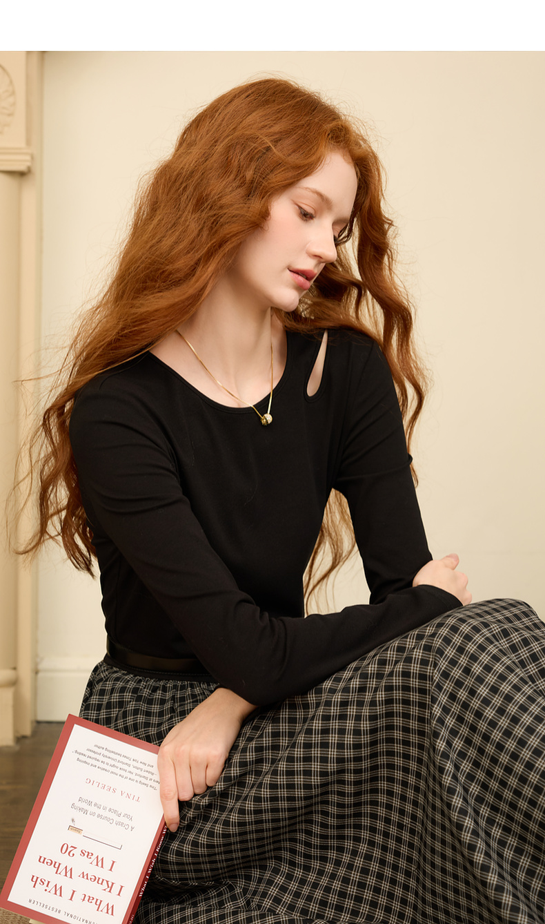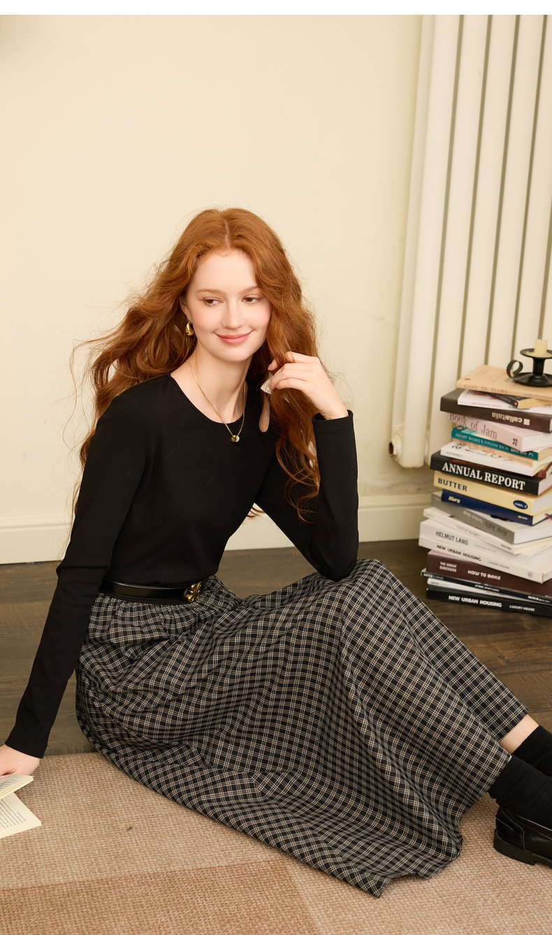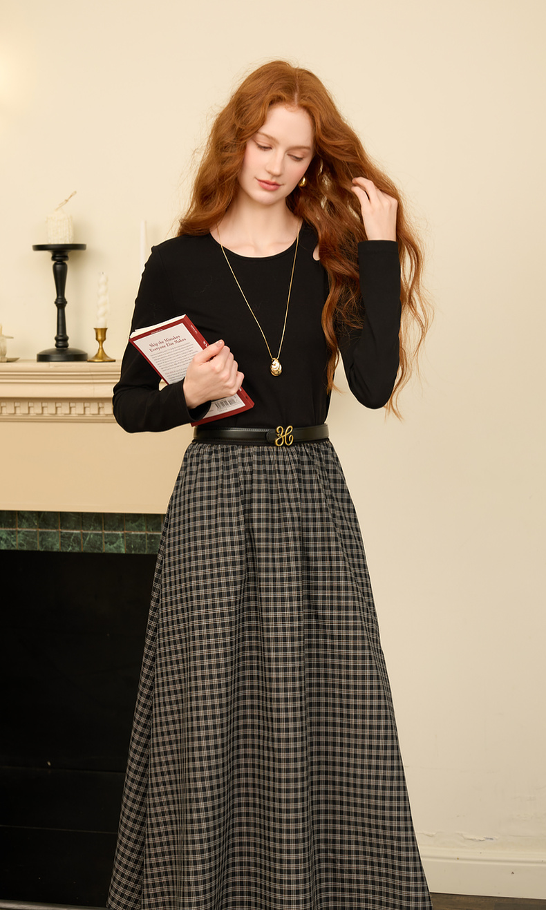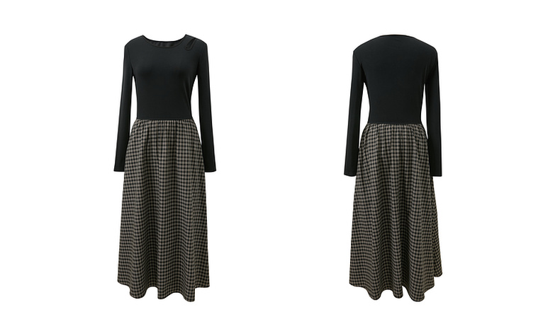 三彩2025冬季新款镂空圆领拼接格纹连衣裙收腰假两件A字裙长裙M