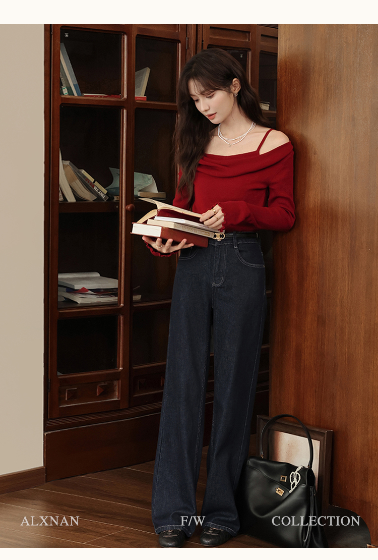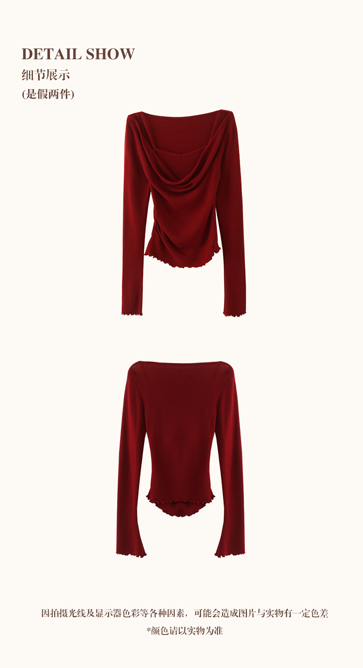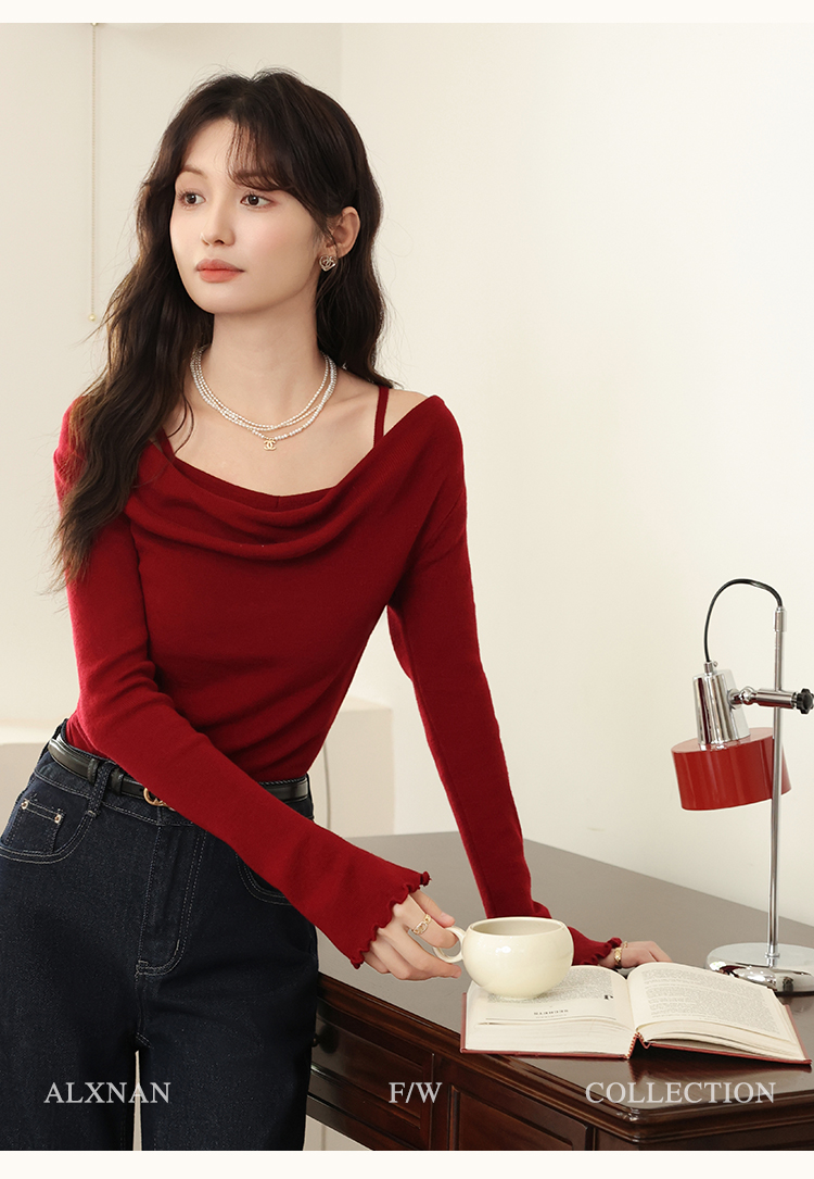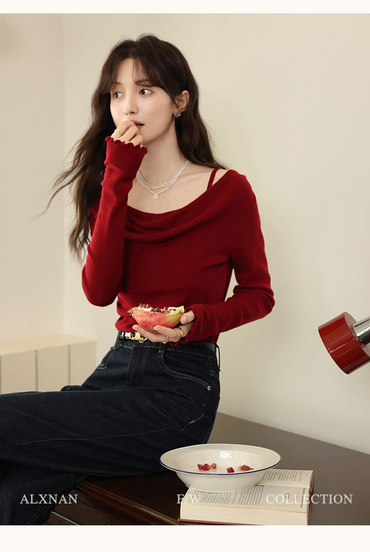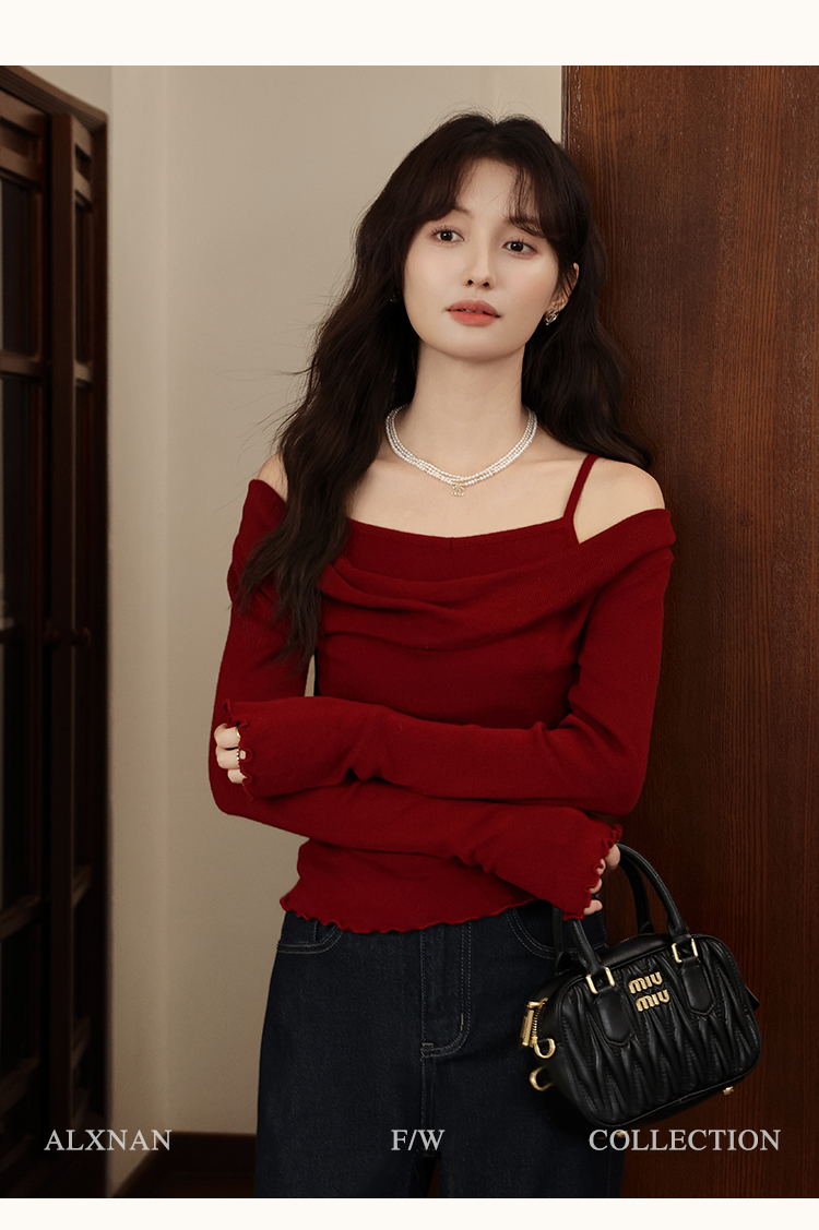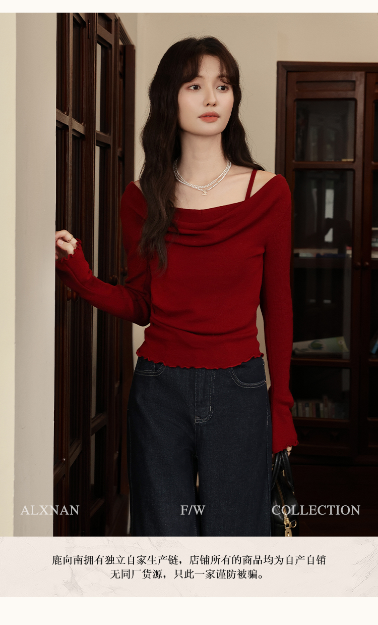 鹿向南「红韵雅致」红色露肩针织衫秋冬新款假两件复古长袖上衣女