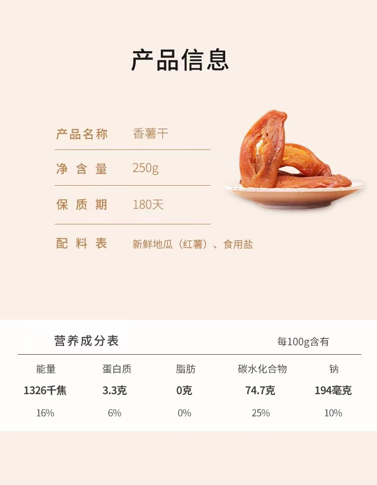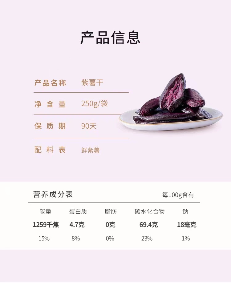 【品名】:香薯干&紫薯干 【产品规格】:250g/包 【储存方式】:存放于干燥、凉爽处,开封后请立即食用。 【发货地】:福建漳州 【发货时效】:72小时内发出 【发货快递】:申通、中通随机发不指定 【补运费地区】:甘肃、内蒙古、宁夏、青海运费加15元/件,新疆、西藏运费加31元/件,上海北京加1元/件。 【售后说明】: 1、食品无质量问题不支持 7 天无理由退换。 2、产品少发、漏发,质量问题,请提供产品连同快递单(需看见单号)一起拍照24 小时内发给客服核实处理。 3、如包裹破损、挤压严重请拍照签收,签单破损签收,请在签收48小时内拍照联系客服处理。 4、产品已经发出的情况下,不建议更改地址、不退货,下单前,请仔细核对信息!货物产生物流单号,无法拦截,如需拦截 拦截费4元、改地址须支付快递费用3元。
