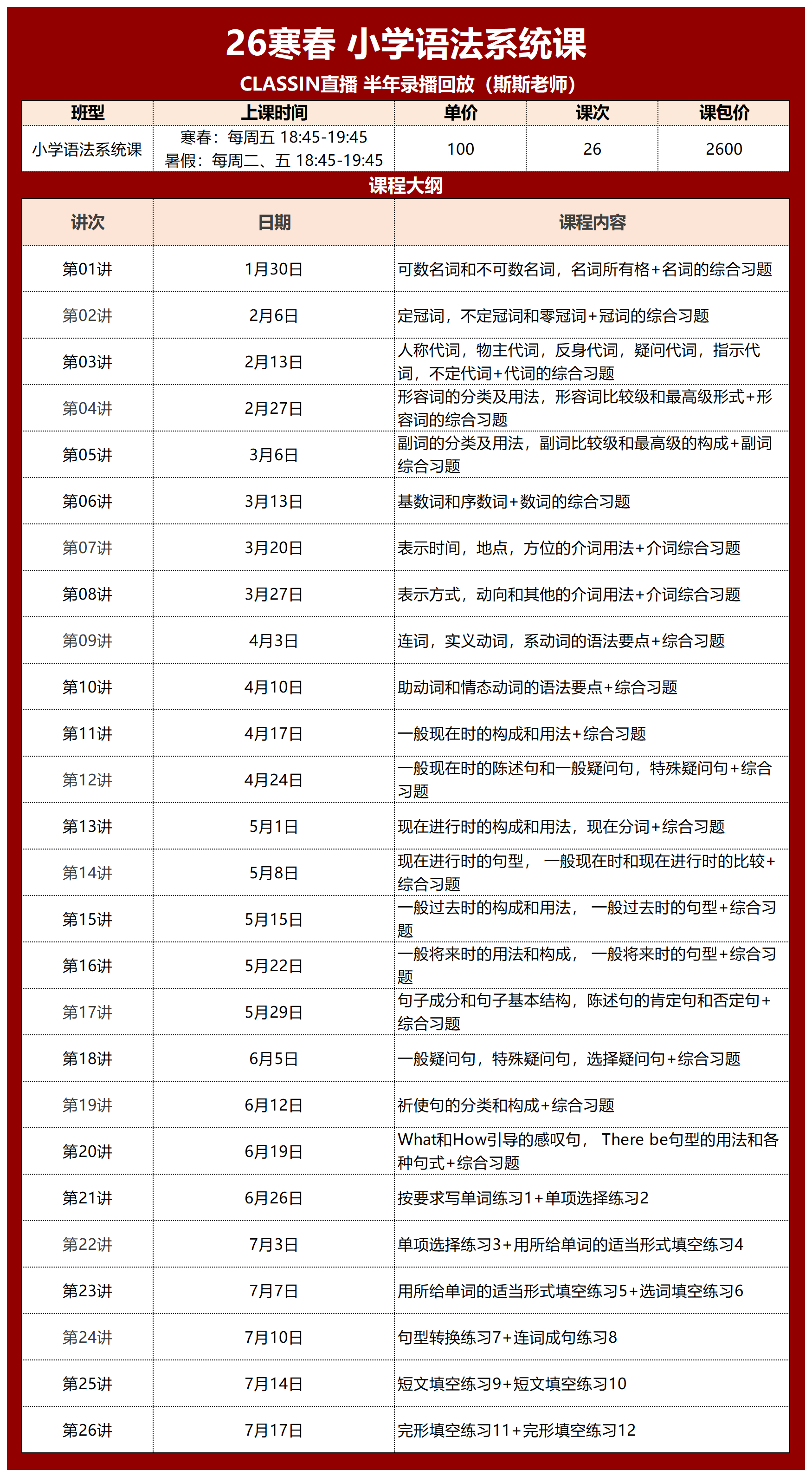 一共26讲 100元/60分钟/讲,课包2600