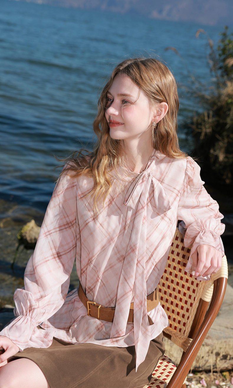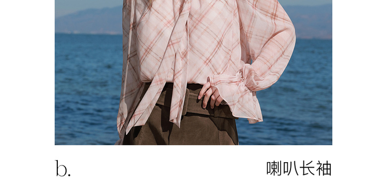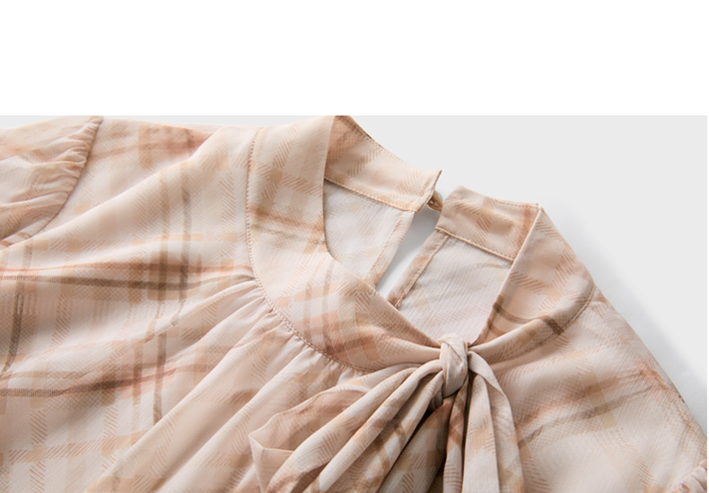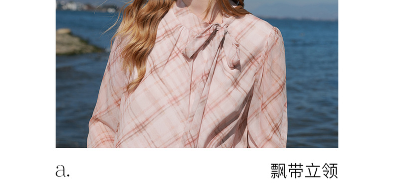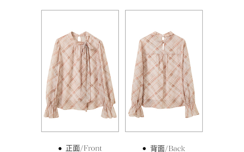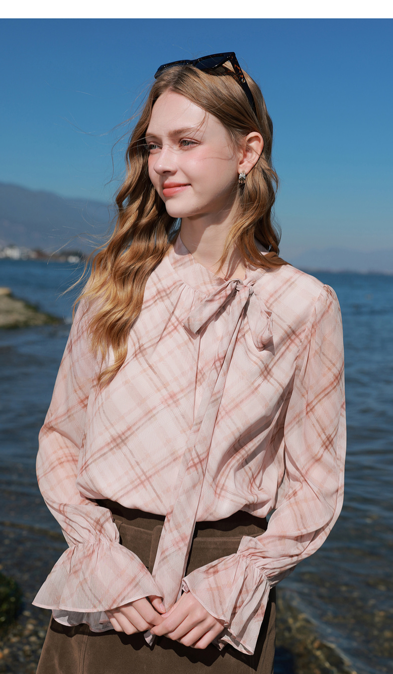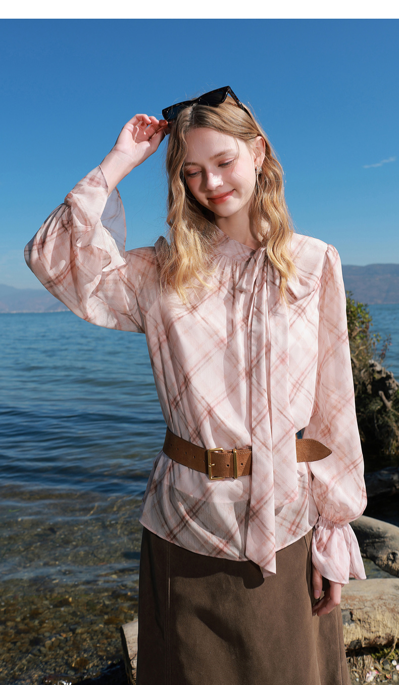 三彩2026春季新款喇叭袖飘带立领格纹小衫复古衬衣气质上衣宽松M