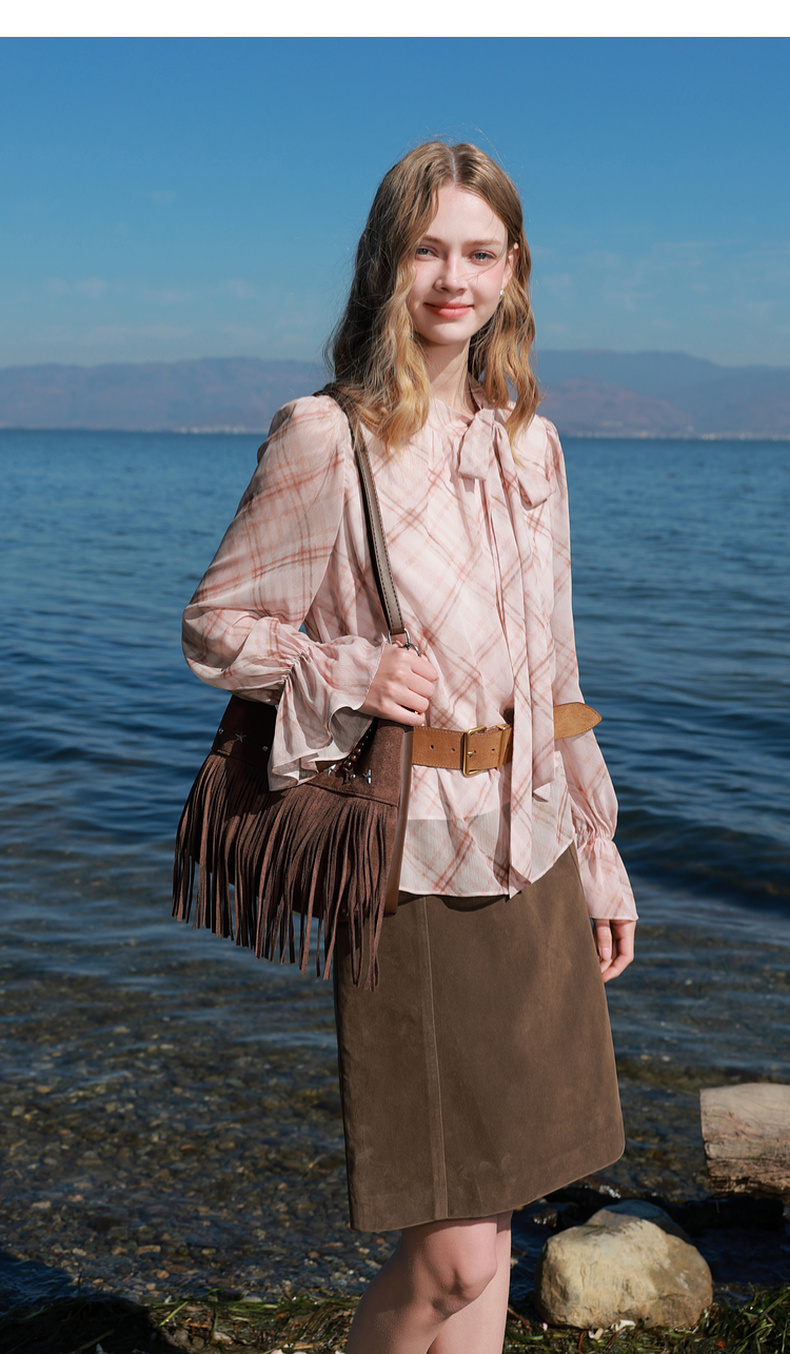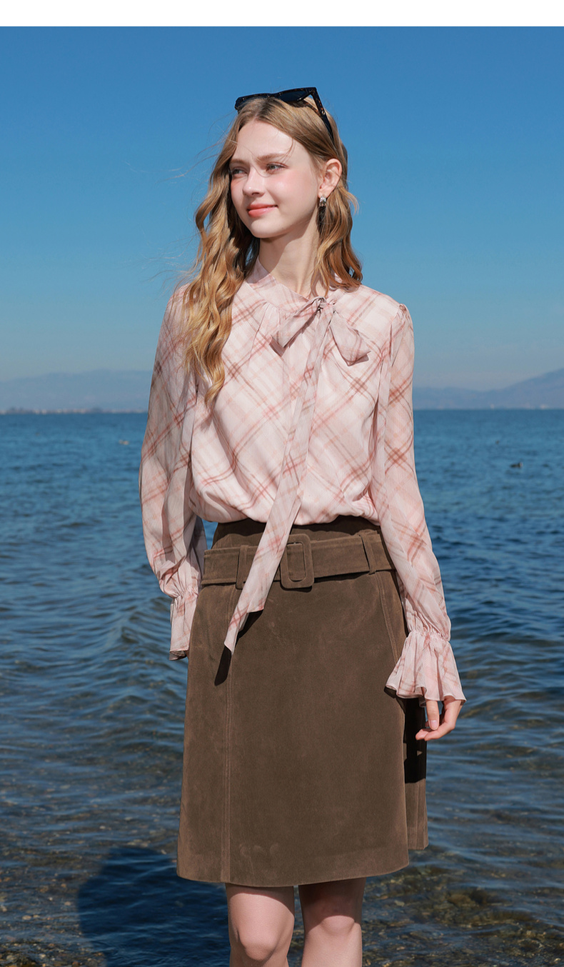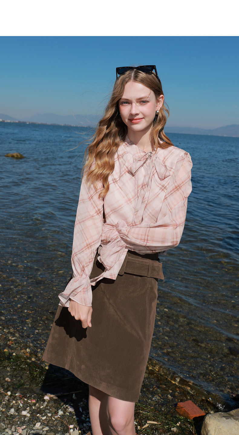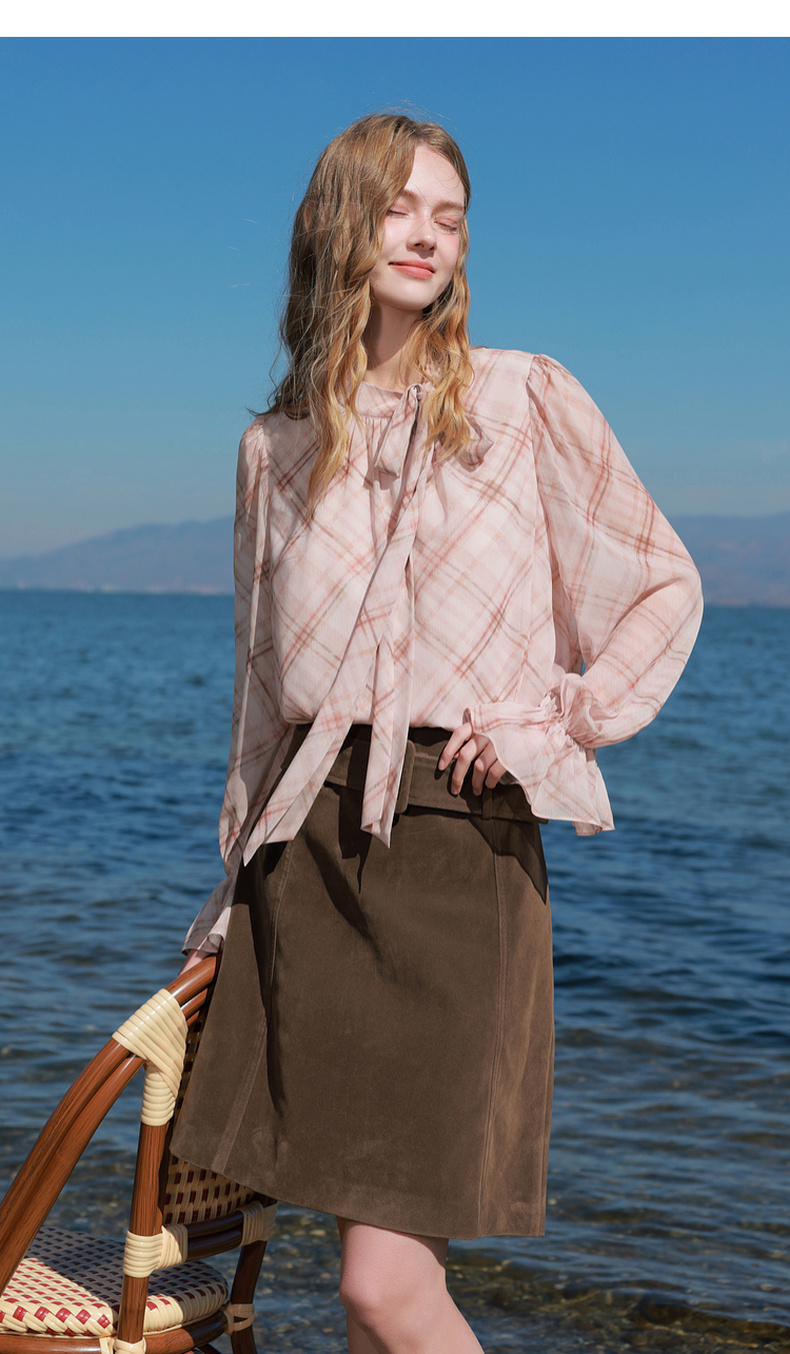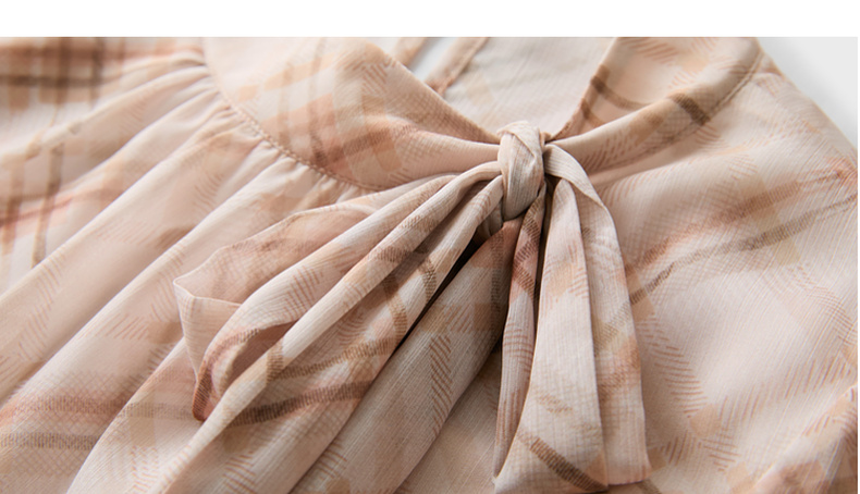 三彩2026春季新款喇叭袖飘带立领格纹小衫复古衬衣气质上衣宽松M
