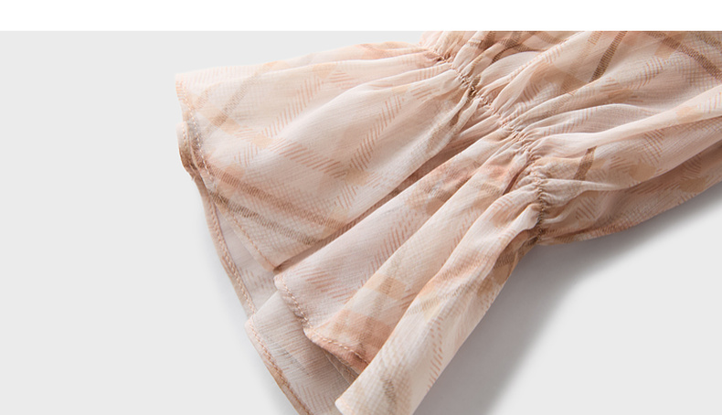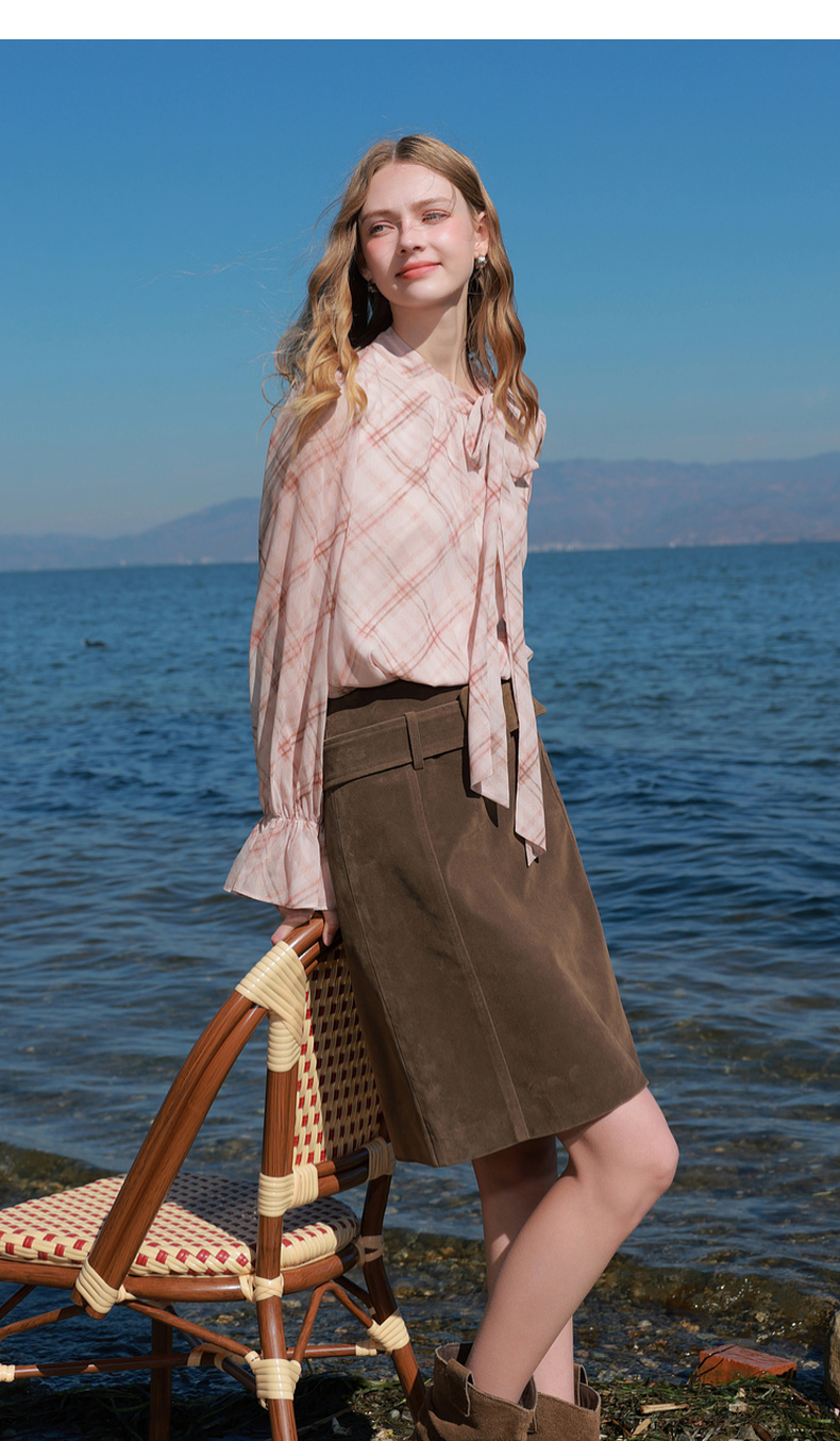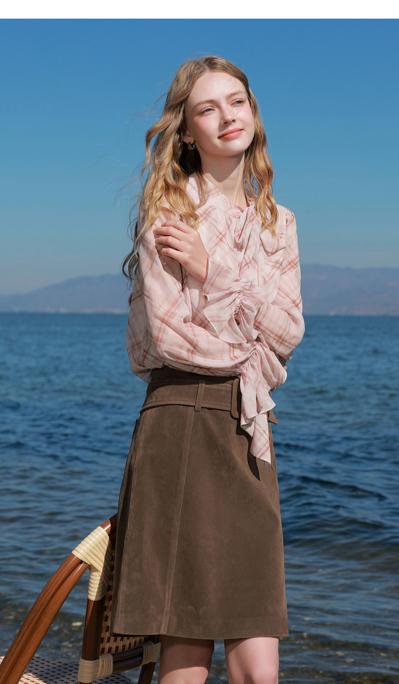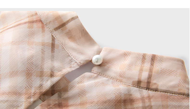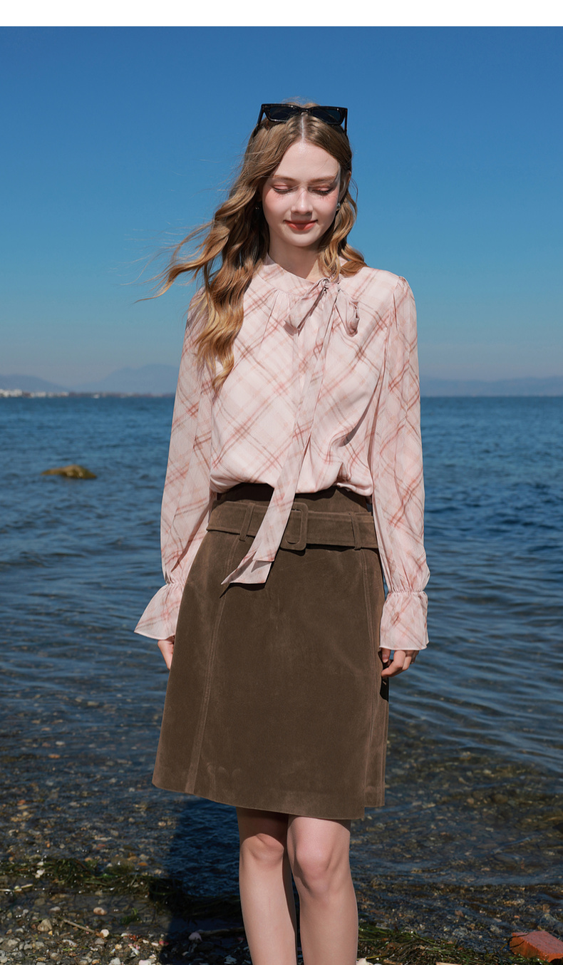 三彩2026春季新款喇叭袖飘带立领格纹小衫复古衬衣气质上衣宽松M