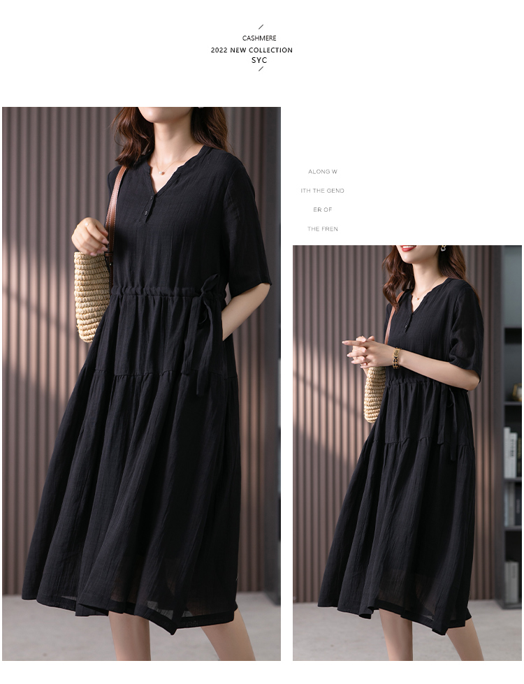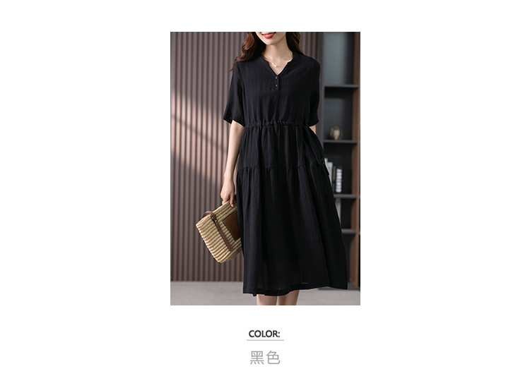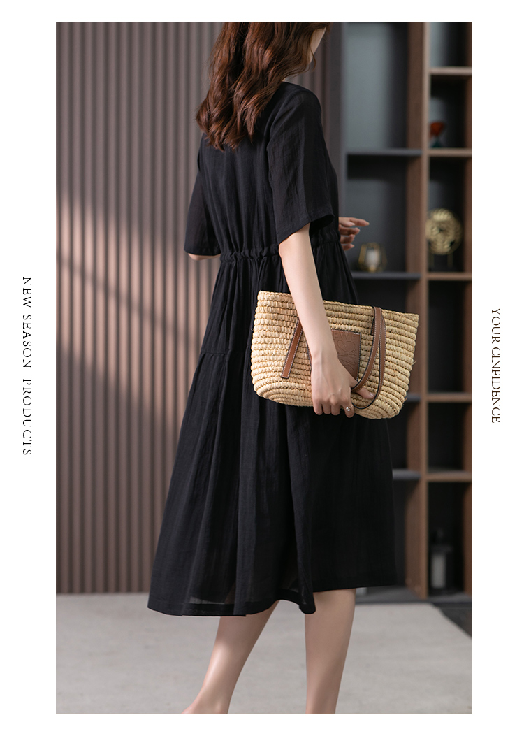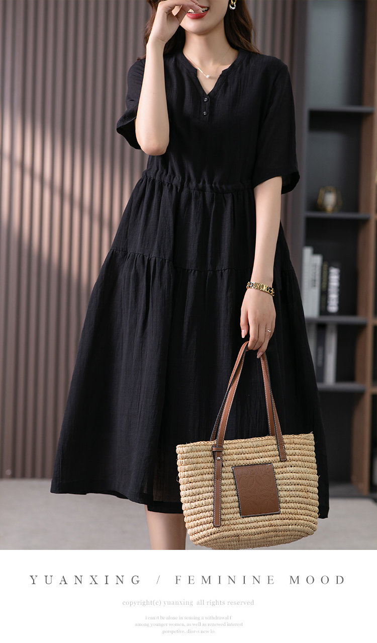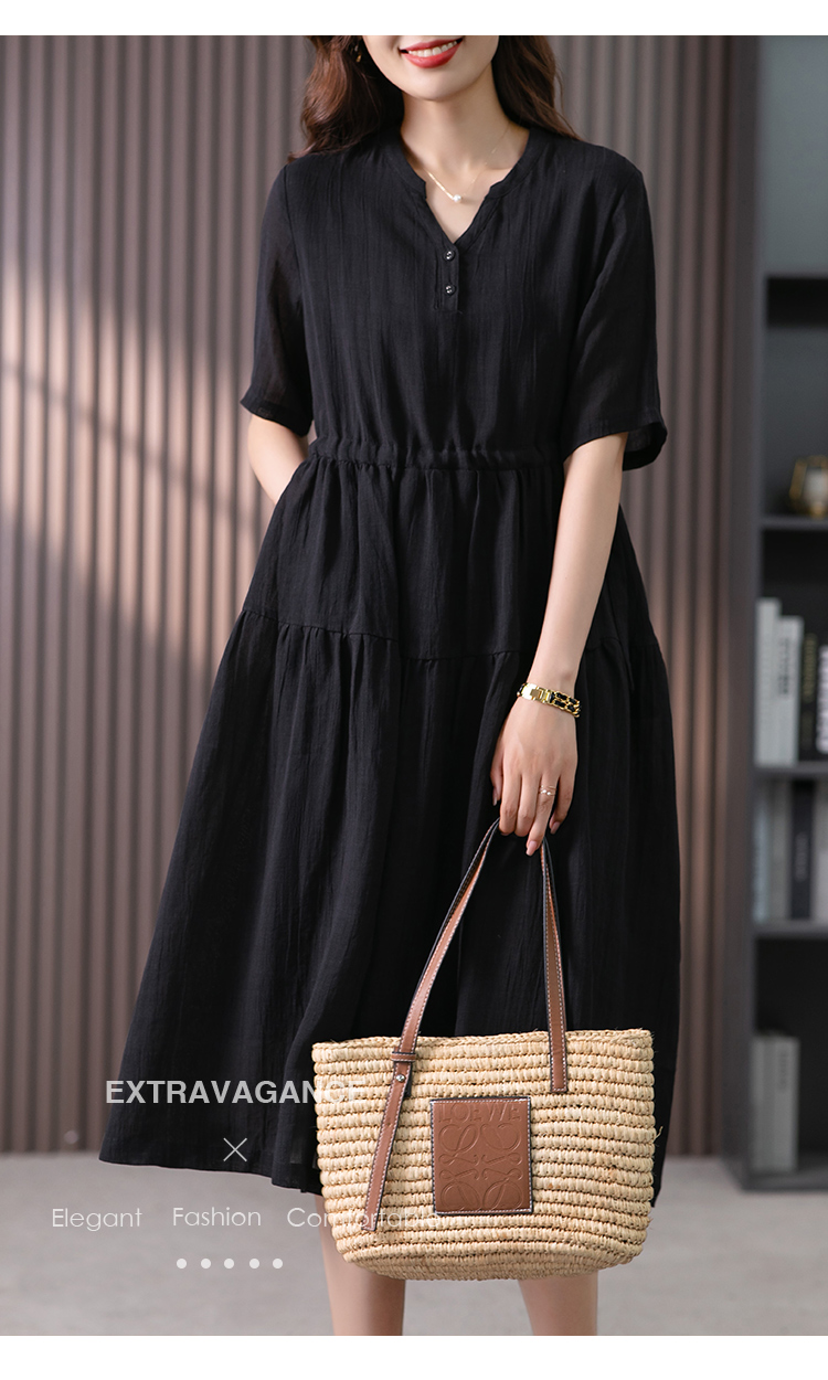 85856原形设计感苎麻V领连衣裙女夏2024新款韩版宽松高腰长裙子高级感