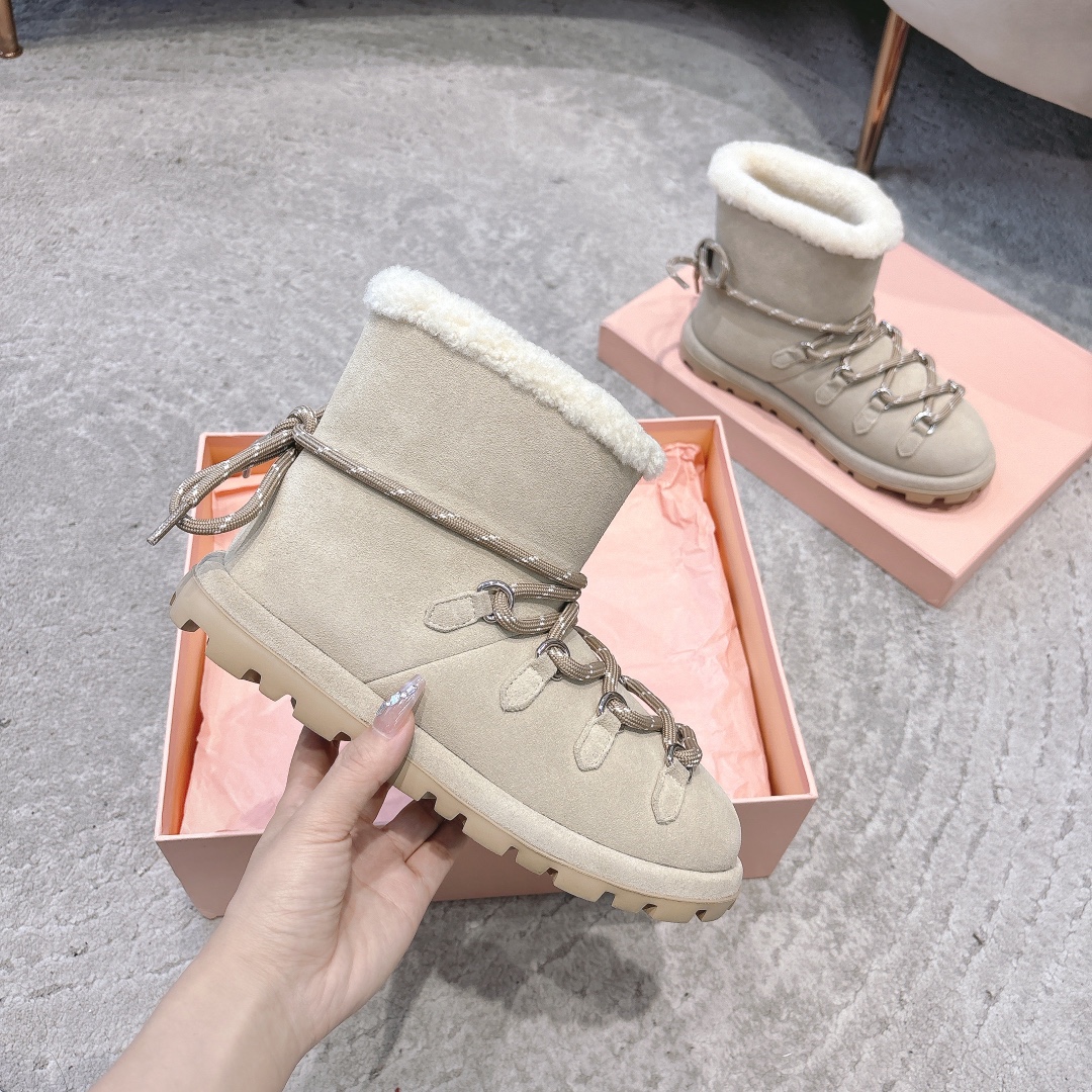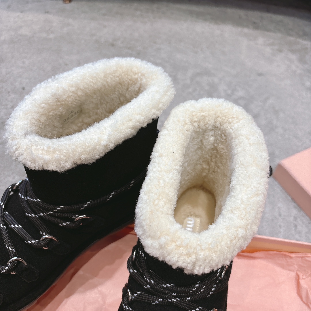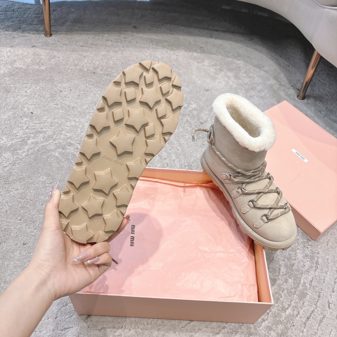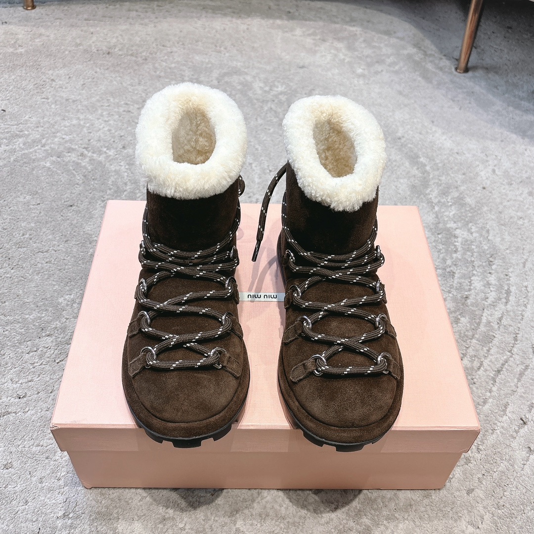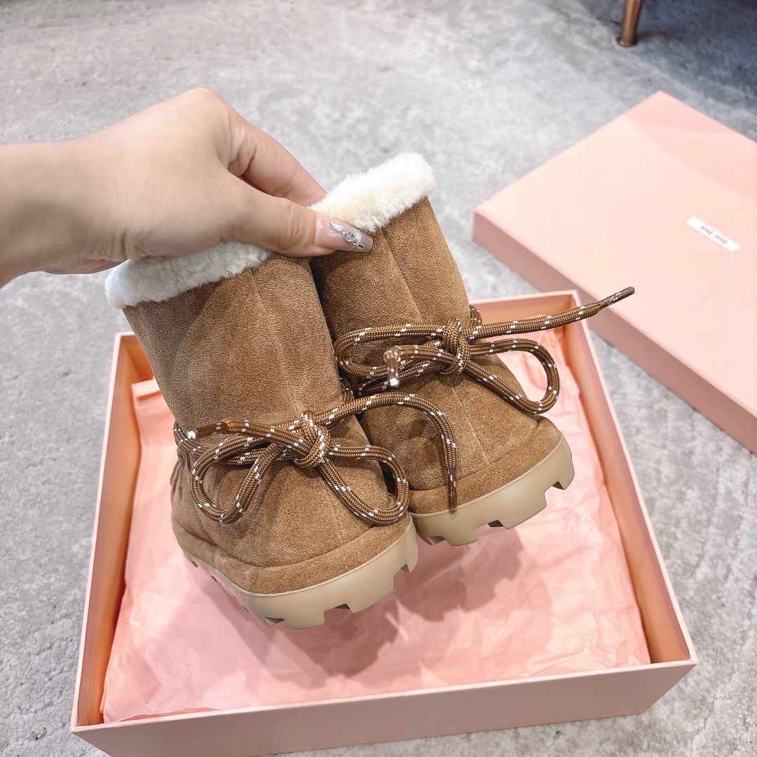 缪缪2024ss秋冬走秀款 绑带羊毛小短靴雪地靴毛毛鞋