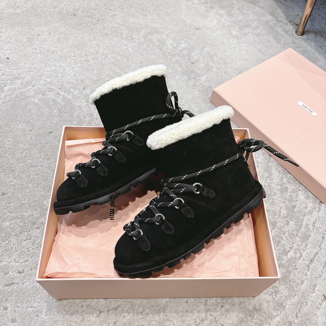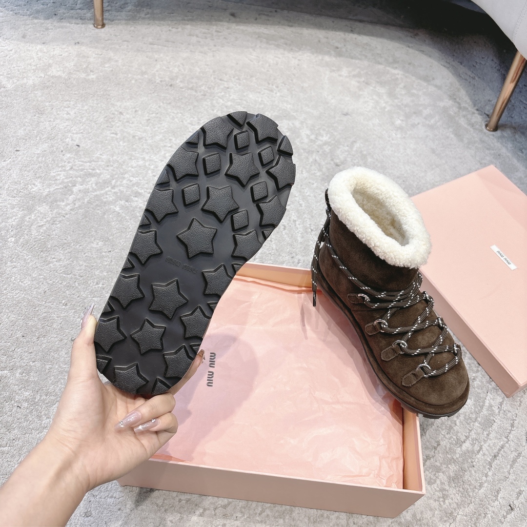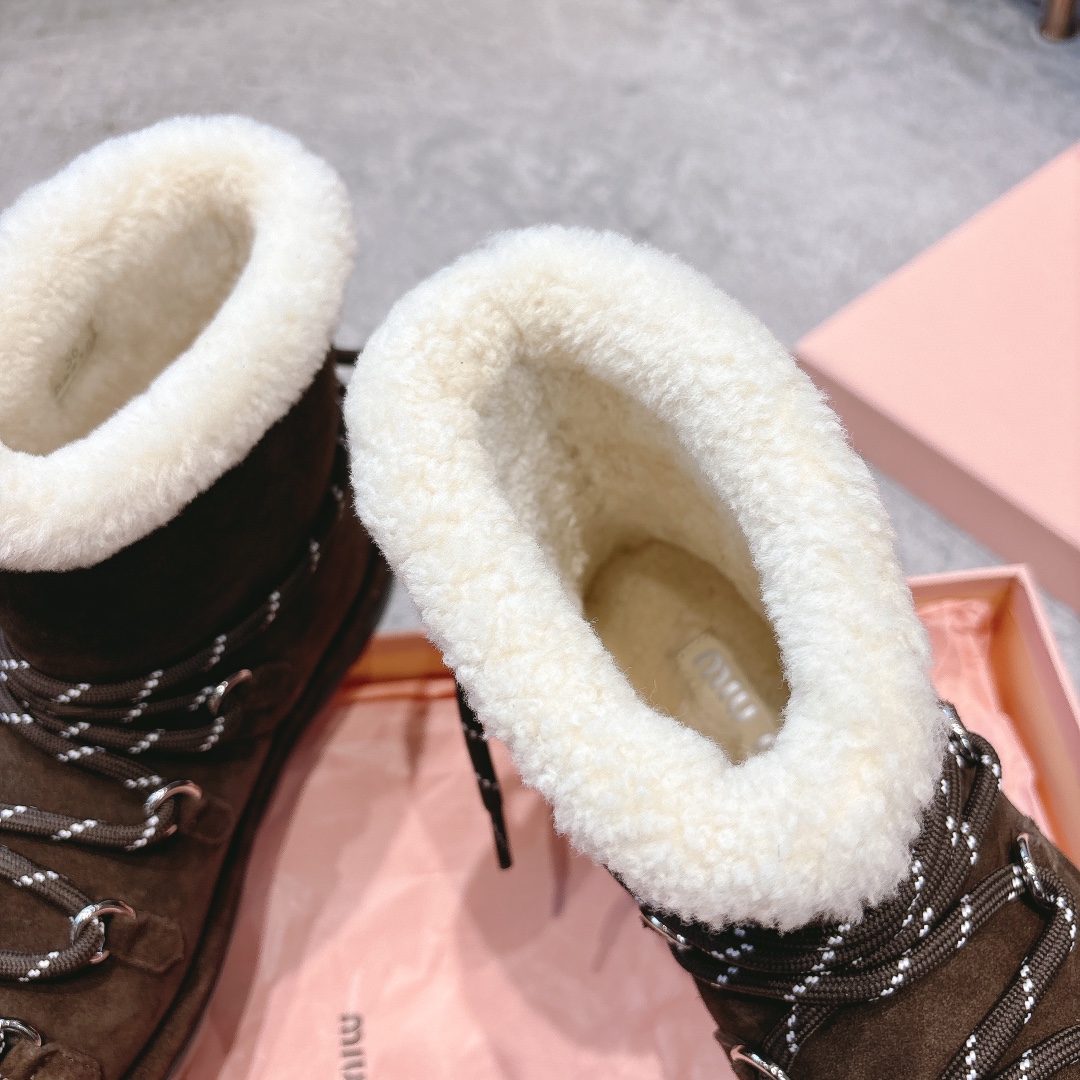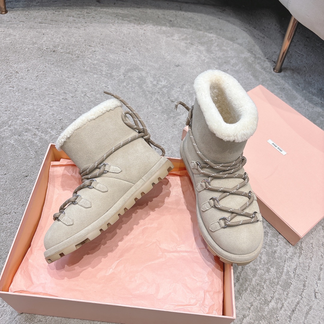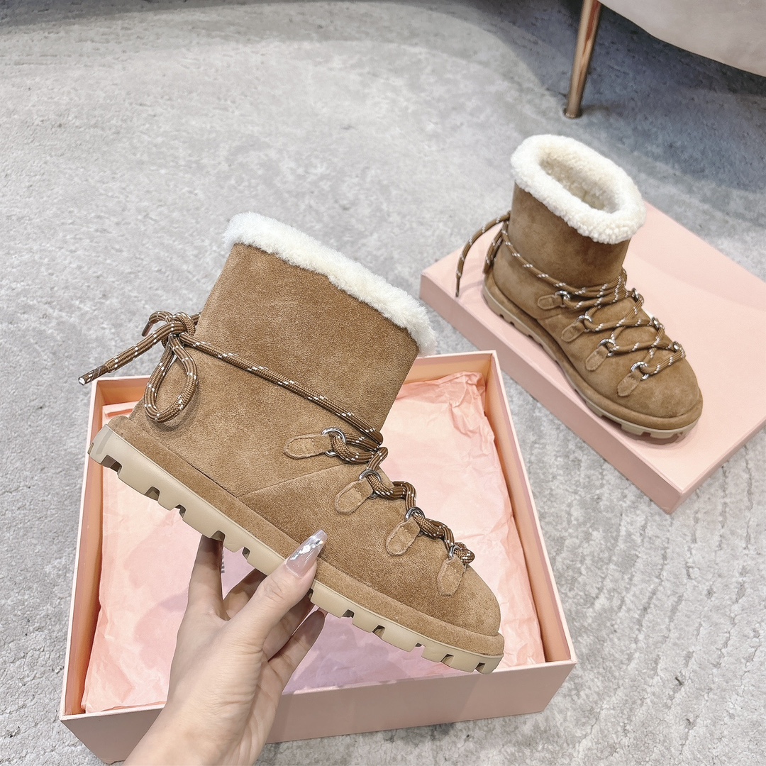 缪缪2024ss秋冬走秀款 绑带羊毛小短靴雪地靴毛毛鞋