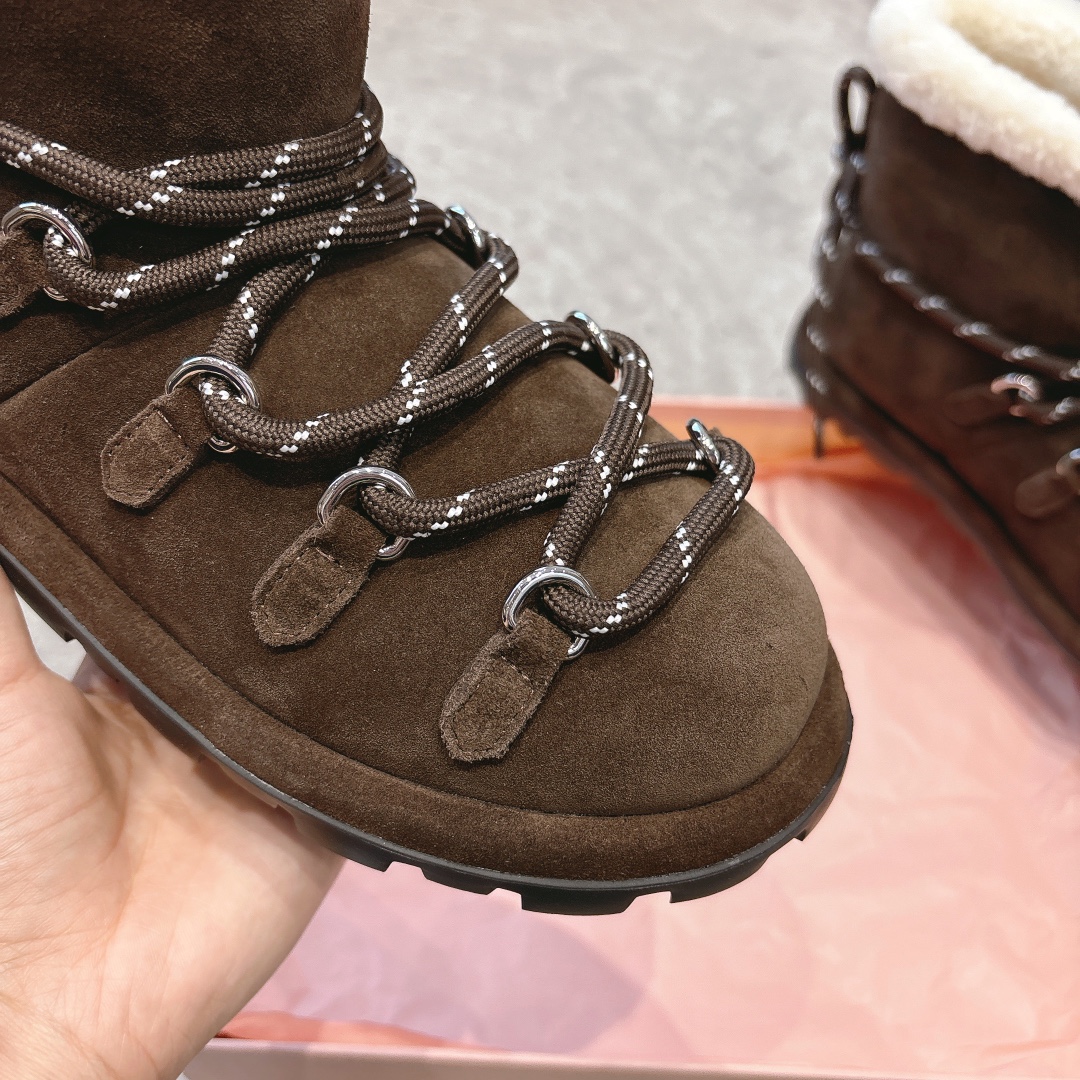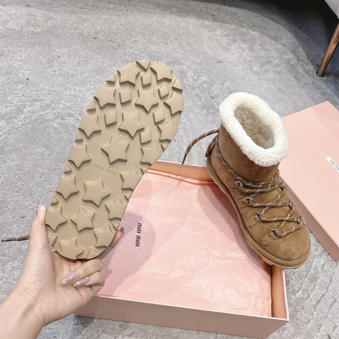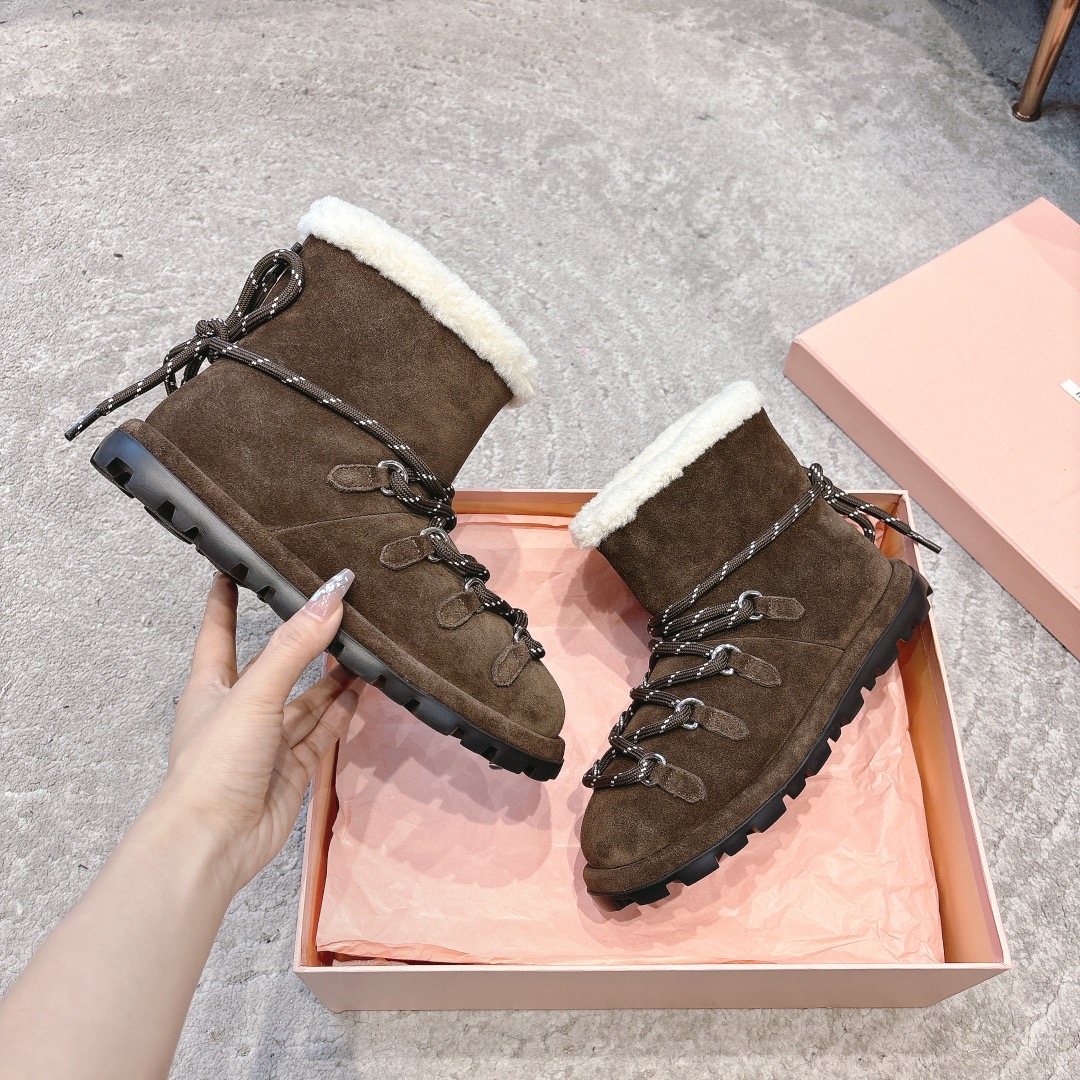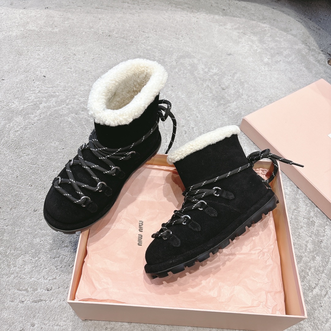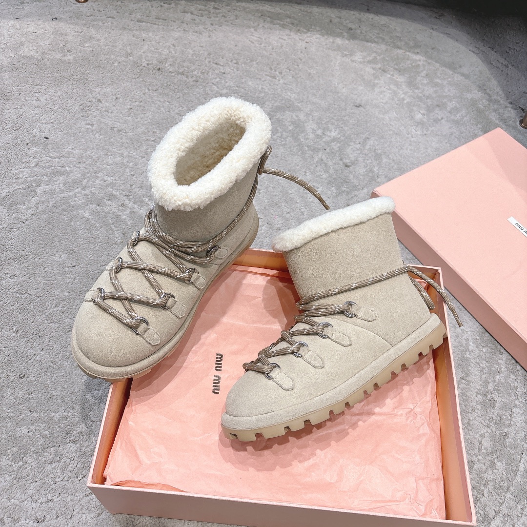 缪缪2024ss秋冬走秀款 绑带羊毛小短靴雪地靴毛毛鞋