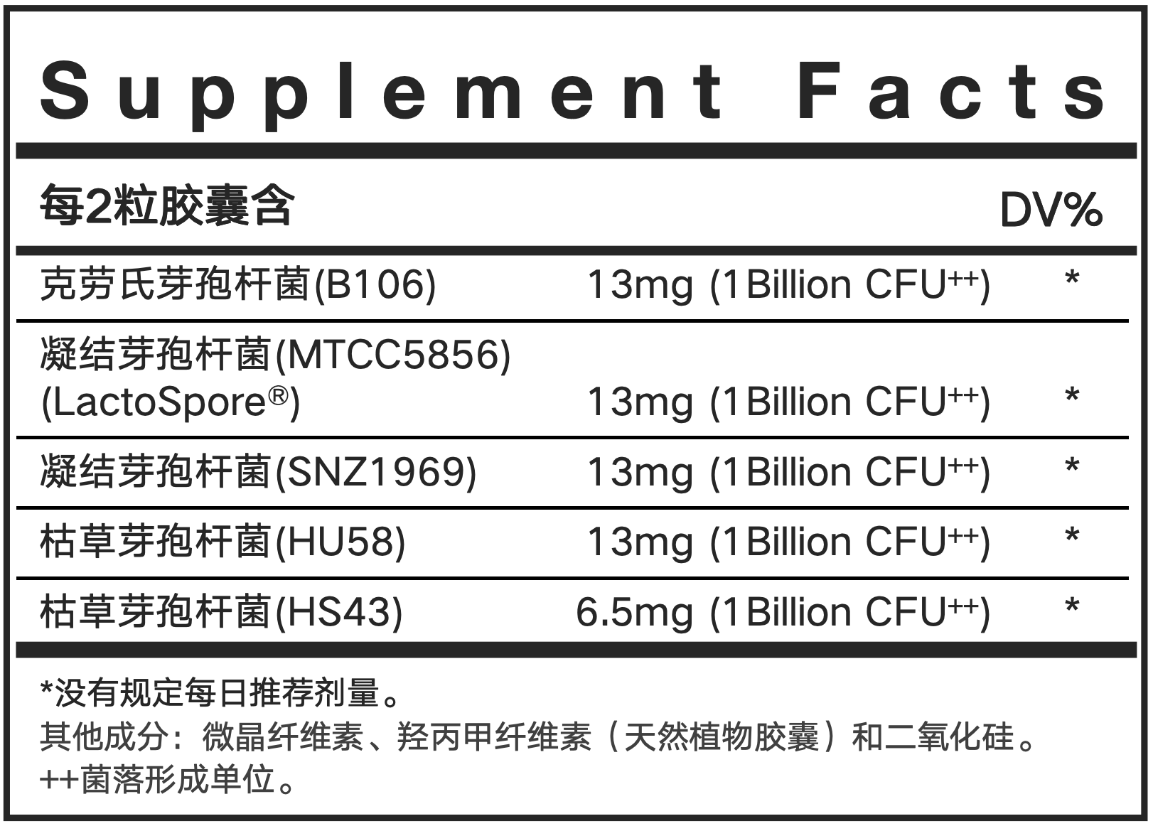 每2粒胶囊提供50亿孢子型益生菌。孢子益生菌拥有“坚固的”芽孢外壳,使得它们可以穿过恶劣的胃肠环境抵达肠道。