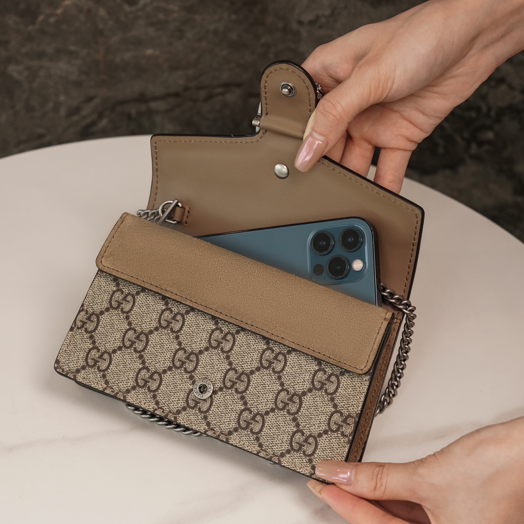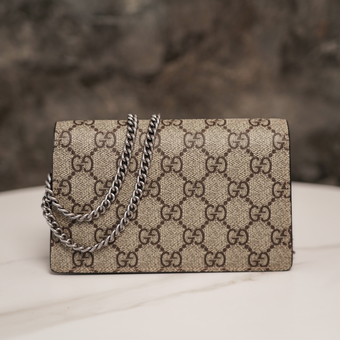 颇具结构感的GG Supreme帆布链条超迷你手袋,配有钥匙扣,可以用于将此袋绑缚在另外更大的手袋上。封口配以织纹双虎头搭扣 — 此细节灵感来源于希腊神狄俄尼索斯(Dionysus系列),神话中,他曾骑在宙斯(Zeus)派来的老虎身上,越过底格里斯河(Tigris)。