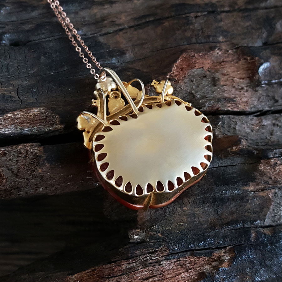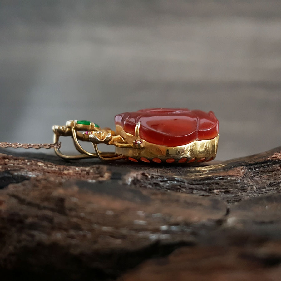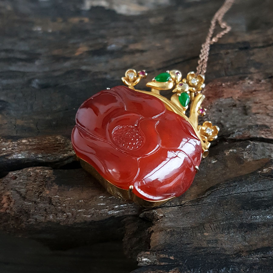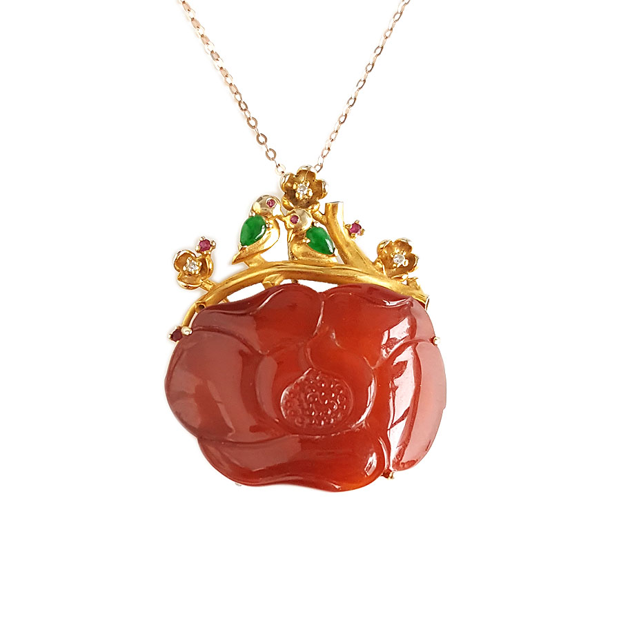 名称 | AU750精品黄金镶钻镶天然细腻花朵造型冰种红翡吊坠项链 |