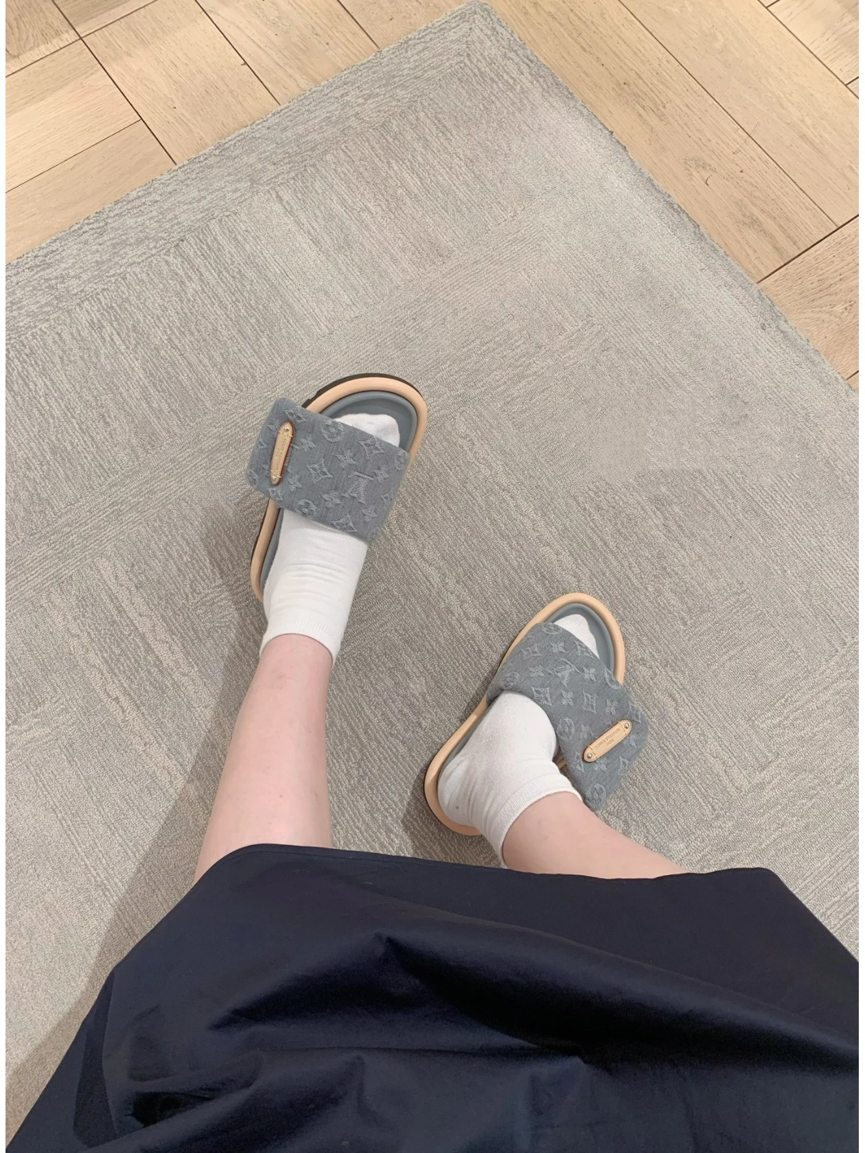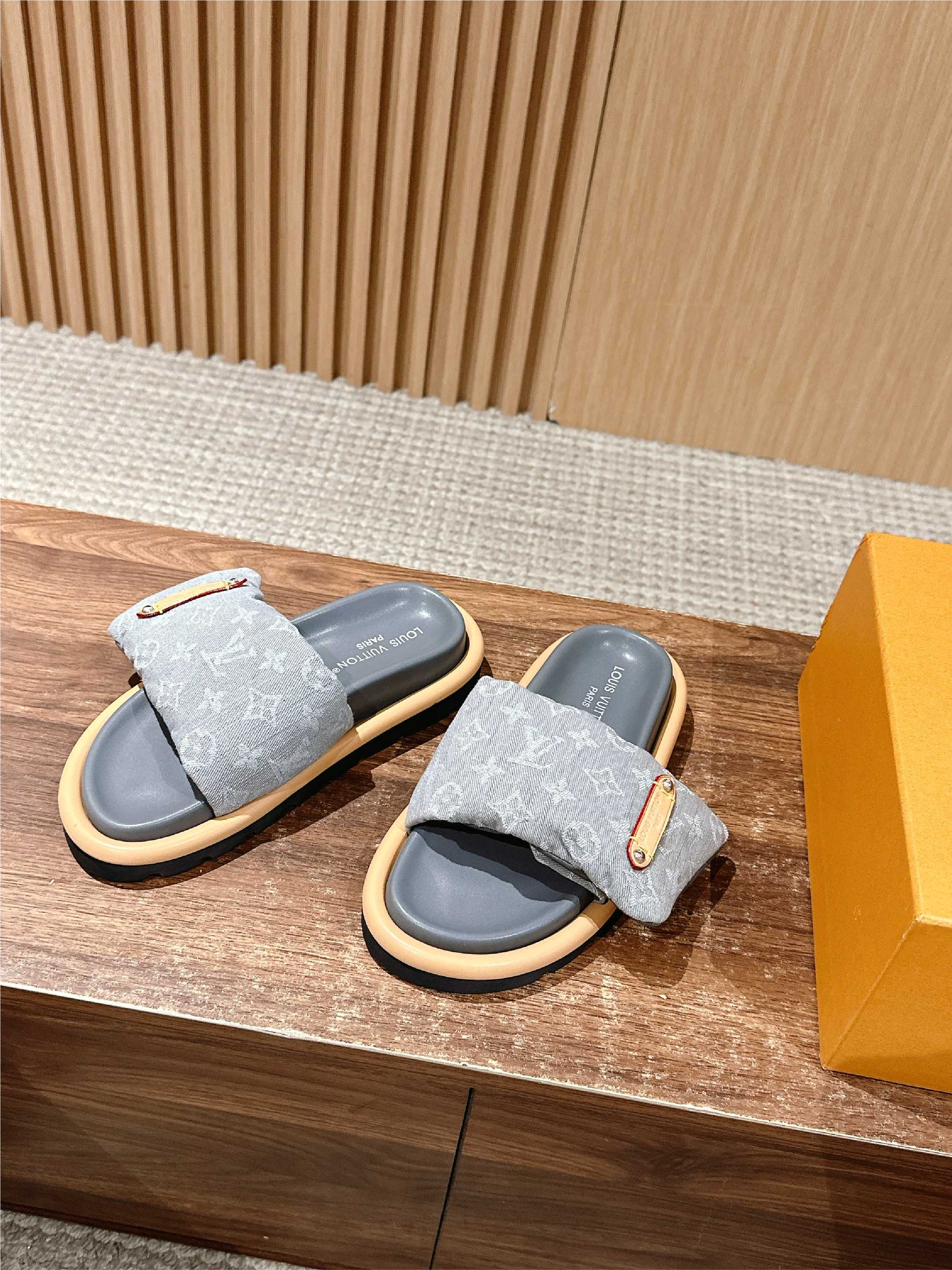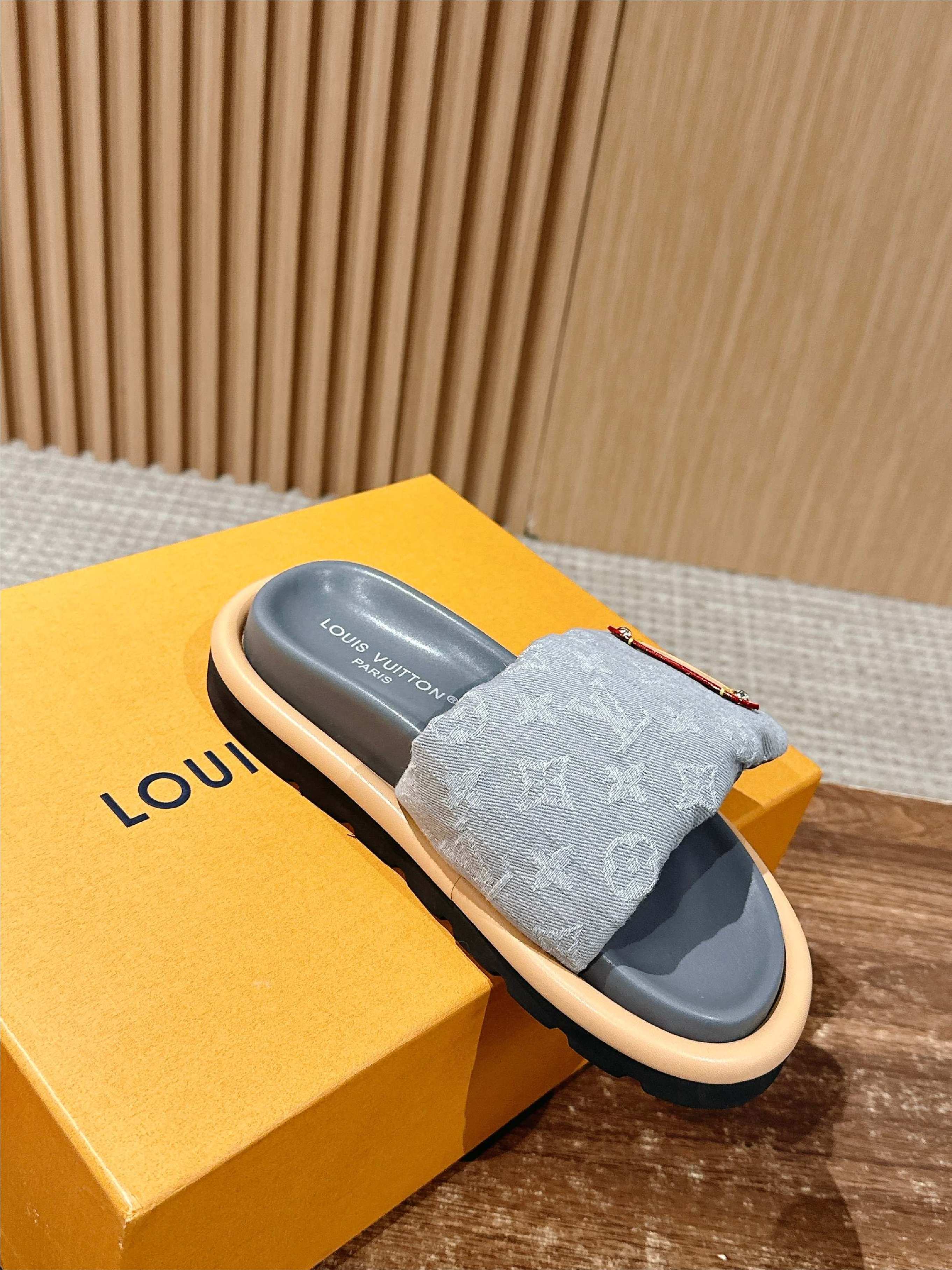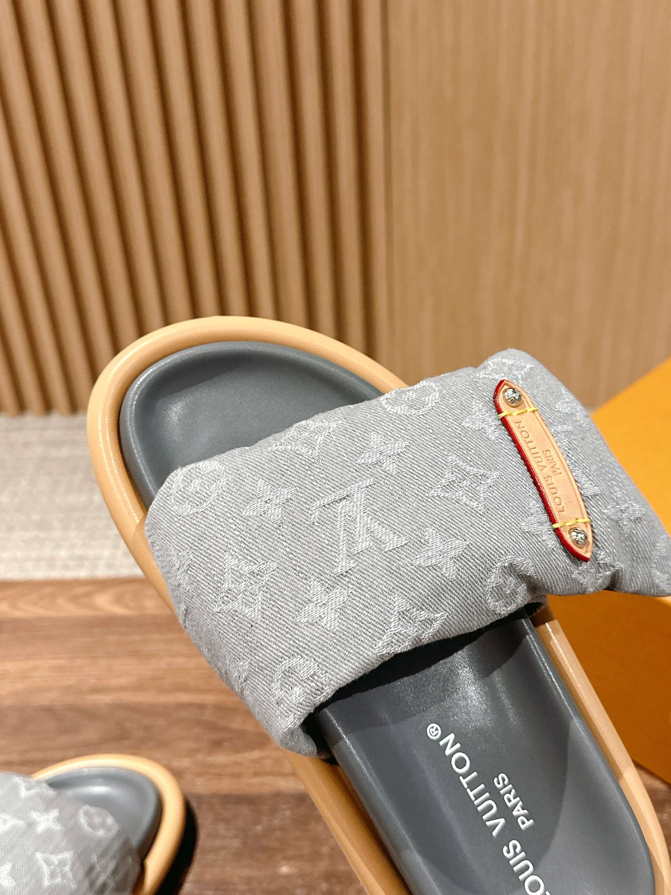 驴家LV Pool Pillow Comfort牛仔布圆头平底 穆勒鞋面包拖一字拖鞋 (HC)