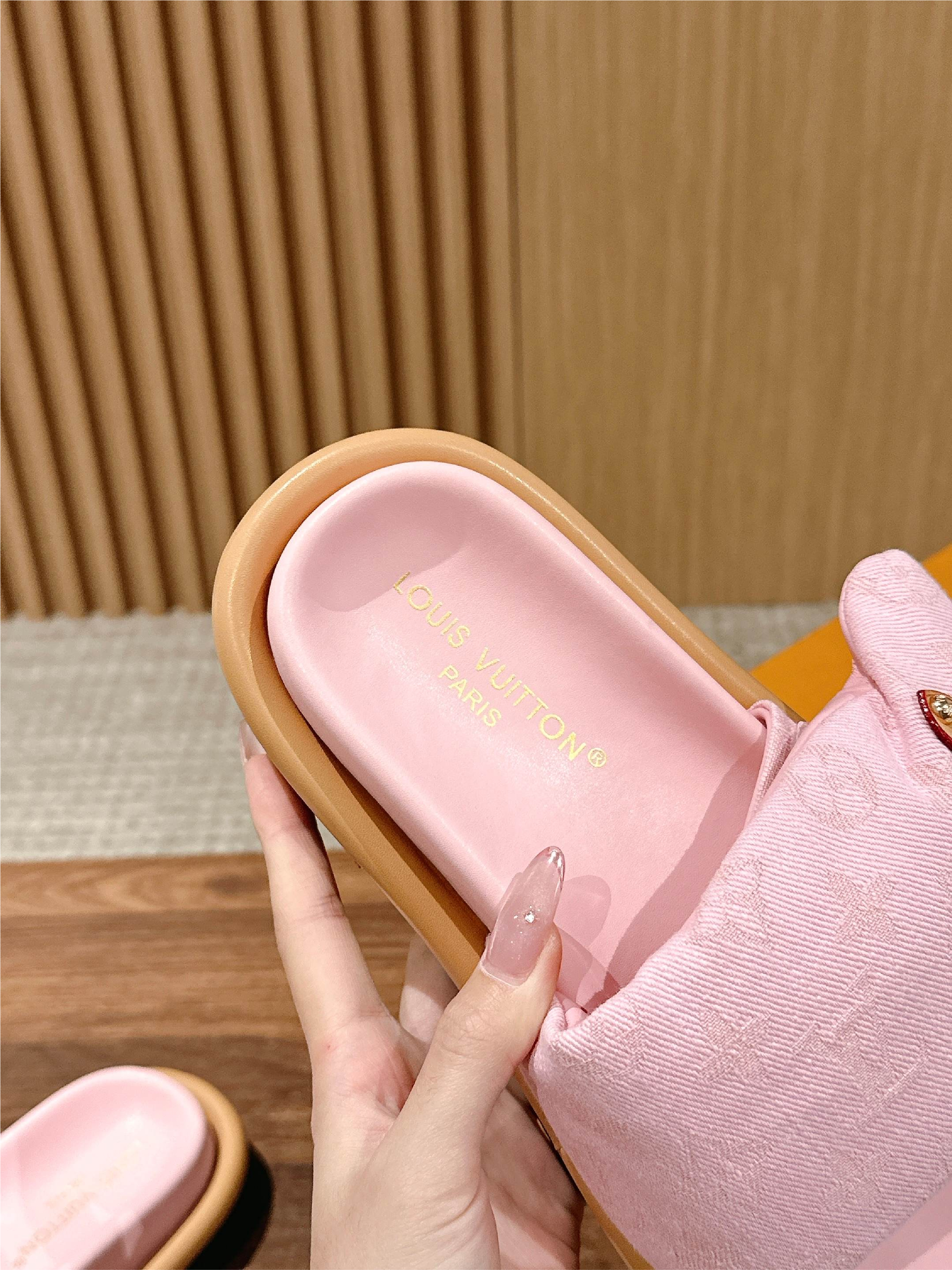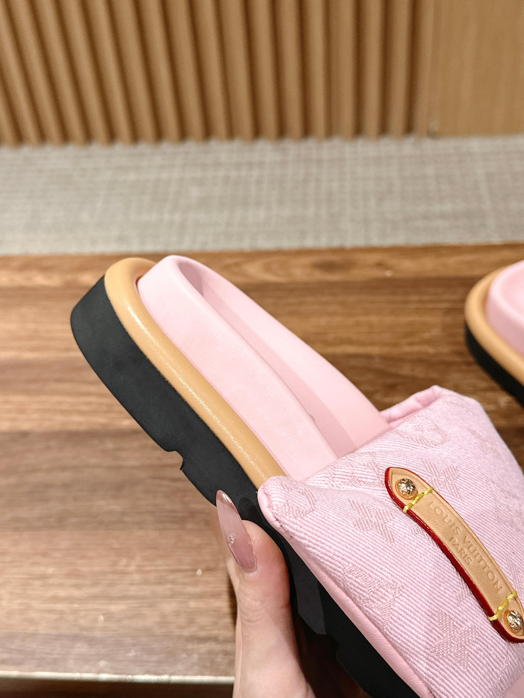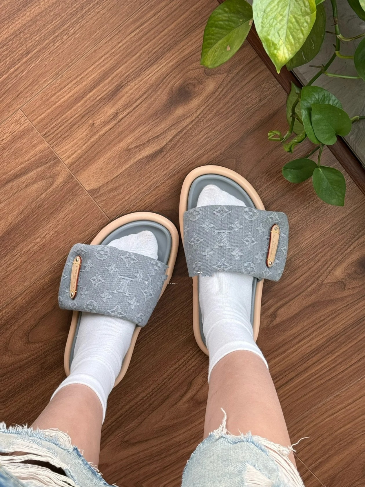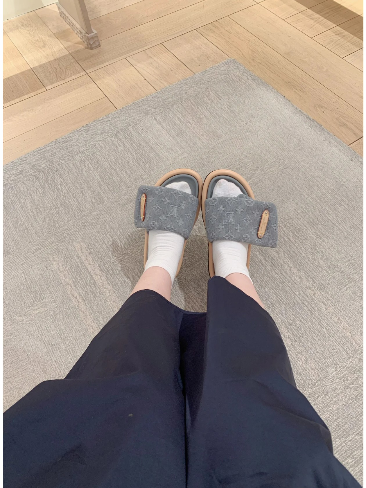 驴家LV Pool Pillow Comfort牛仔布圆头平底 穆勒鞋面包拖一字拖鞋 (HC)