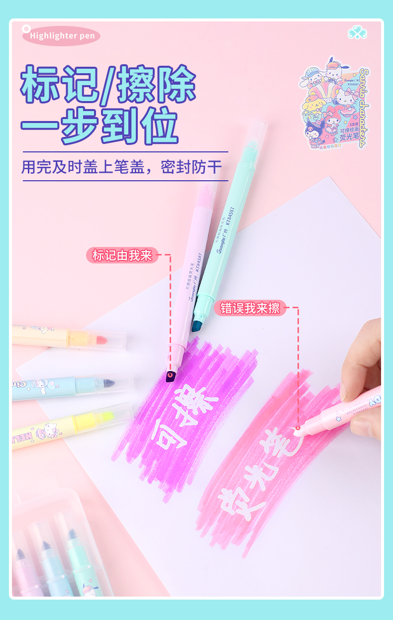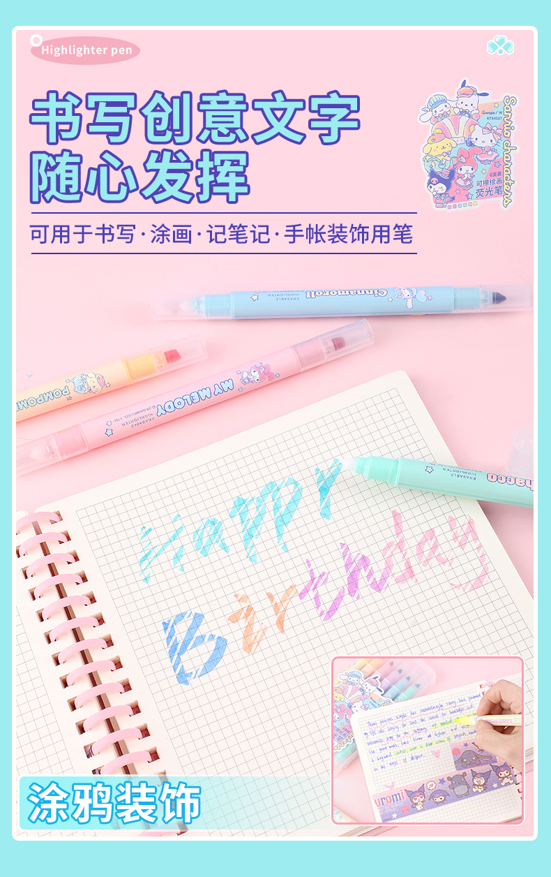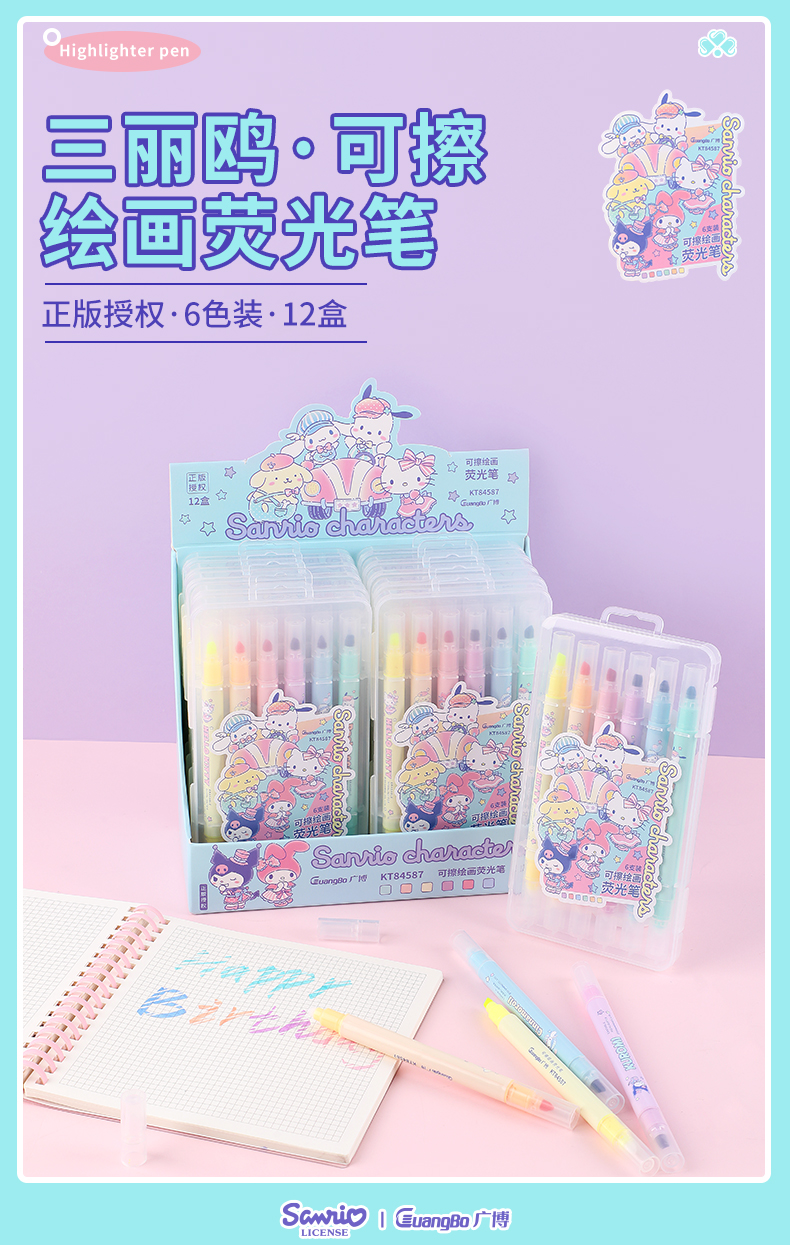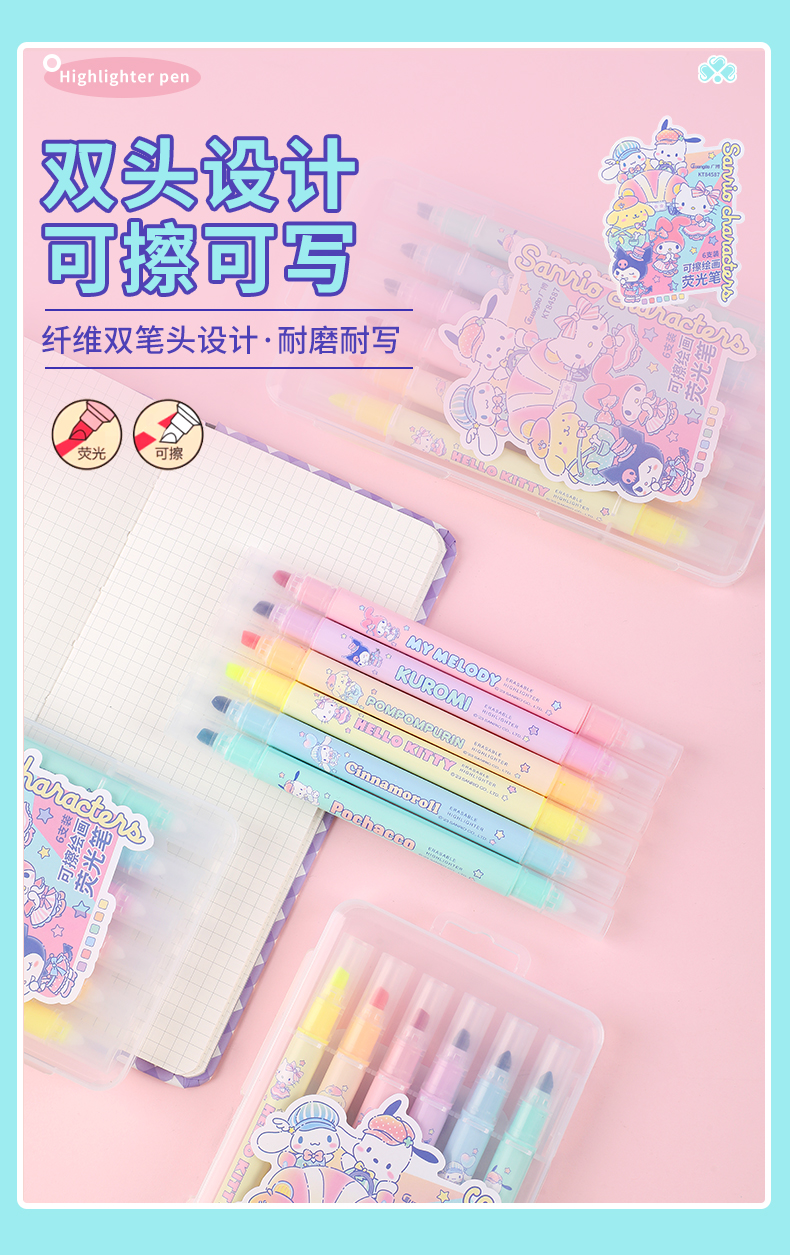 广博三丽鸥系列开学季文具正版授权可擦荧光笔6支装