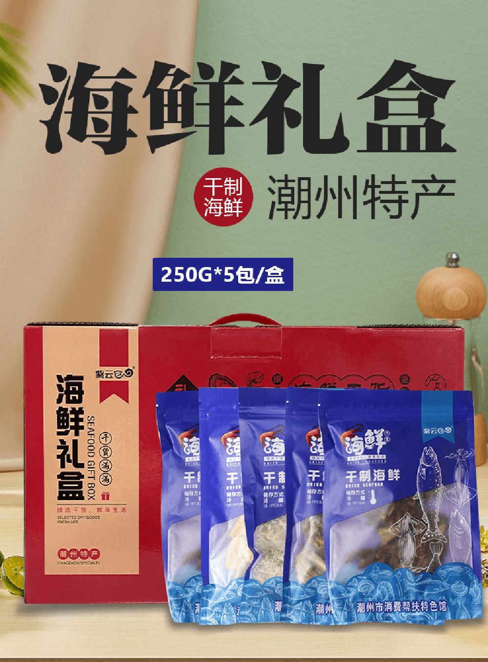 广东潮州紫云仓海鮮干货礼盒(鱿鱼丝、酥黄鱼、酥带鱼、红娘鱼、秀才鳗各250g)1.25KG/盒