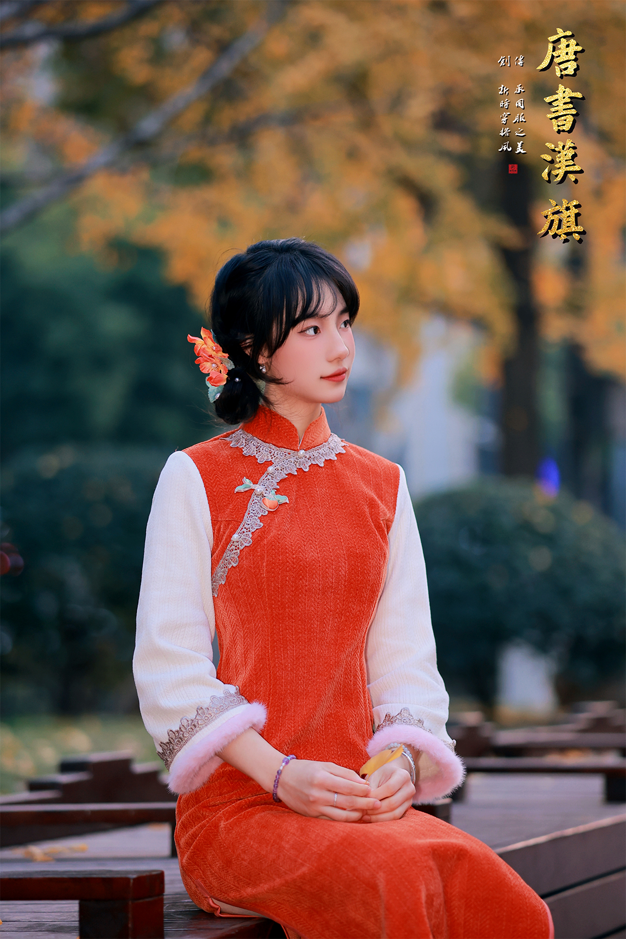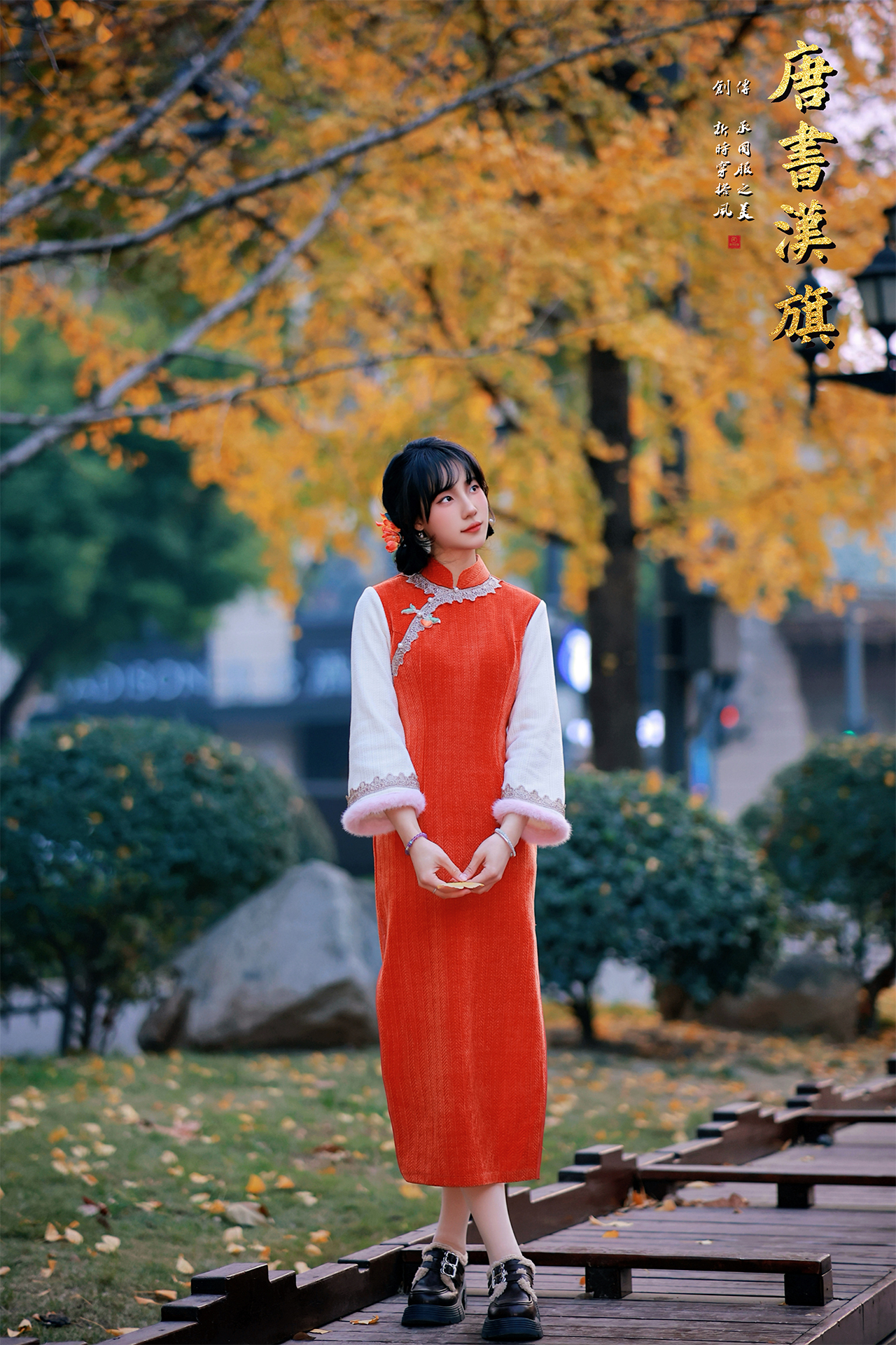 【橙韵玲珑】调橘红针织面料搭配米白长袖,领口与袖口缀蕾丝、毛绒装饰,中式斜襟配精致盘扣,融合传统旗袍韵味与秋冬保暖质感,银杏季穿搭氛围感拉满,日常与国风场景皆适配