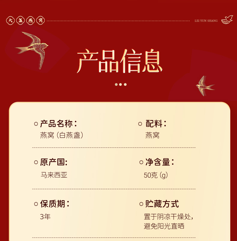 雷允上马来西亚八星白燕盏干燕窝50g/盒 100g/盒