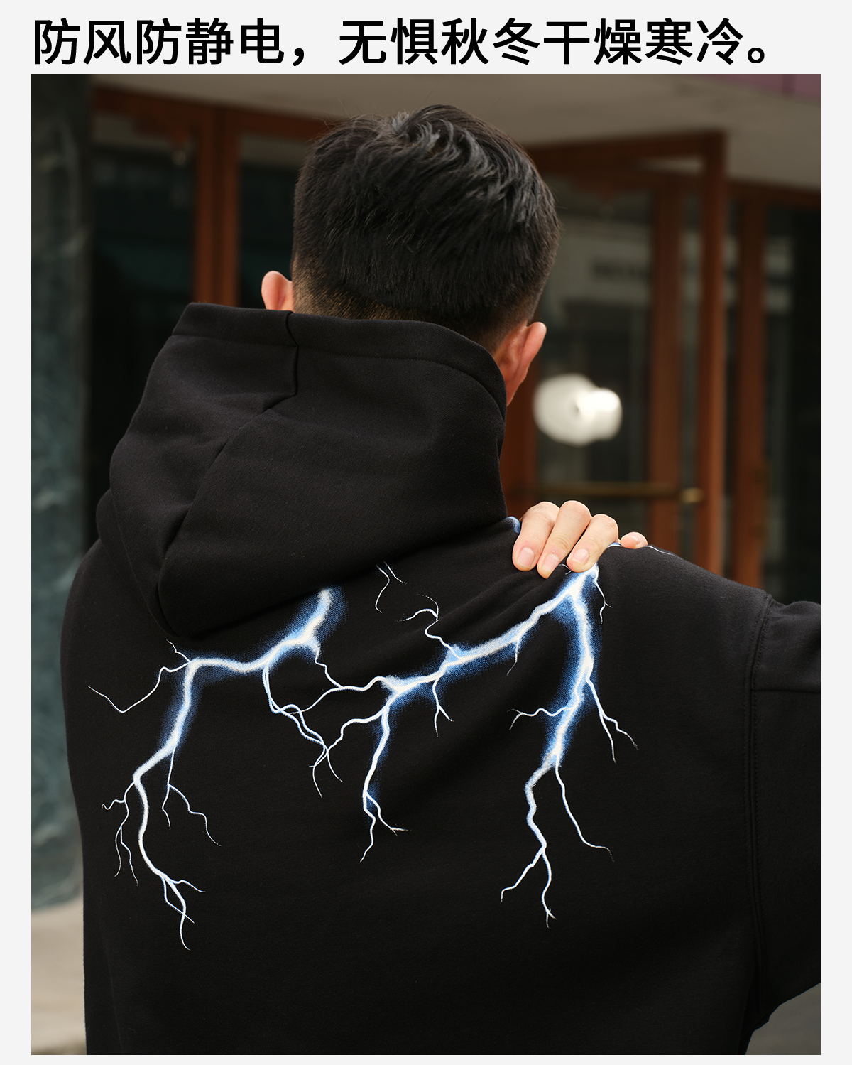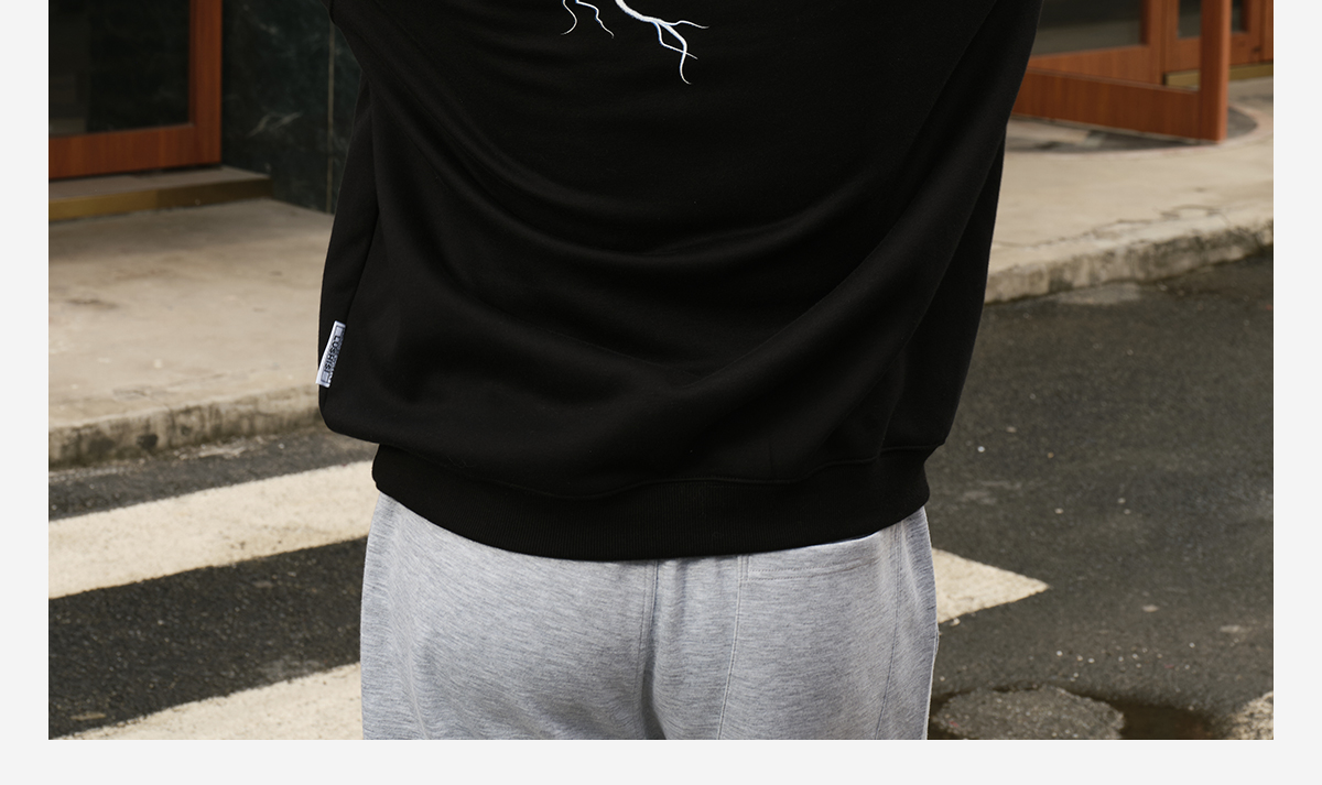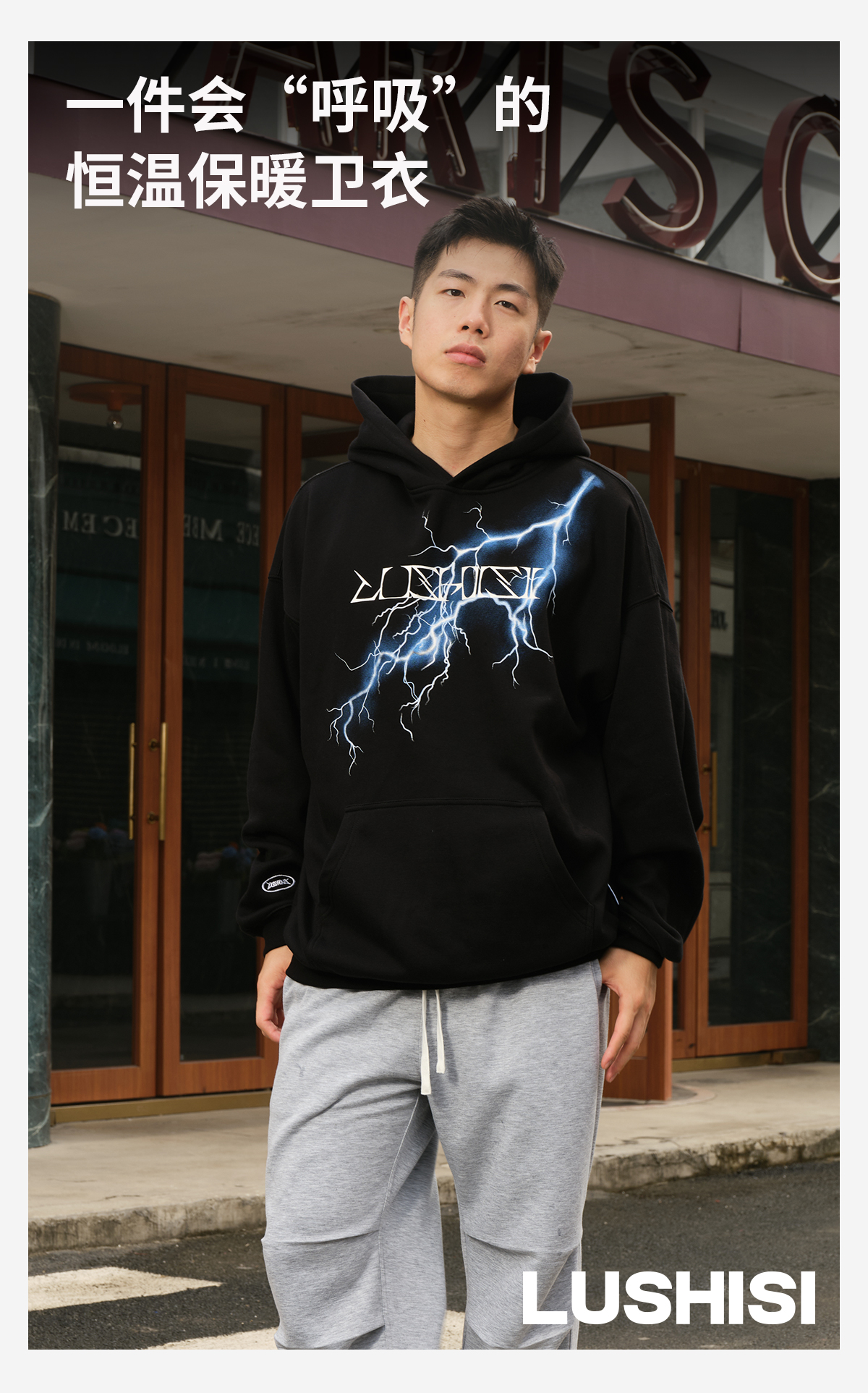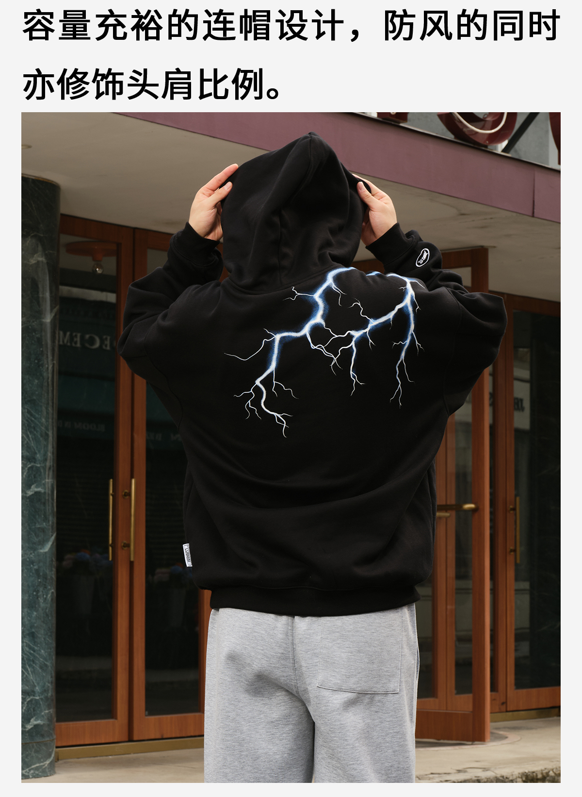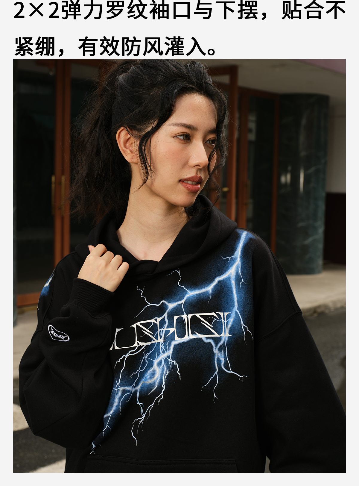 录士LUSHISI电光主题闪电抓绒恒温保暖连帽潮流宽松情侣宽松卫衣