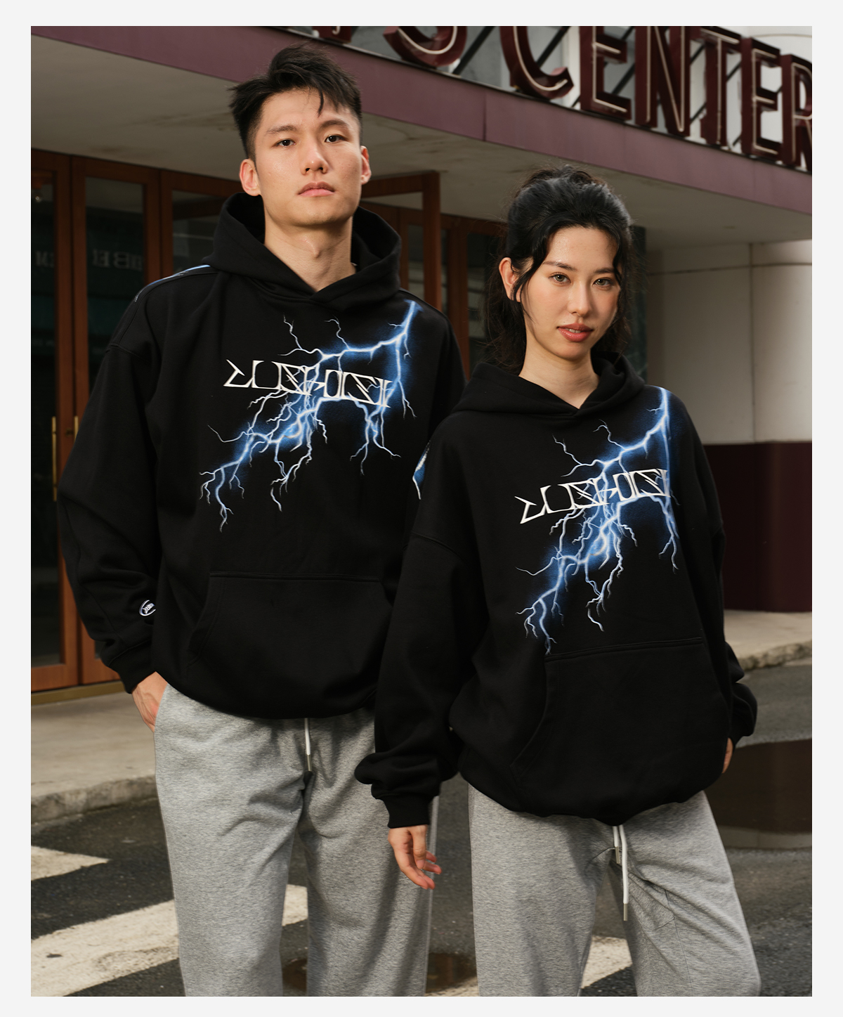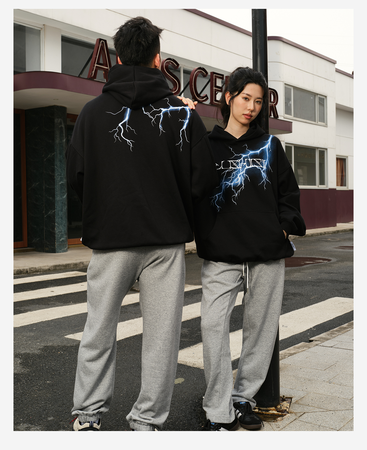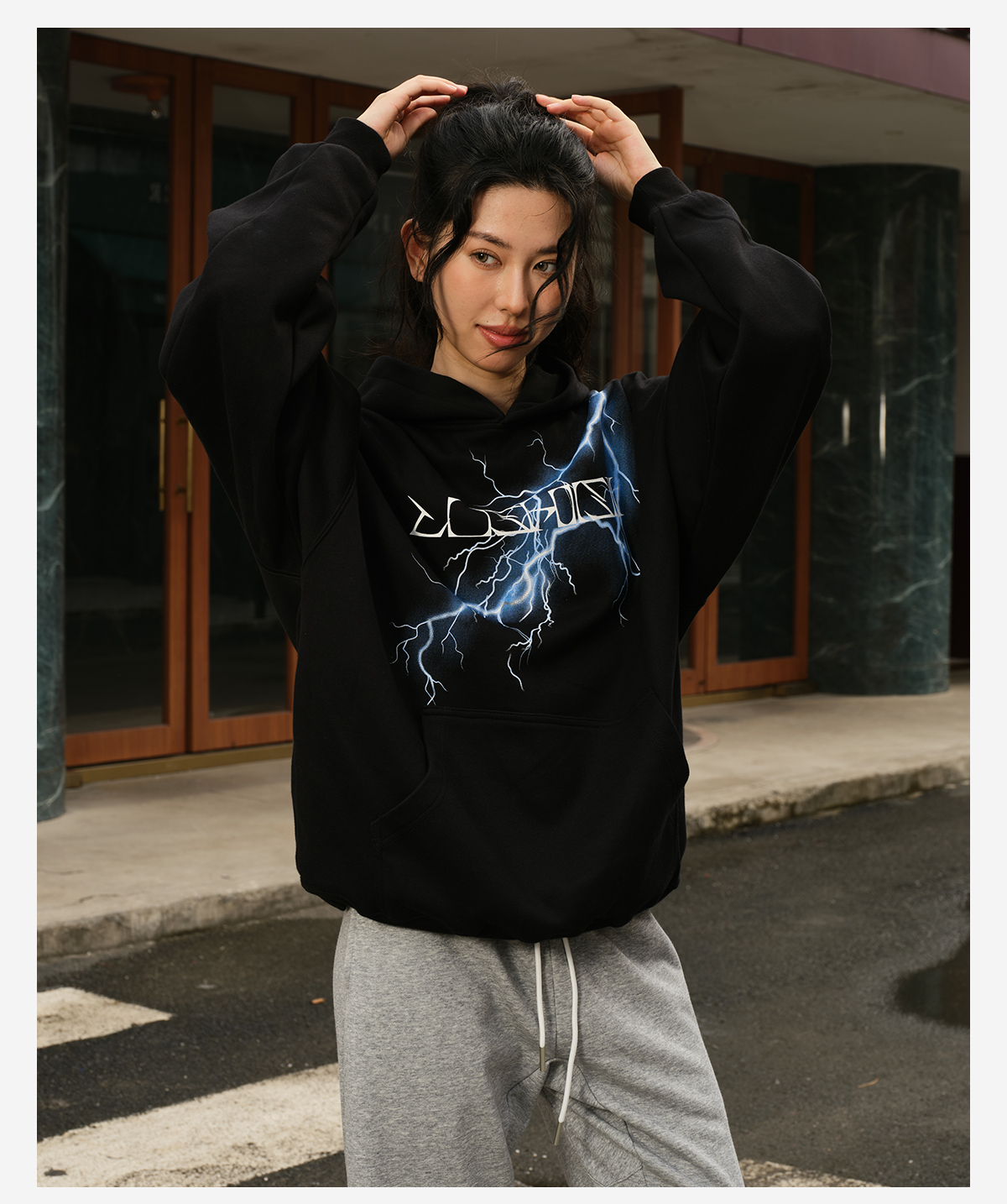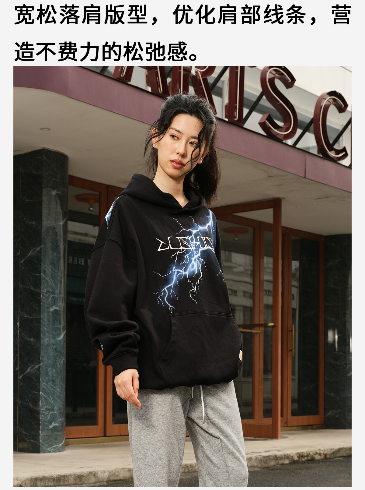 录士LUSHISI电光主题闪电抓绒恒温保暖连帽潮流宽松情侣宽松卫衣