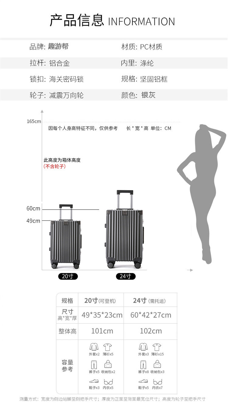 趣游帮铝框万向轮行李箱 JDY-1201 20寸 银灰