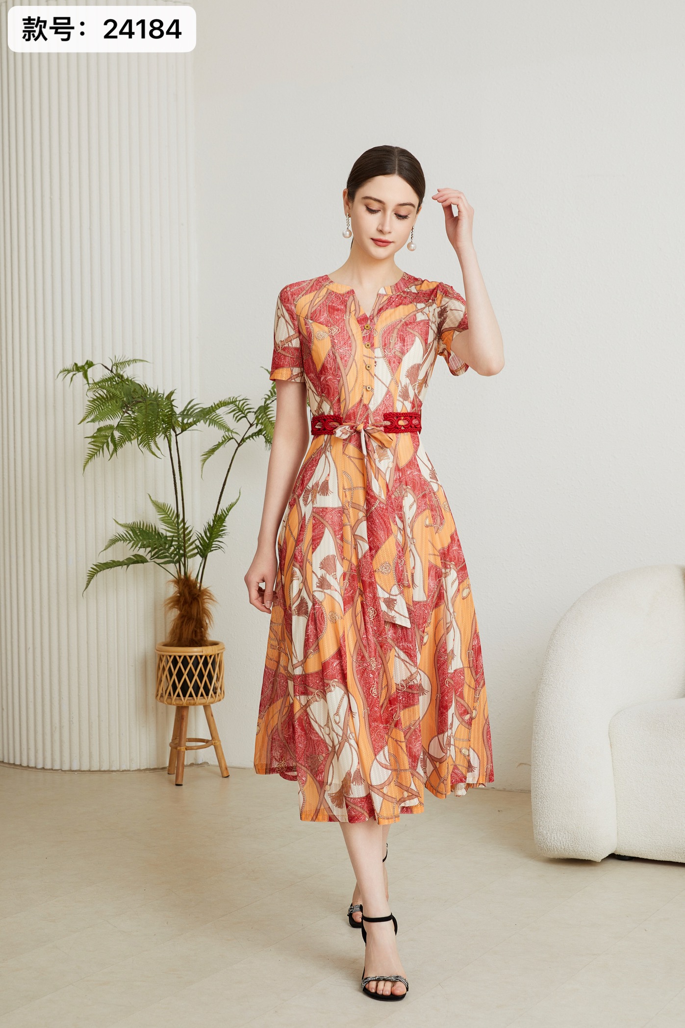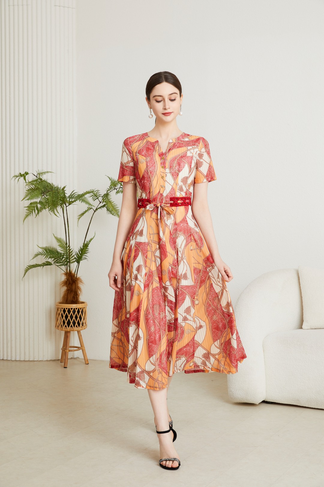 HJ1S88_赪霞色_A 字摆连衣裙_夏季_精致小 V 领短袖收腰系带红色 A 字大摆长裙_高级女装_BERNIEELEN 伯妮斯茵