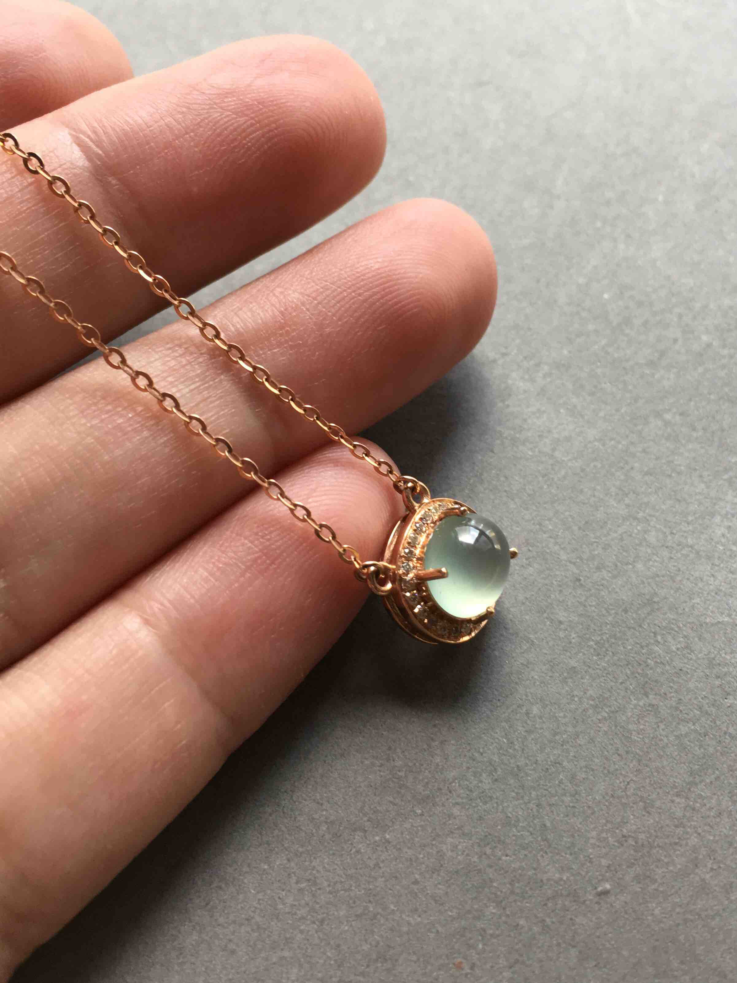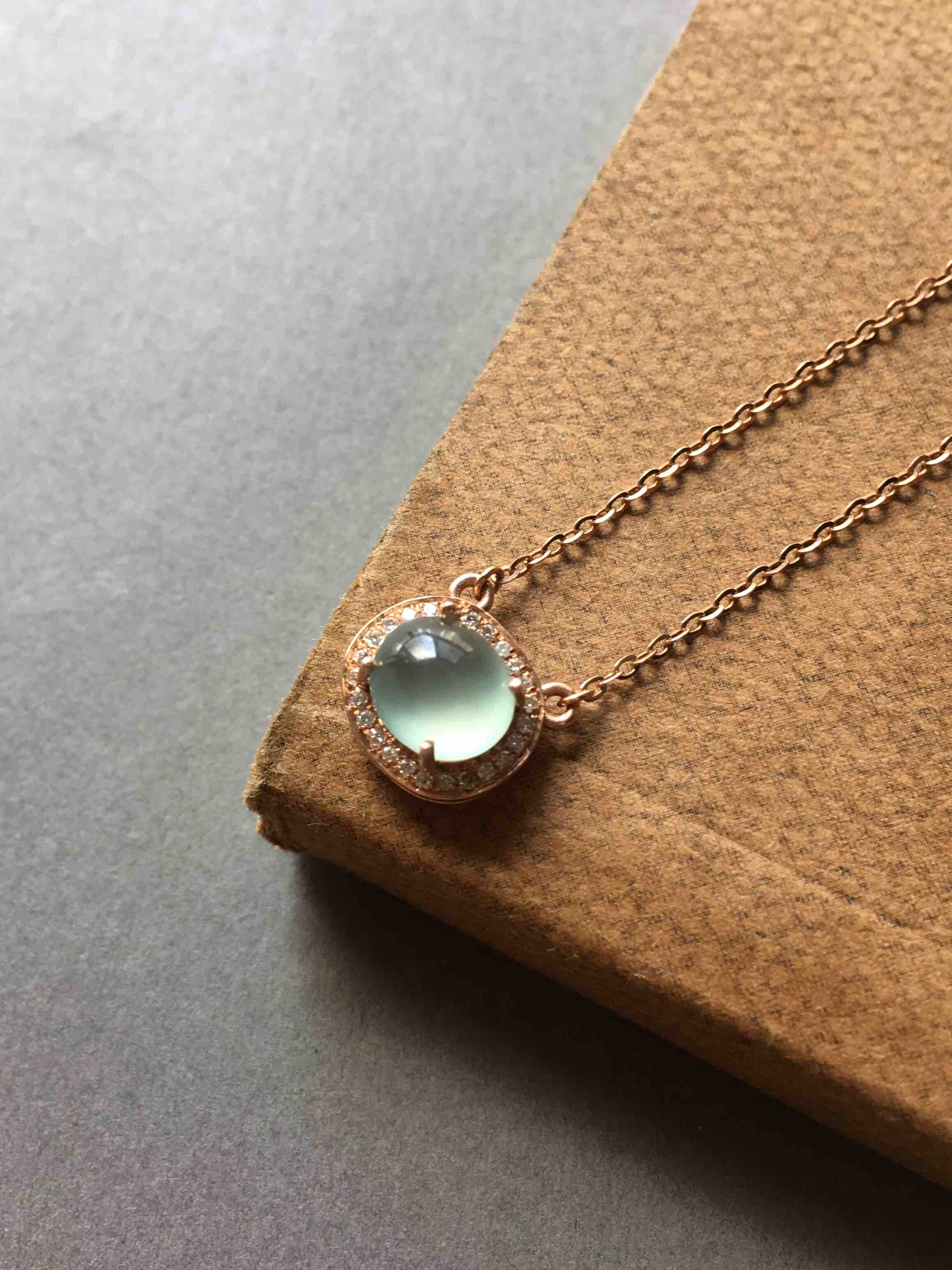 大家呼唤已久的,经典款高冰种晴水翡翠蛋面锁骨链,7.8×6.8×4mm,镶嵌后9.9×9.5×7.3mm,链长40cm加3cm延长链,选用的蛋面品质很高,荧光四射的种水,近玻璃种,像光球一样闪,厚厚的鼓鼓的,特别有立体感,18k玫瑰金钻石镶嵌,全18k金项链,经典时尚的款式,人见人爱