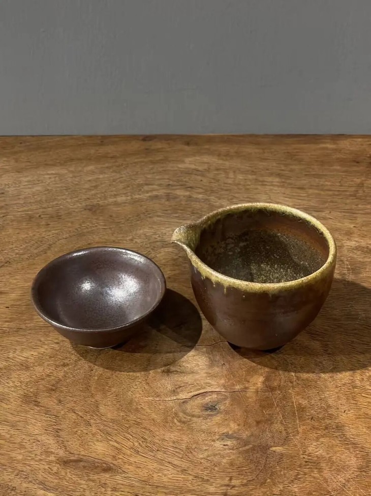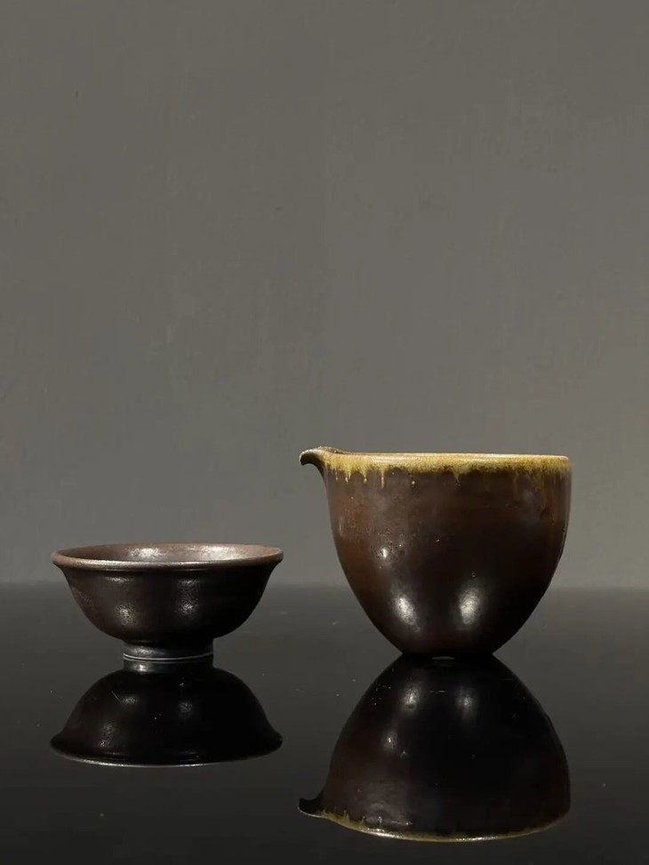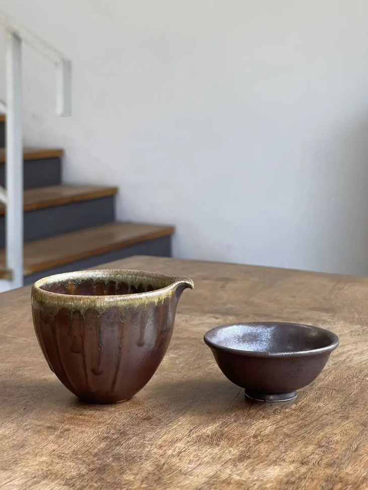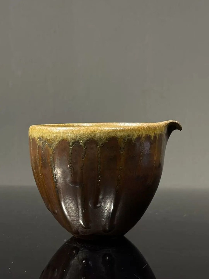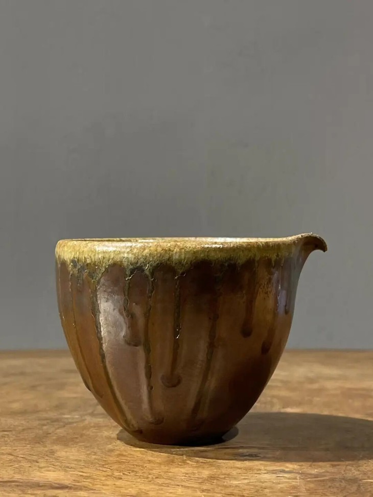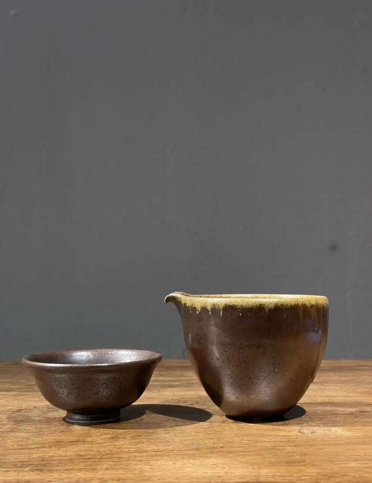 这是一件套近代陶艺家的柴烧窑褐地流淌黄釉公道杯套组,是近代陶艺家以天然陶土及草木灰釉,在柴烧窑中高温烧制而成的褐地流淌黄釉公道杯套组。
