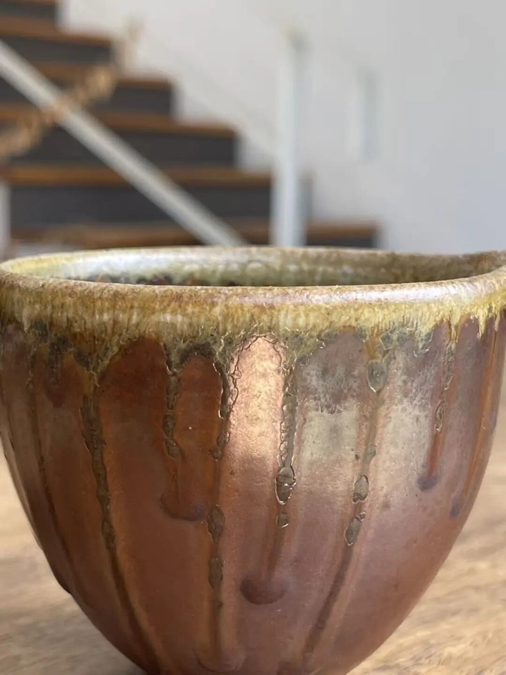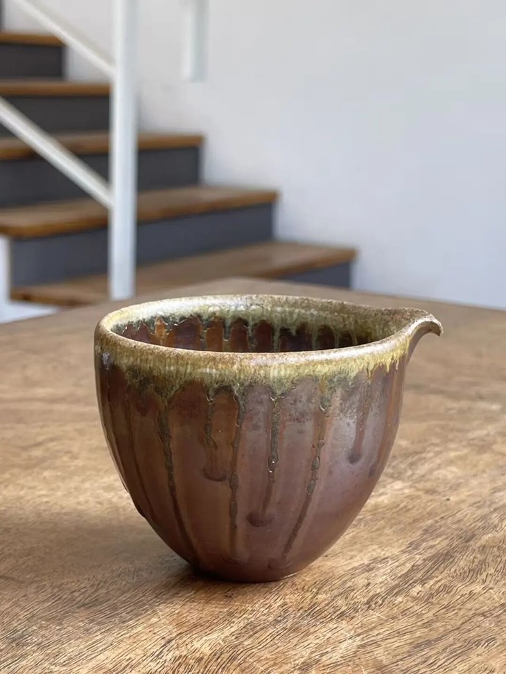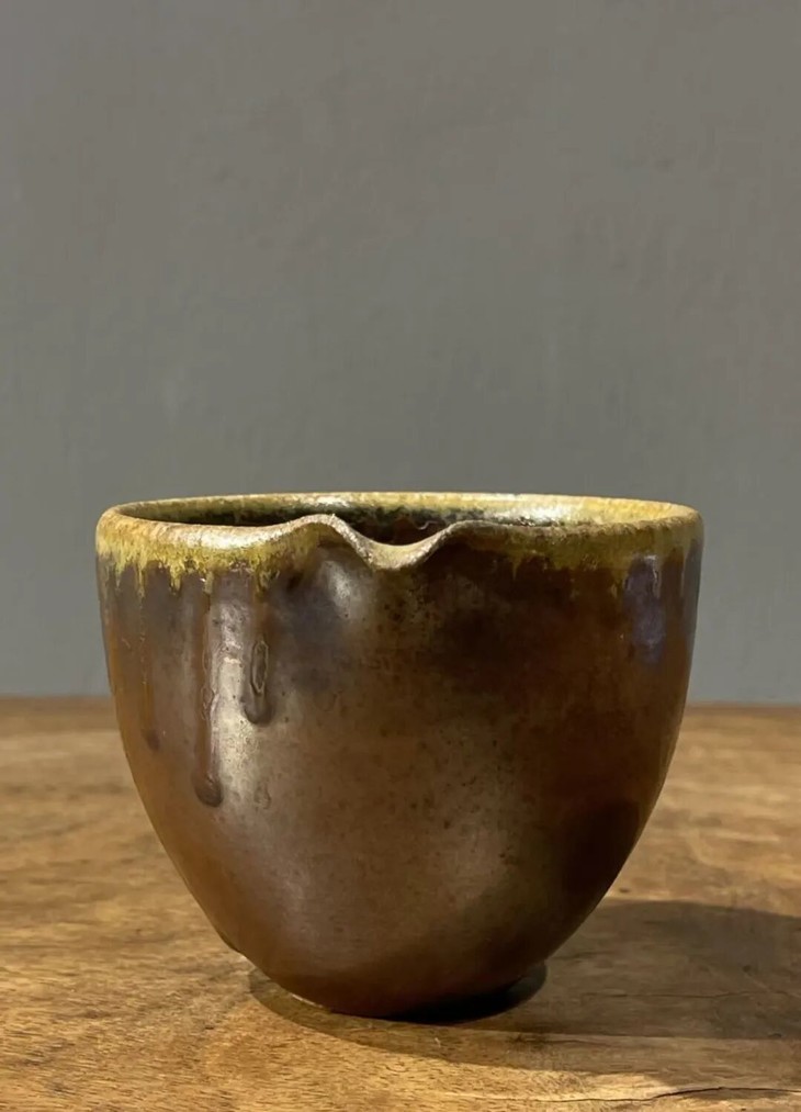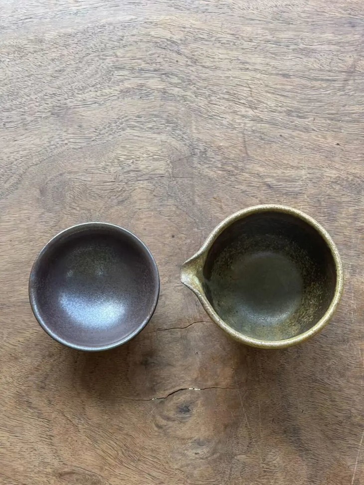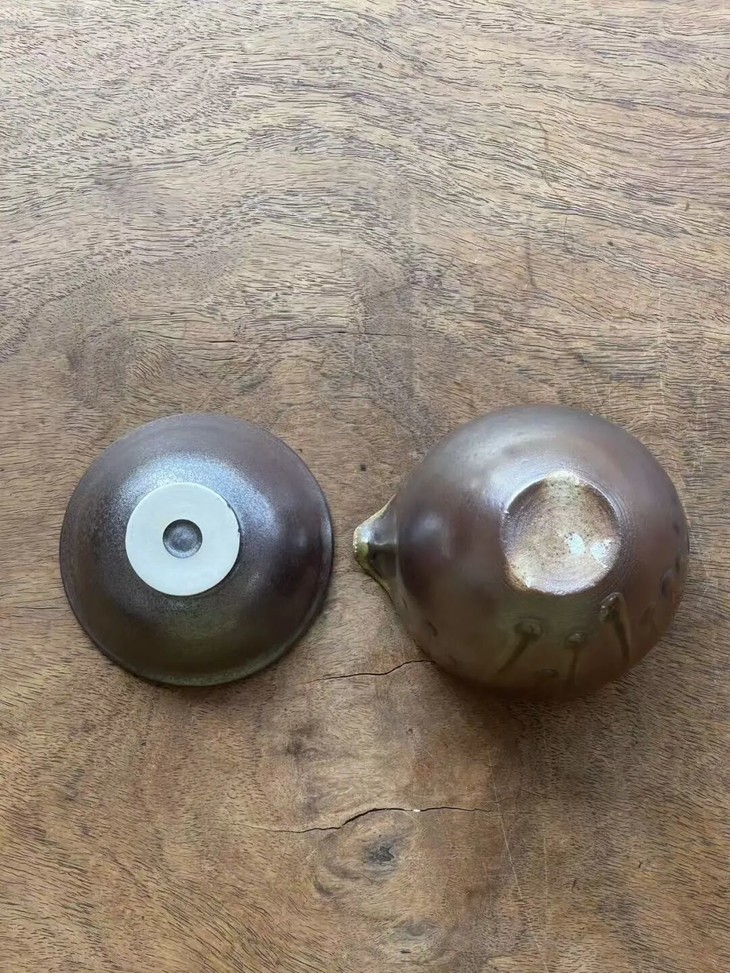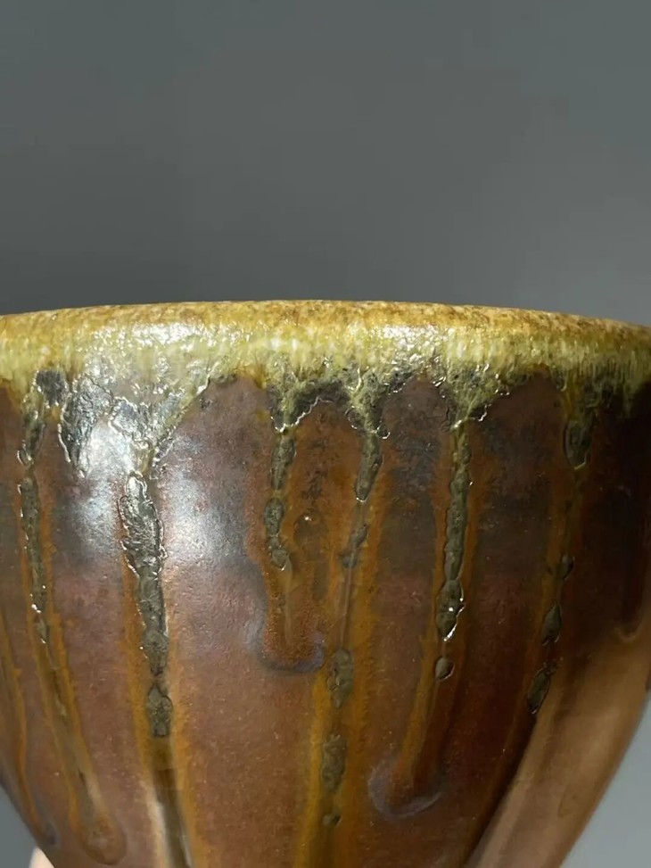 这是一件套近代陶艺家的柴烧窑褐地流淌黄釉公道杯套组,是近代陶艺家以天然陶土及草木灰釉,在柴烧窑中高温烧制而成的褐地流淌黄釉公道杯套组。