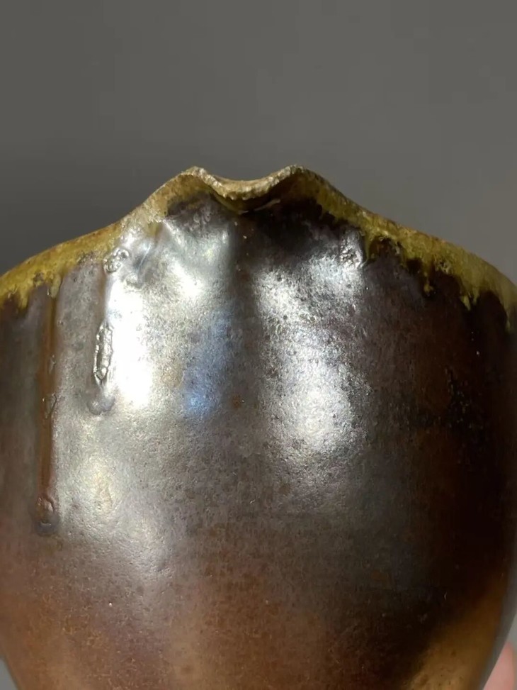 此套柴烧窑公道杯套组可用于茶席或是酒席,缸状短流公道杯搭配一件小杯,造形简约优美,口沿流淌黄色釉,全器金属光泽褐釉,整体釉面浑然天成,是一组设计佳烧制严谨的柴烧茶器或是酒具。此柴烧窑褐地流淌黄釉公道杯套组,保存完好无损。