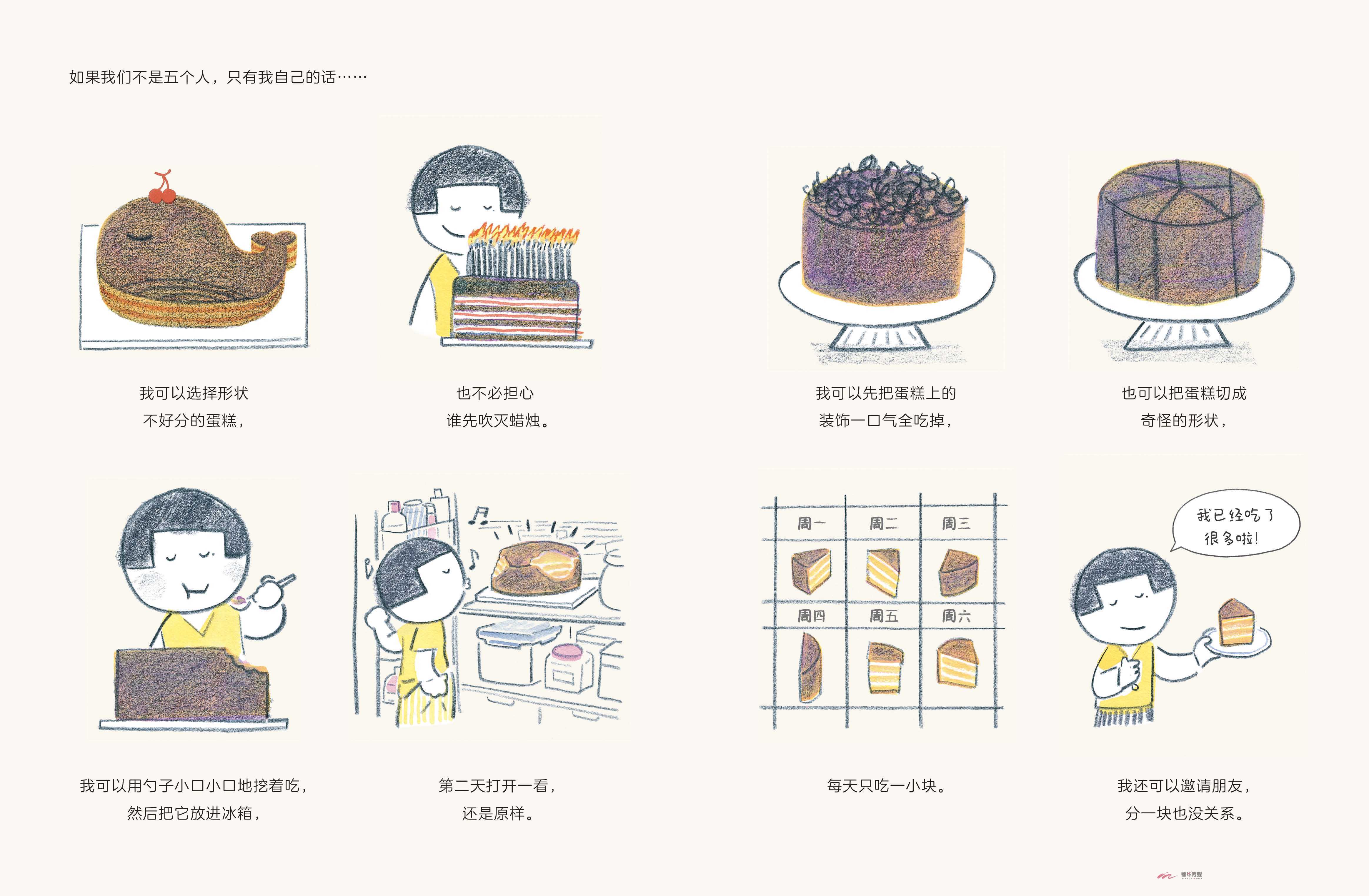 ;要是没有其他人,我就能自己吃一整个蛋糕了。先吃哪一块都可以,一天内吃不完也没关系,放进冰箱里,第二天打开看还原封不动。哪个孩子没有这样想过呢?不过呢,有时能有人一起分享,蛋糕才会更美味。这就是让蛋糕越变越大的;爱的算法。