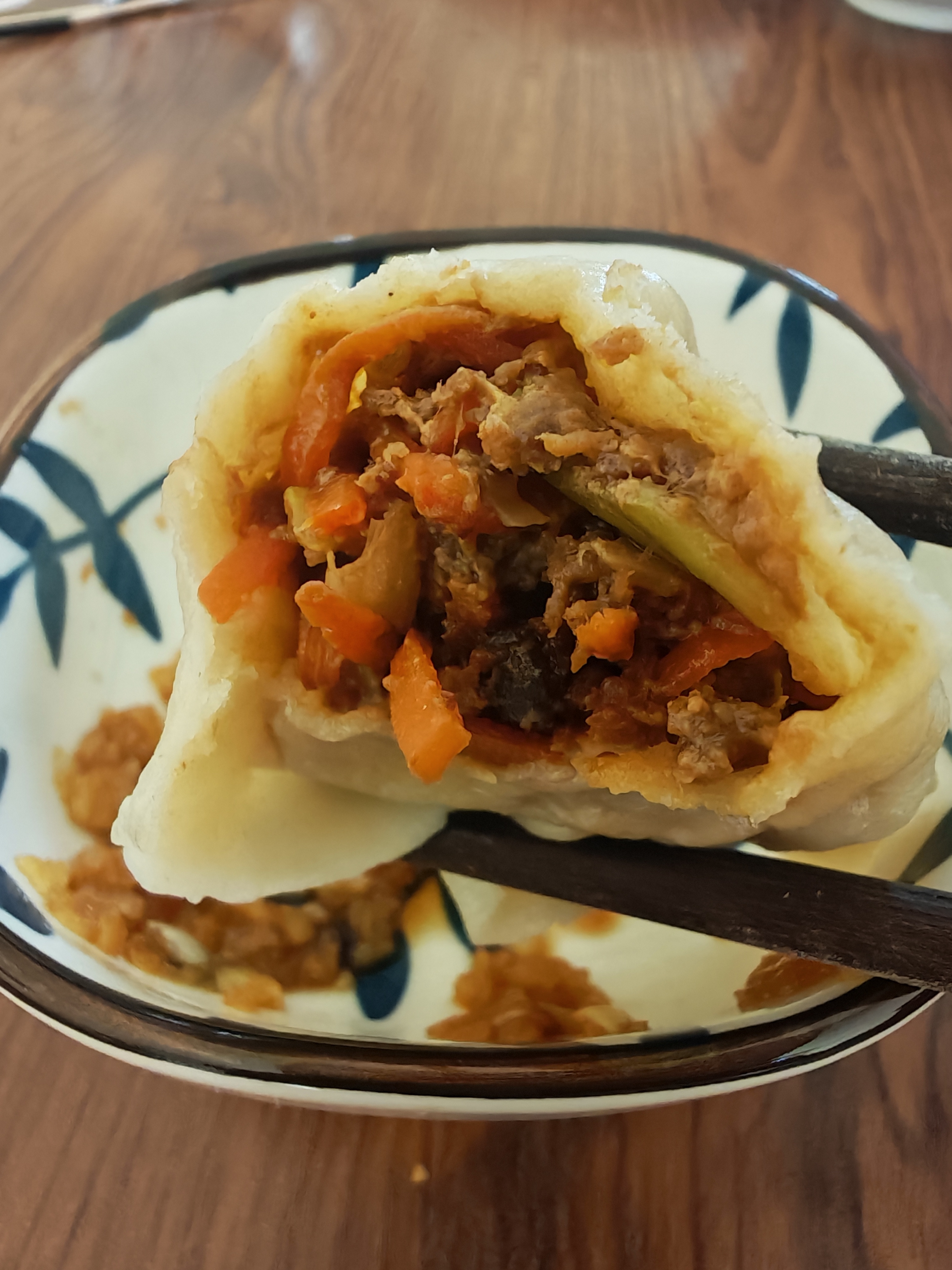 ↑牛肉馅搭配胡萝卜葱花调成饺子馅