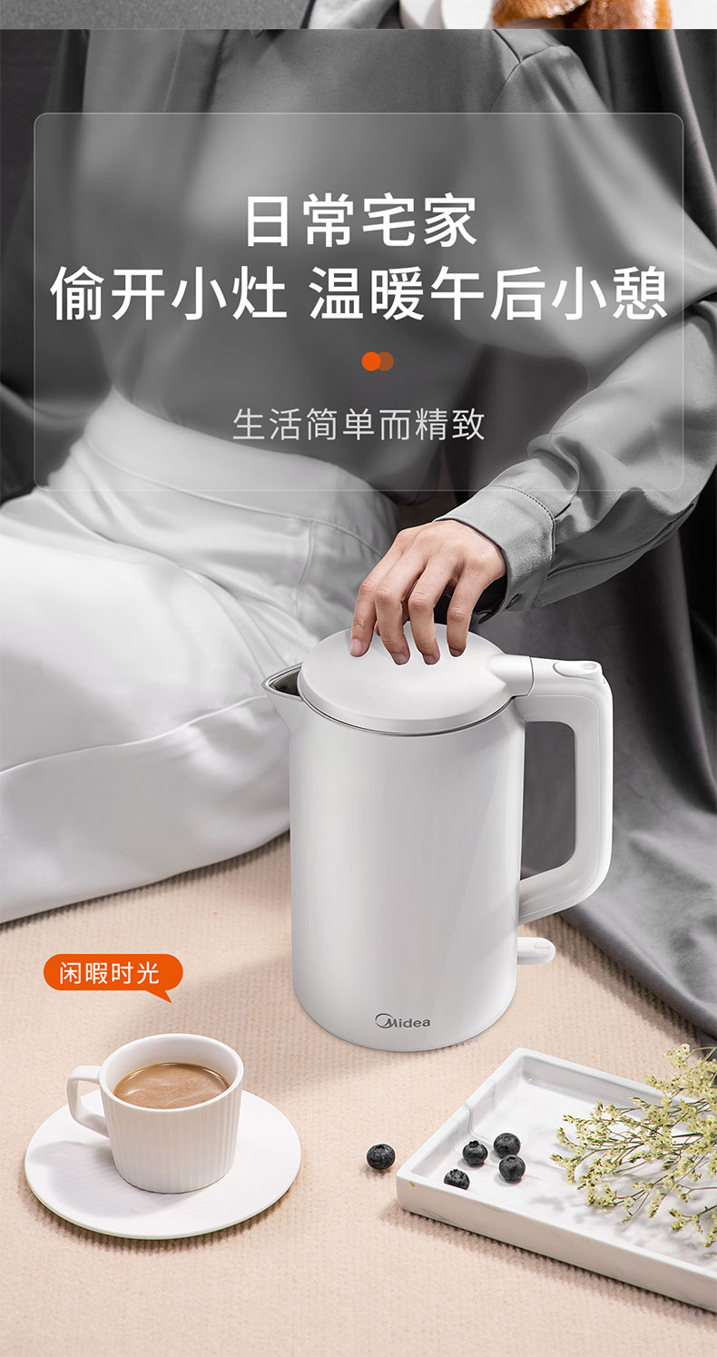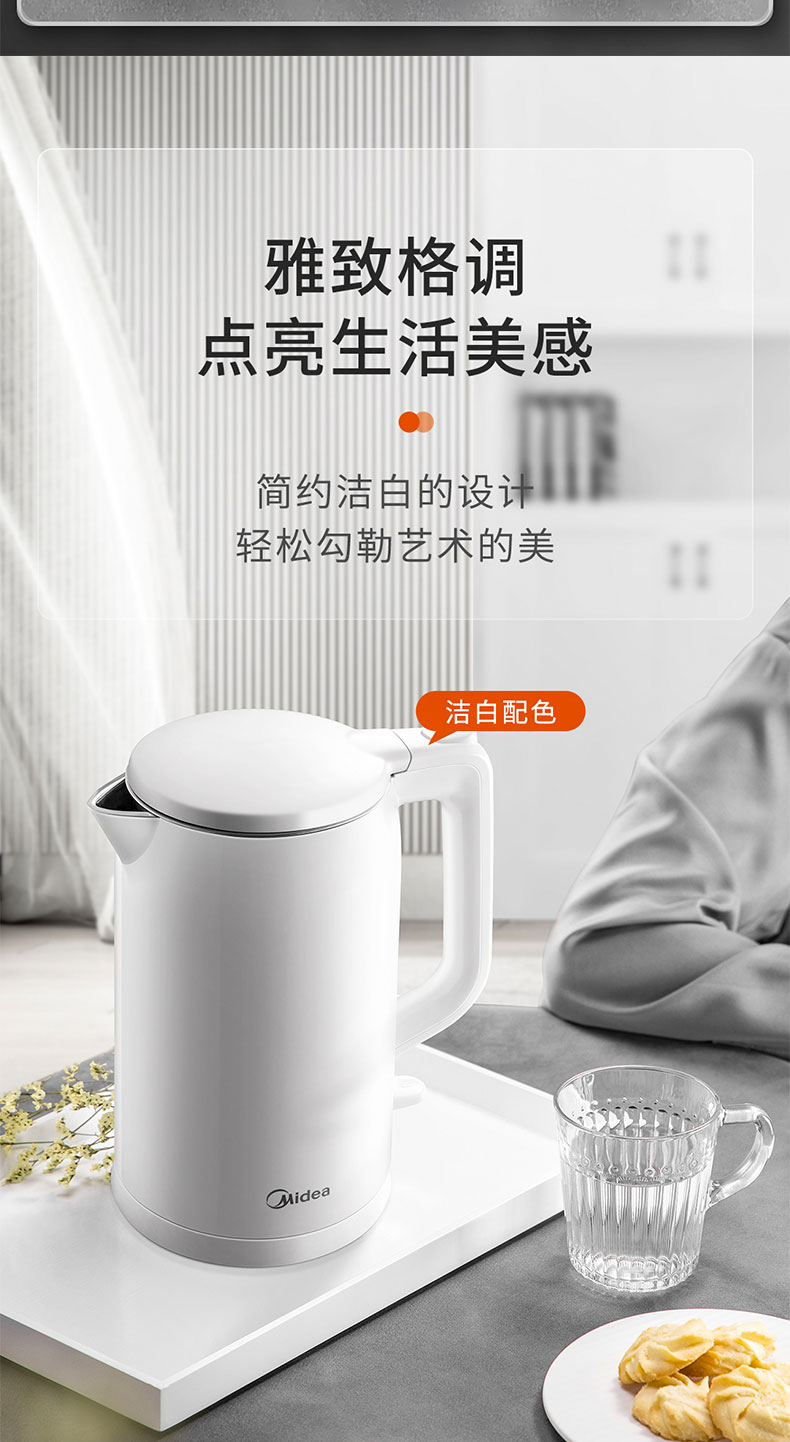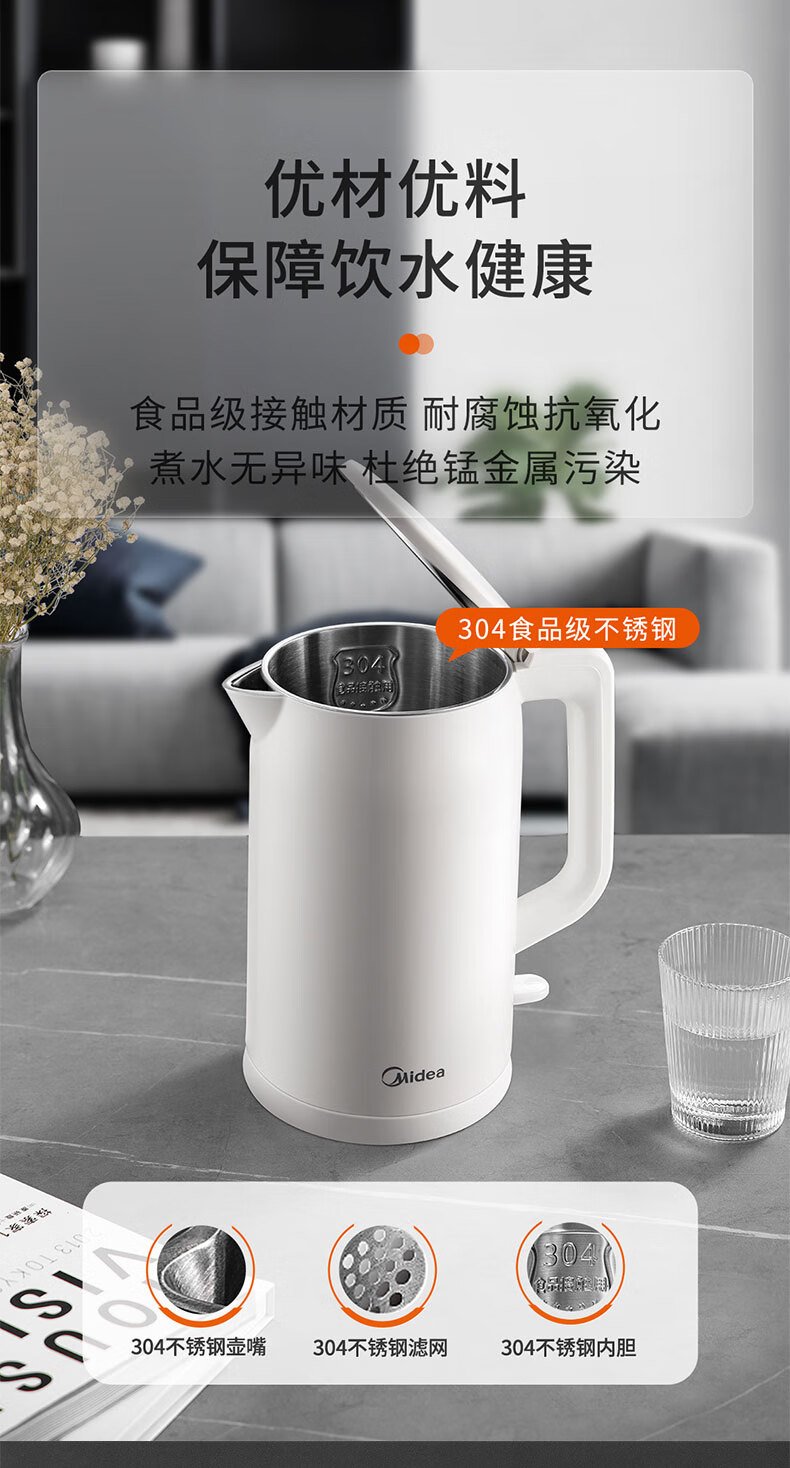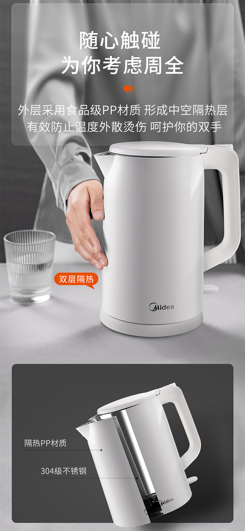 美的(Midea)电热水壶 1.7L大容量家用烧水壶双层防烫 304不锈钢水壶AEK1769