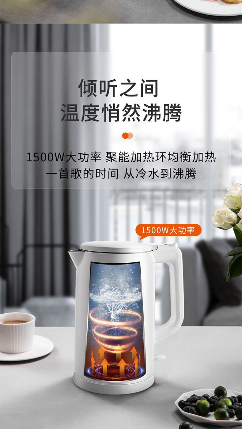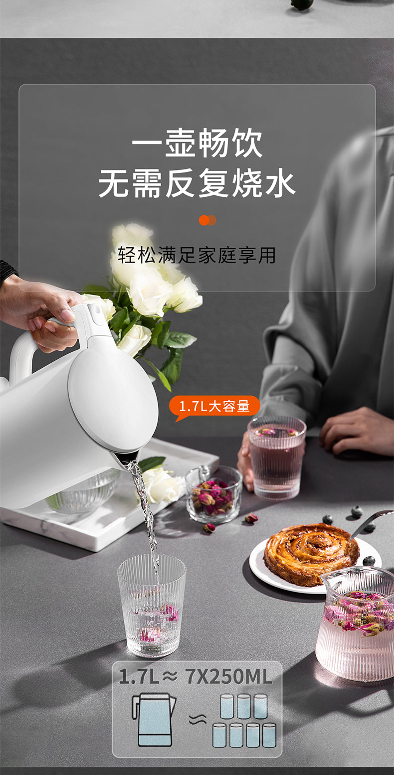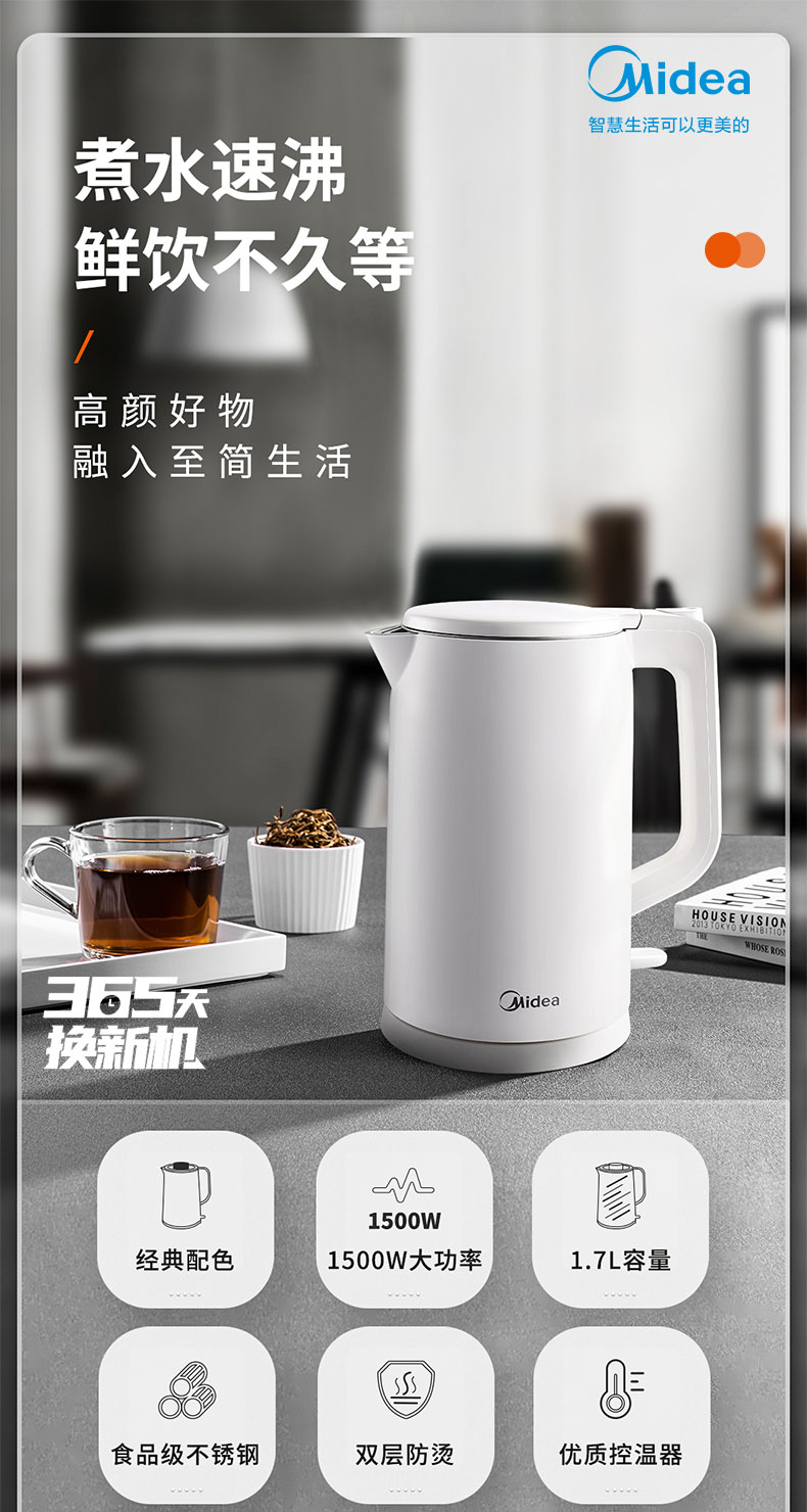 美的(Midea)电热水壶 1.7L大容量家用烧水壶双层防烫 304不锈钢水壶AEK1769