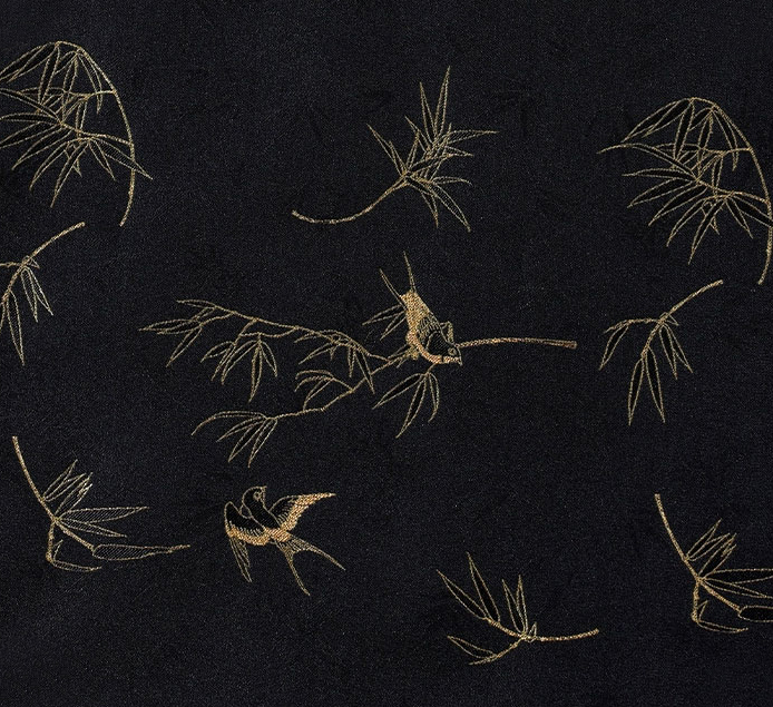 染丝织画,跃然衣上,巧妙运用金丝,让燕子落于竹上、翩飞于竹林间,金燕姿态轻盈、展翅飞翔,传递着春天的活力与生机。