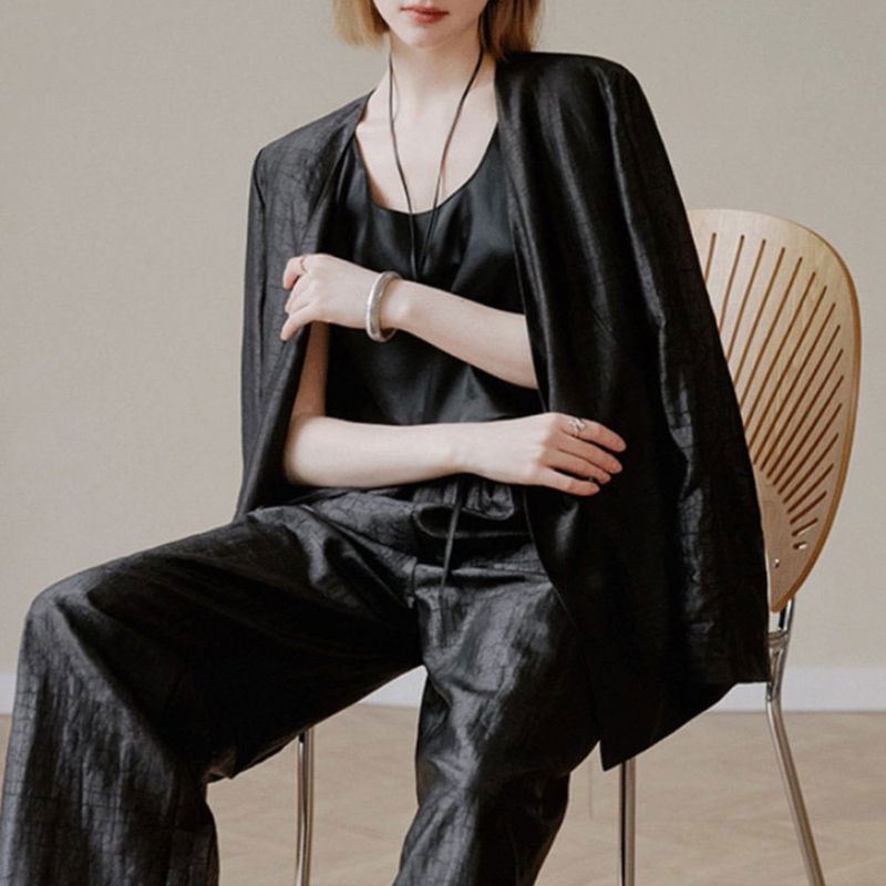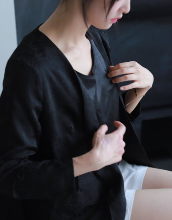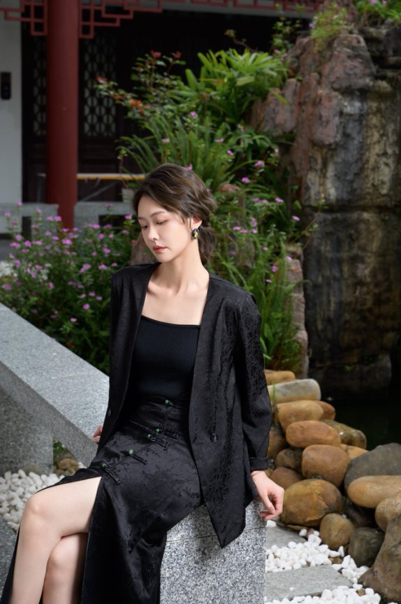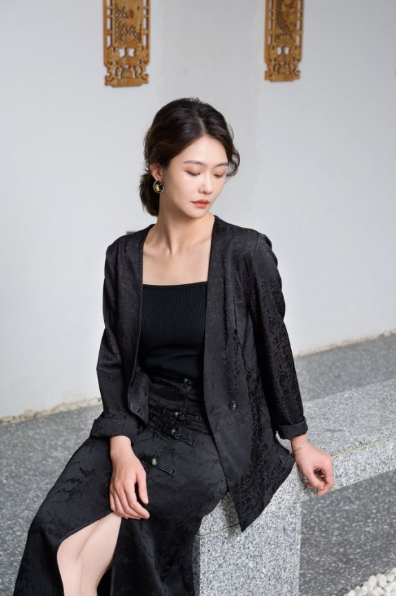 这款香云纱西装外套区别于传统西装领,巧妙改良后成大V形,即视感拉长脖颈线条。