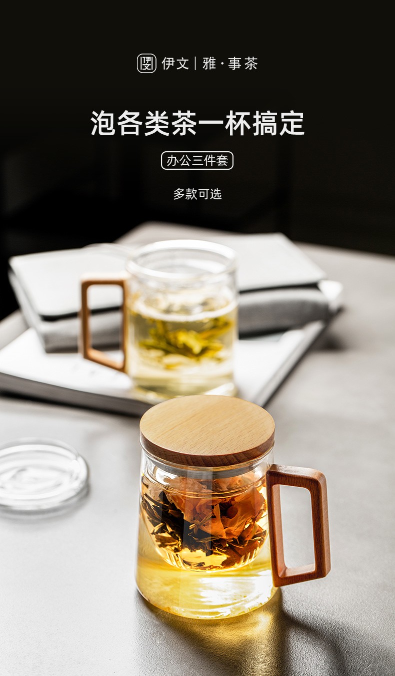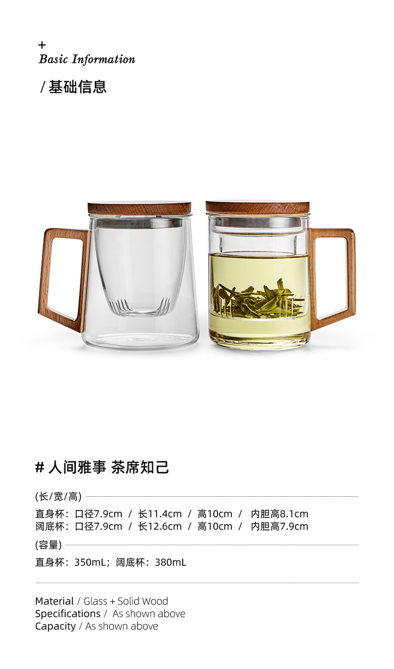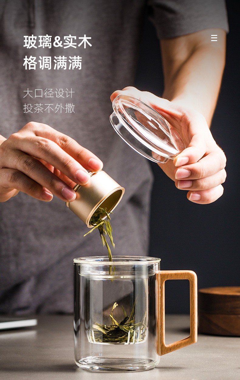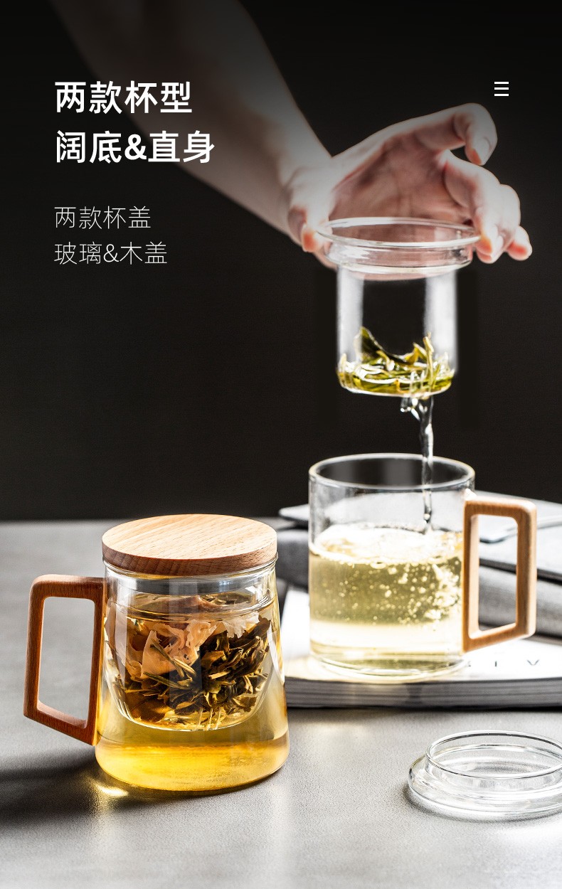 过滤茶杯泡茶杯耐热玻璃杯带把办公室花茶杯透明杯子茶水分离 伊-清灵阔底泡茶杯-榉木盖P1f(言调)