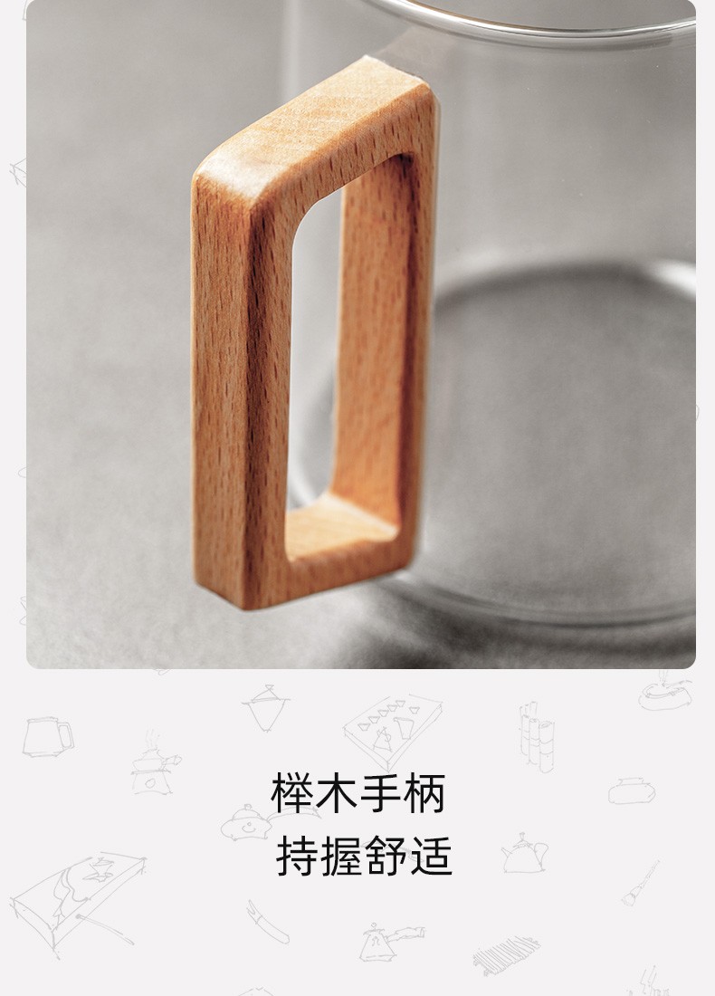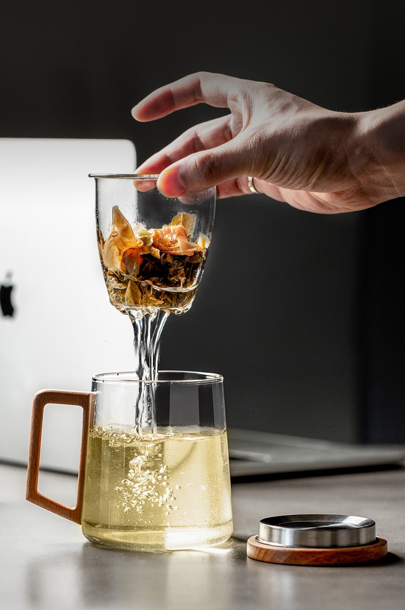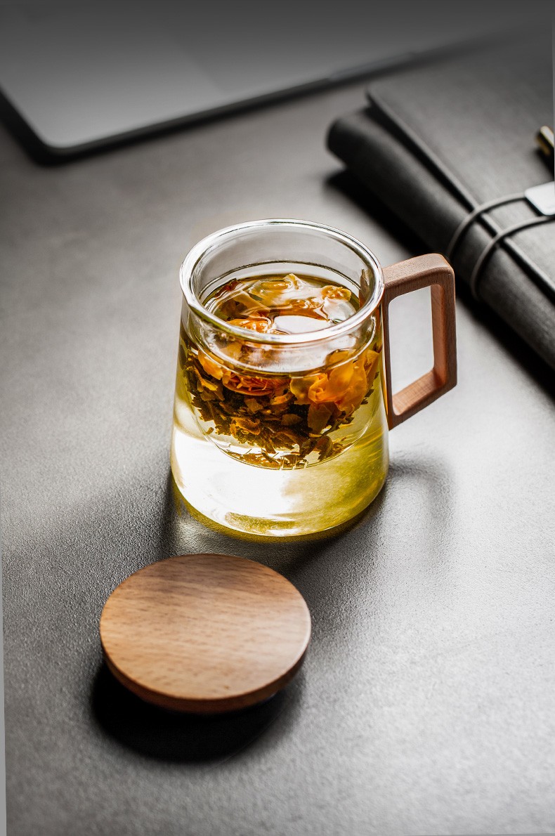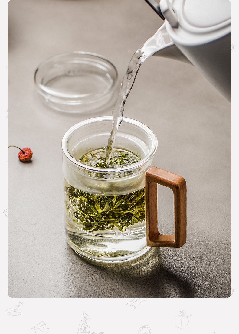 过滤茶杯泡茶杯耐热玻璃杯带把办公室花茶杯透明杯子茶水分离 伊-清灵阔底泡茶杯-榉木盖P1f(言调)