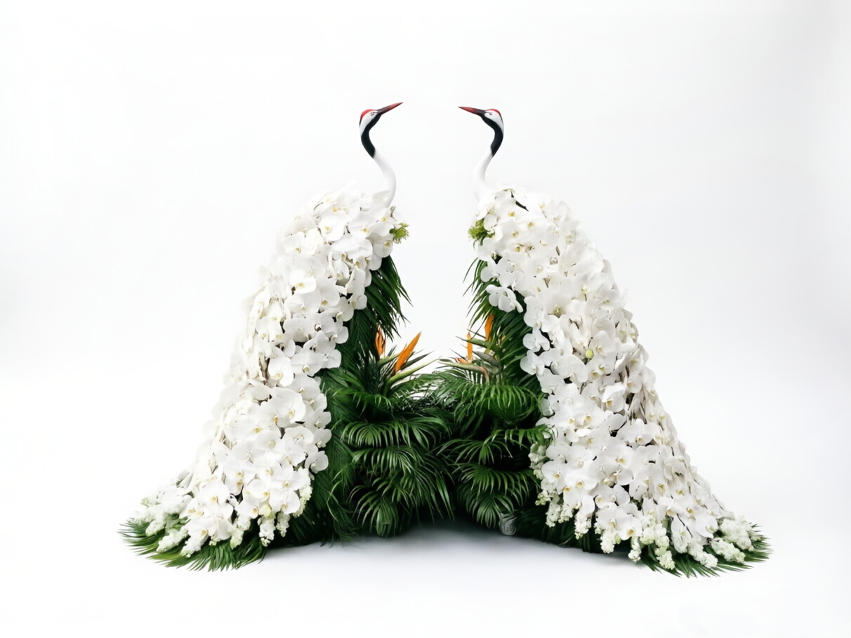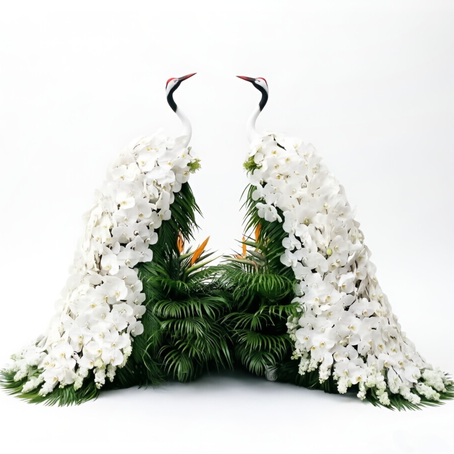 以仙鹤为主体,配以白色蝴蝶兰和绿植,意境幽远!