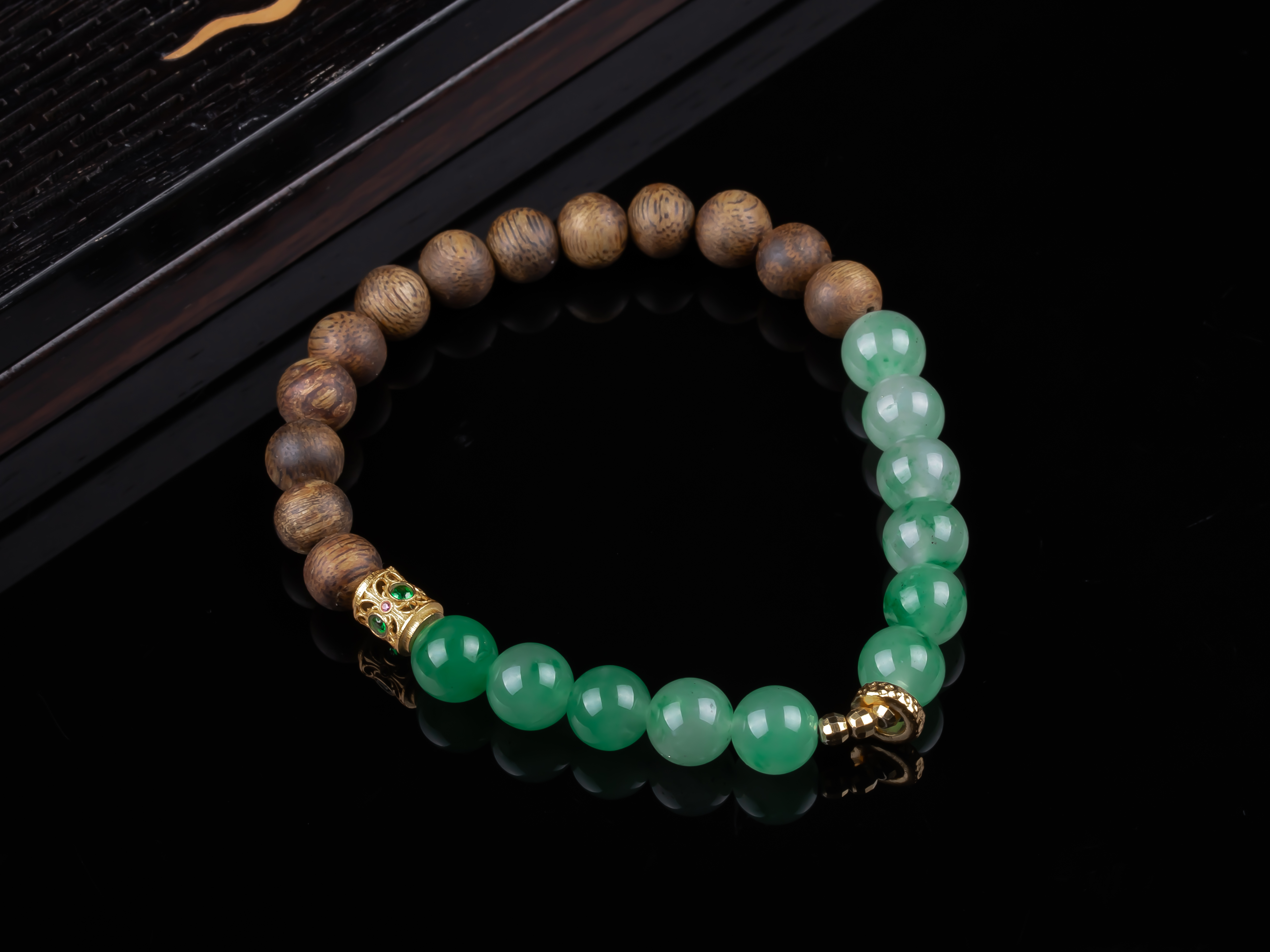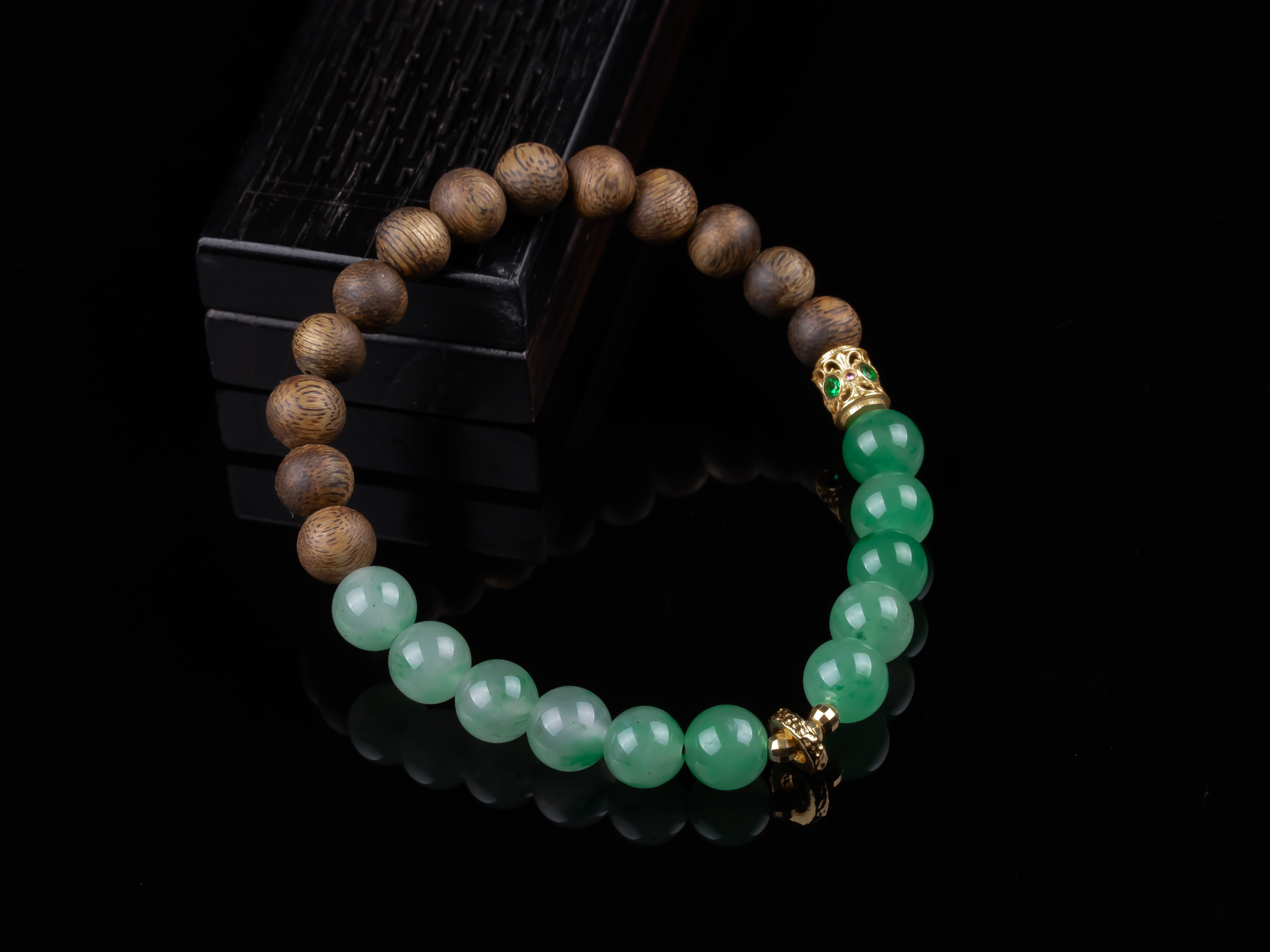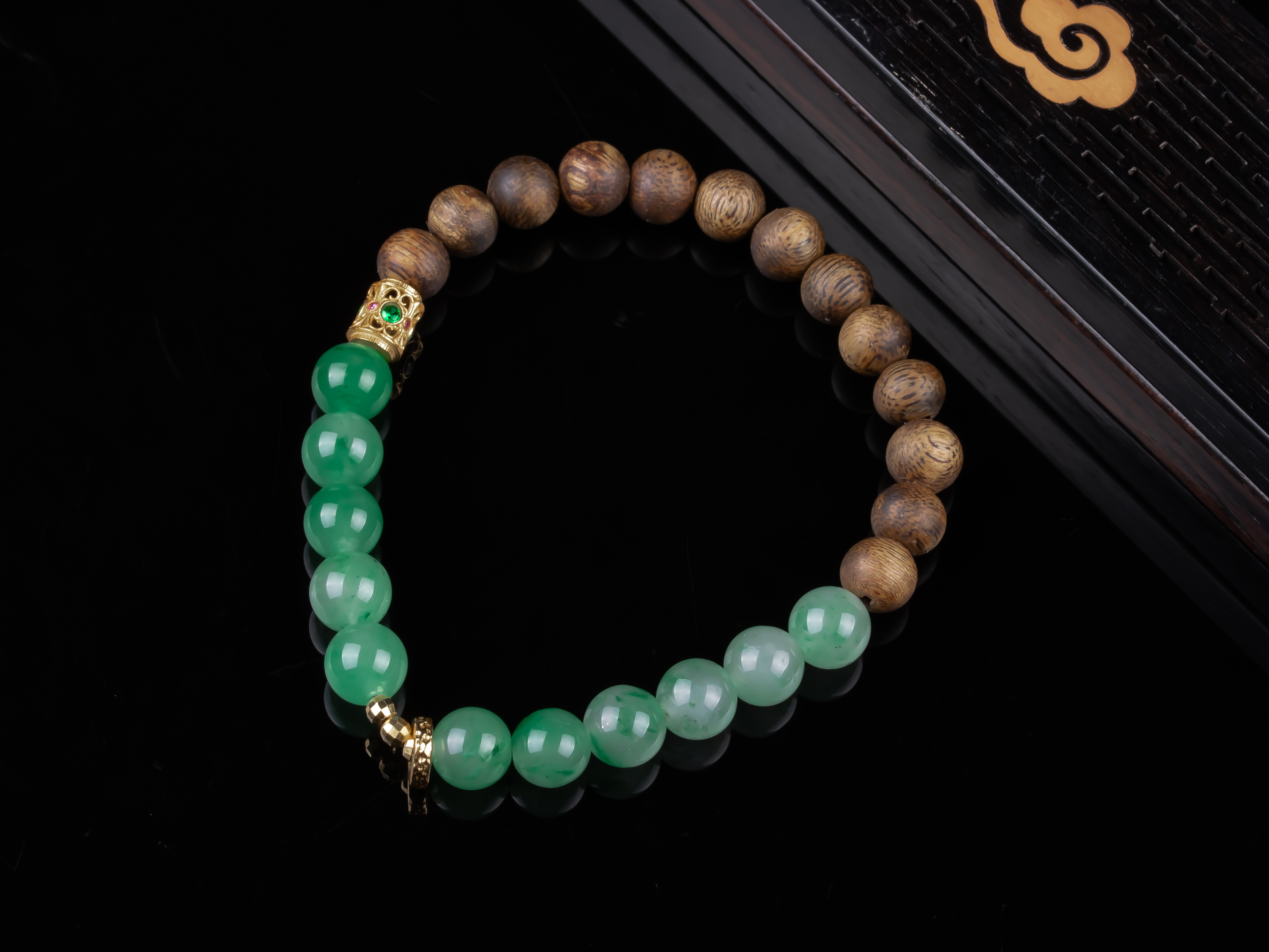 XY0268沉香+非洲翠925银手串,天然沉香约7.3mm,原色原味,香味自然清甜,冰飘花的非洲翠,半山半水的设计,加一枚灵动的小跑环,时来运转。