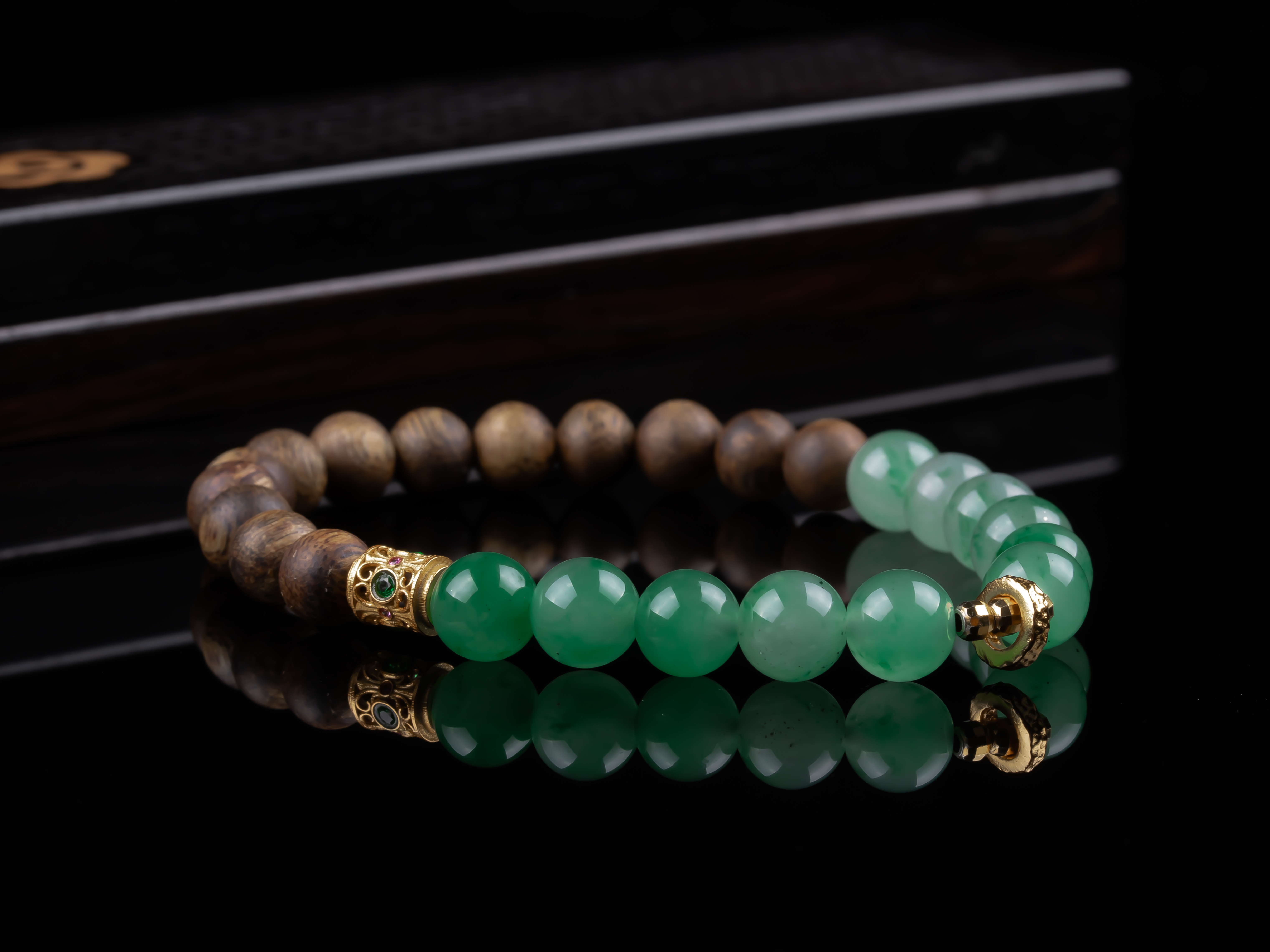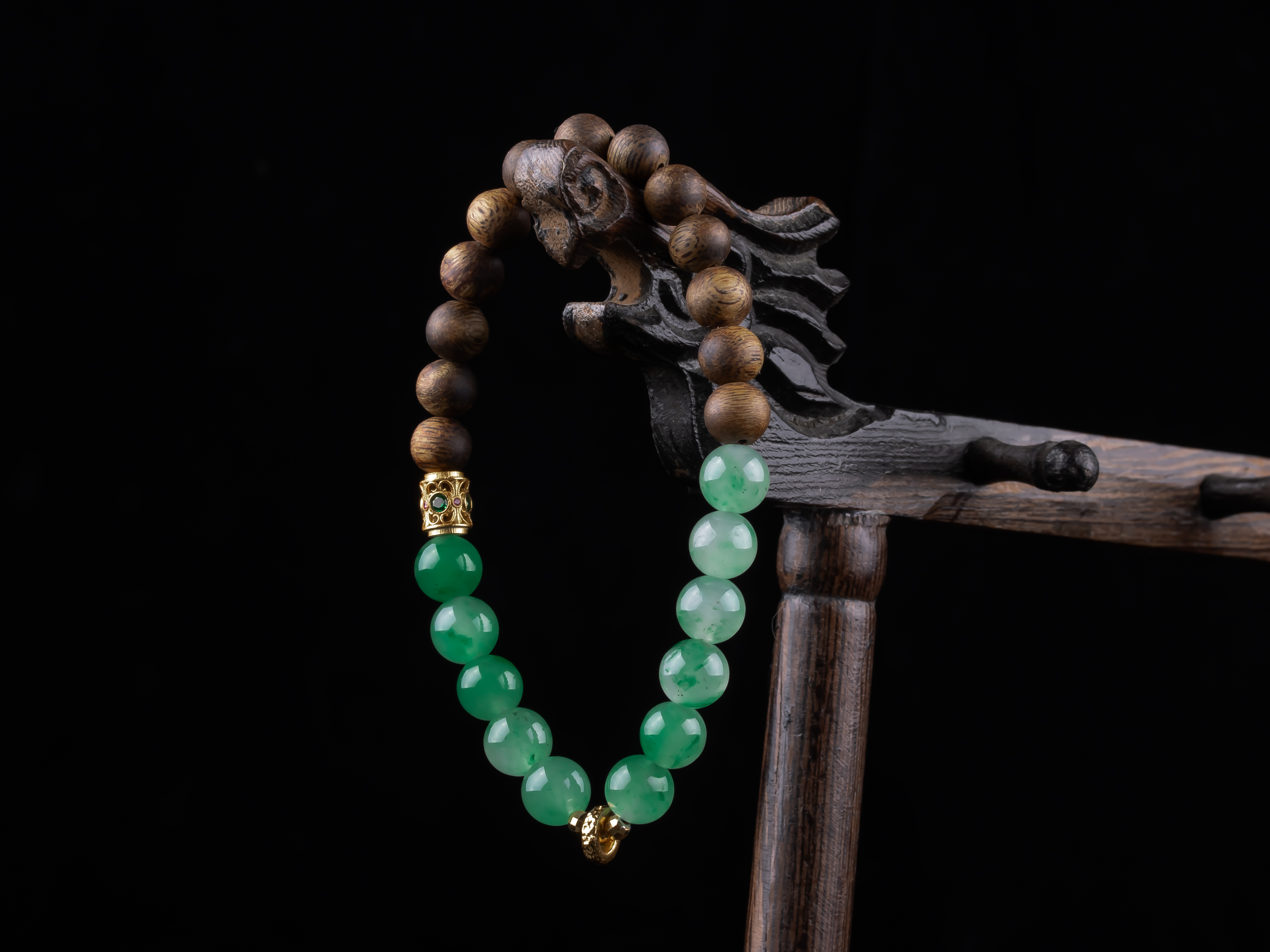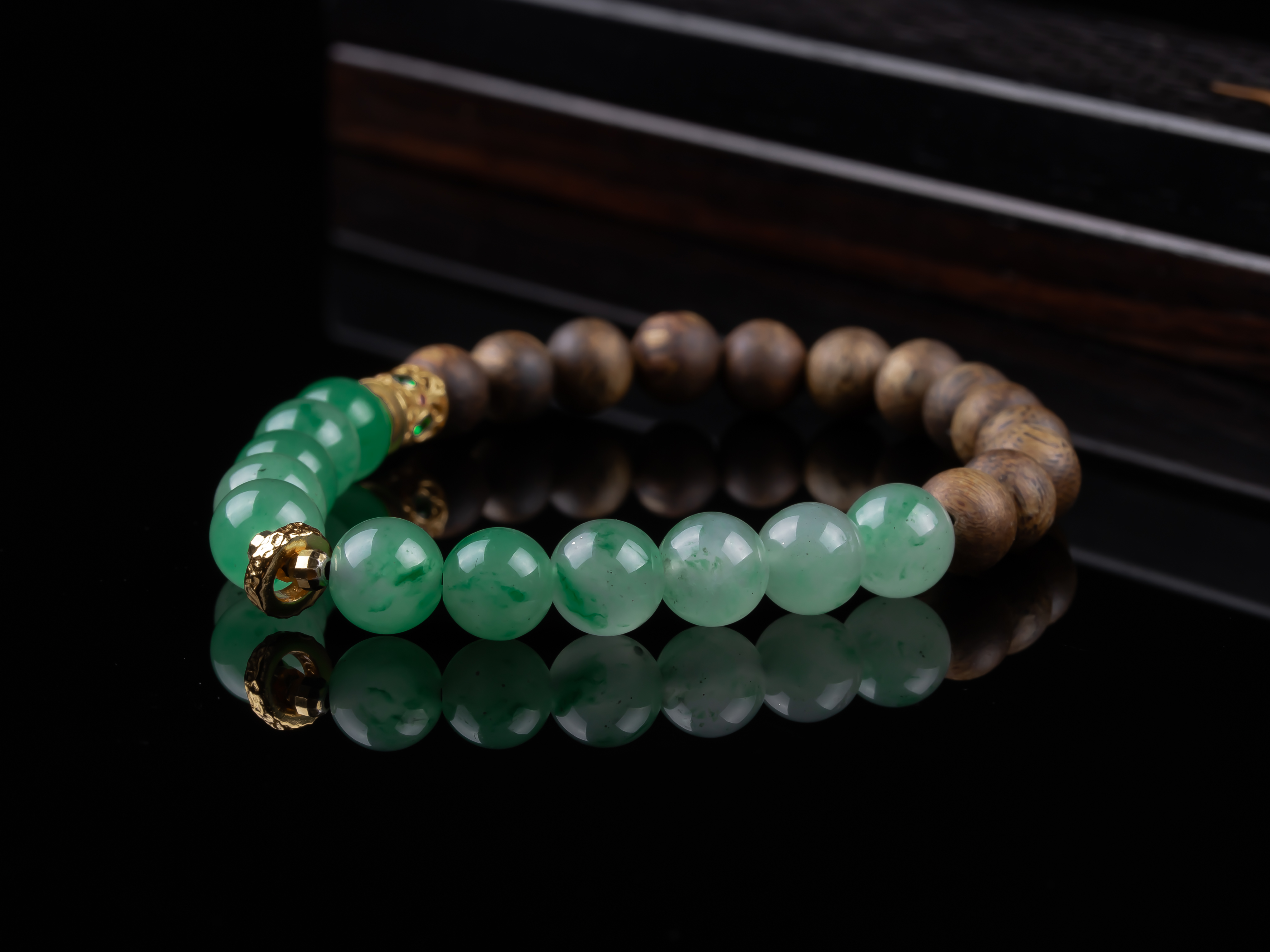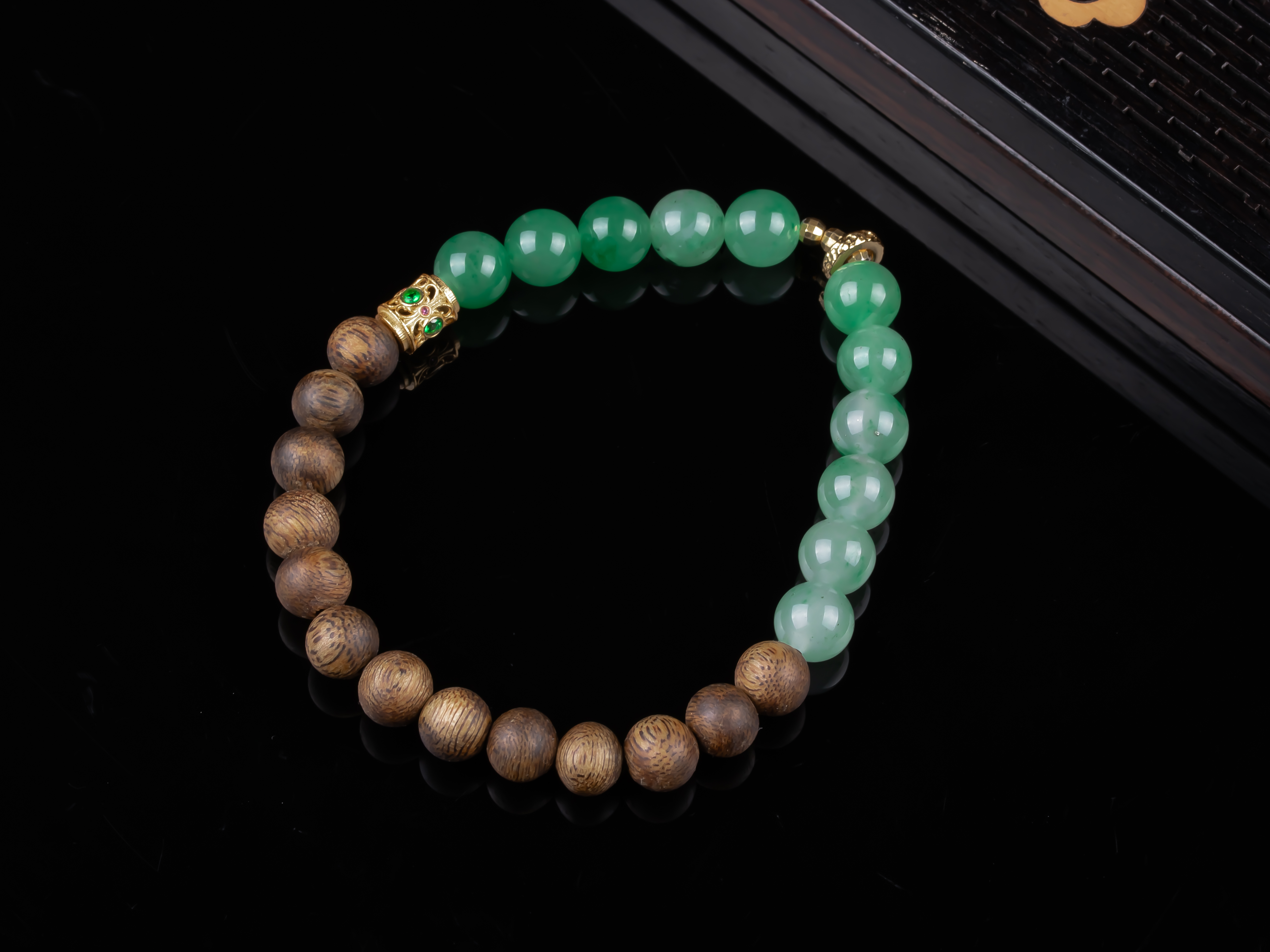 XY0268沉香+非洲翠925银手串,天然沉香约7.3mm,原色原味,香味自然清甜,冰飘花的非洲翠,半山半水的设计,加一枚灵动的小跑环,时来运转。