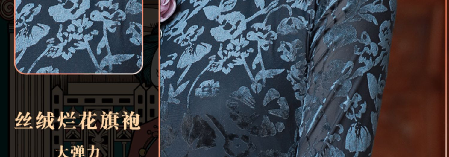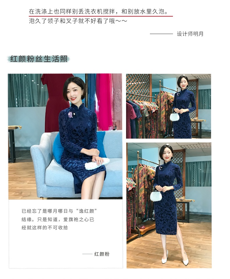 逸红颜 木兰 复古丝绒旗袍秋季新款开叉连衣裙*雅气质修身显瘦