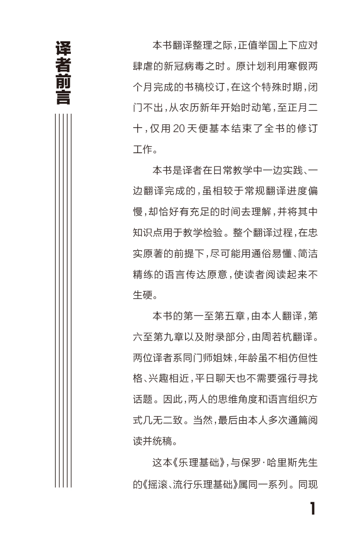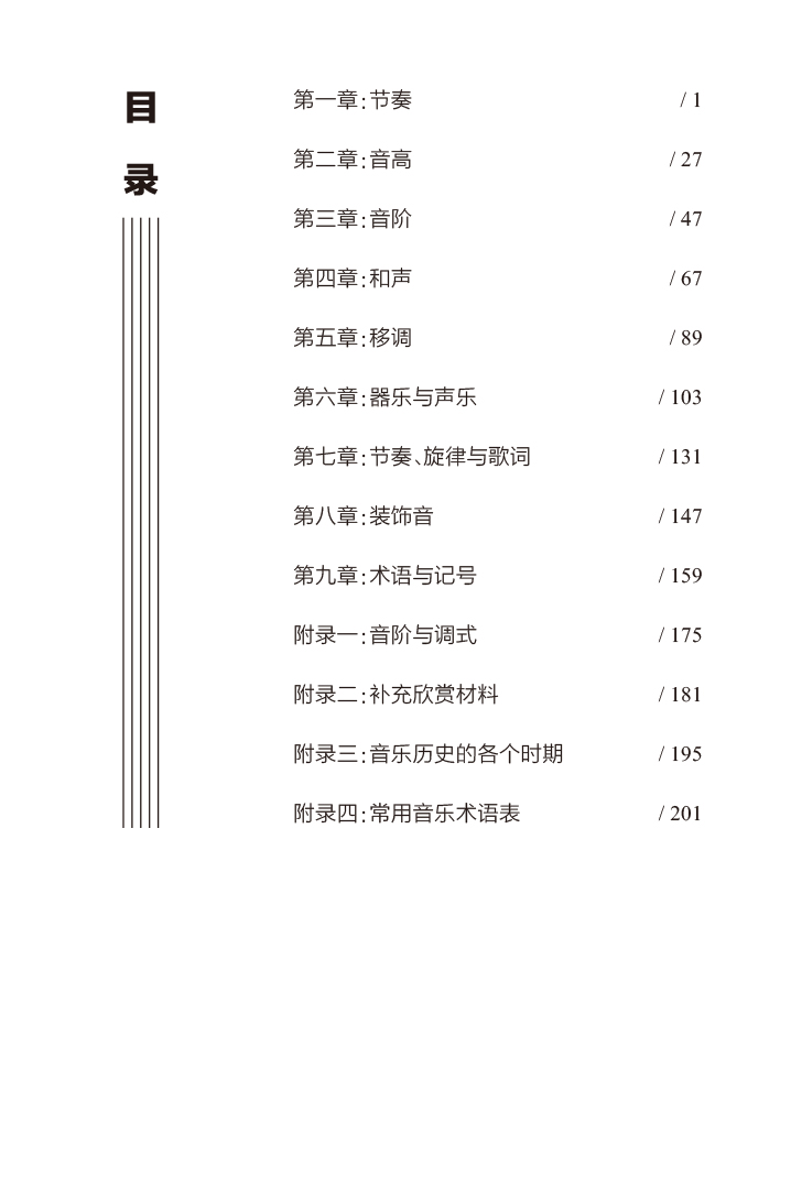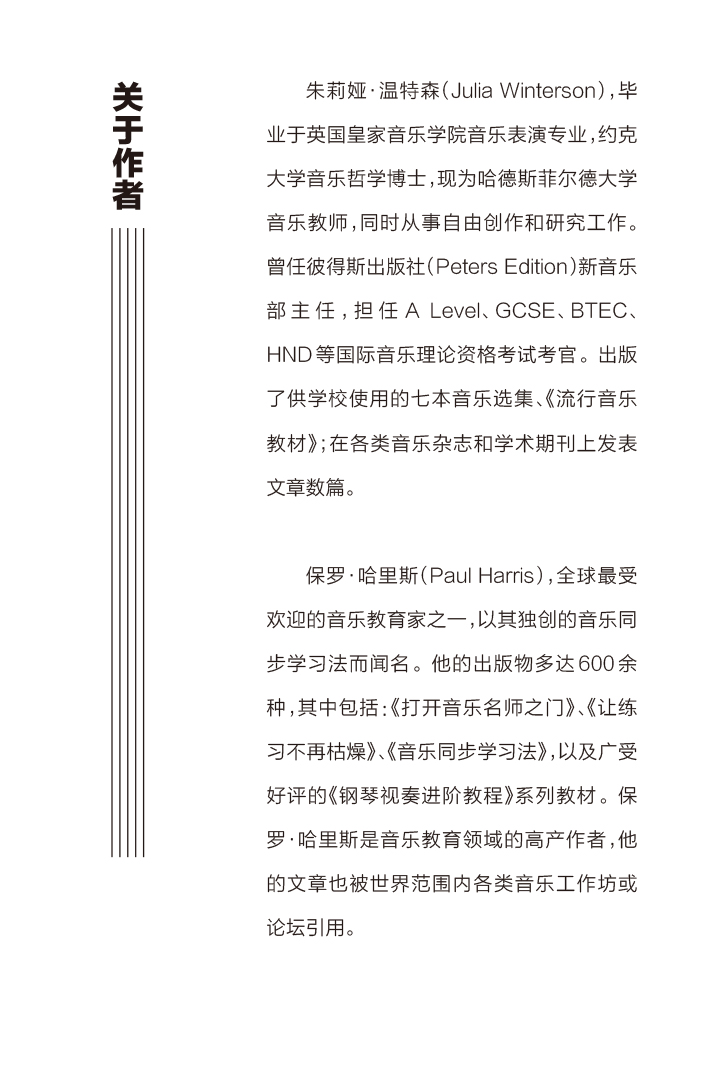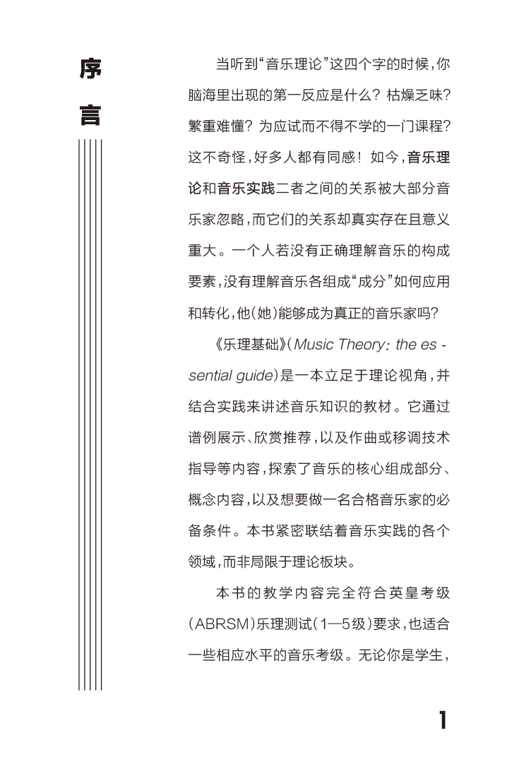 许多音乐家低估了音乐理论和实际音乐之间的关系,其实这种联系不仅是非常重要的,而且是绝对重要的。如果没有对音乐构成要素的扎实理解,没有对如何操纵和改编音乐;成分的理解,一个人不可能成为一个完整的、真正的音乐家。本书通过音乐理论的视角来探索音乐的关键成分;通过举例、聆听、建议和作曲指导等方式,不断地与真正的音乐产生联系。具体内容如下:第一章为音、音高;第二章为音符及其时值的划分;第三章为谱号;第四章为节奏与节拍;第五章为音程;第六章为自然大小调式;第七章、和弦;第八章为调的关系;第九章为调式变音及调的交替与转换;第十章为装饰音、演奏法记号及音乐术语。事实上,这本书不仅仅是理论上的音乐,而是关乎音乐的整体。更值得一提的是,这本书完全支持英国皇家音乐学院音乐理论考试(1至5级)的要求,以及任何学习音乐的人。无论学生、老师或者仅仅是一个渴望加深音乐理解的音乐家,都能够发现这本书的实用性和有效性。