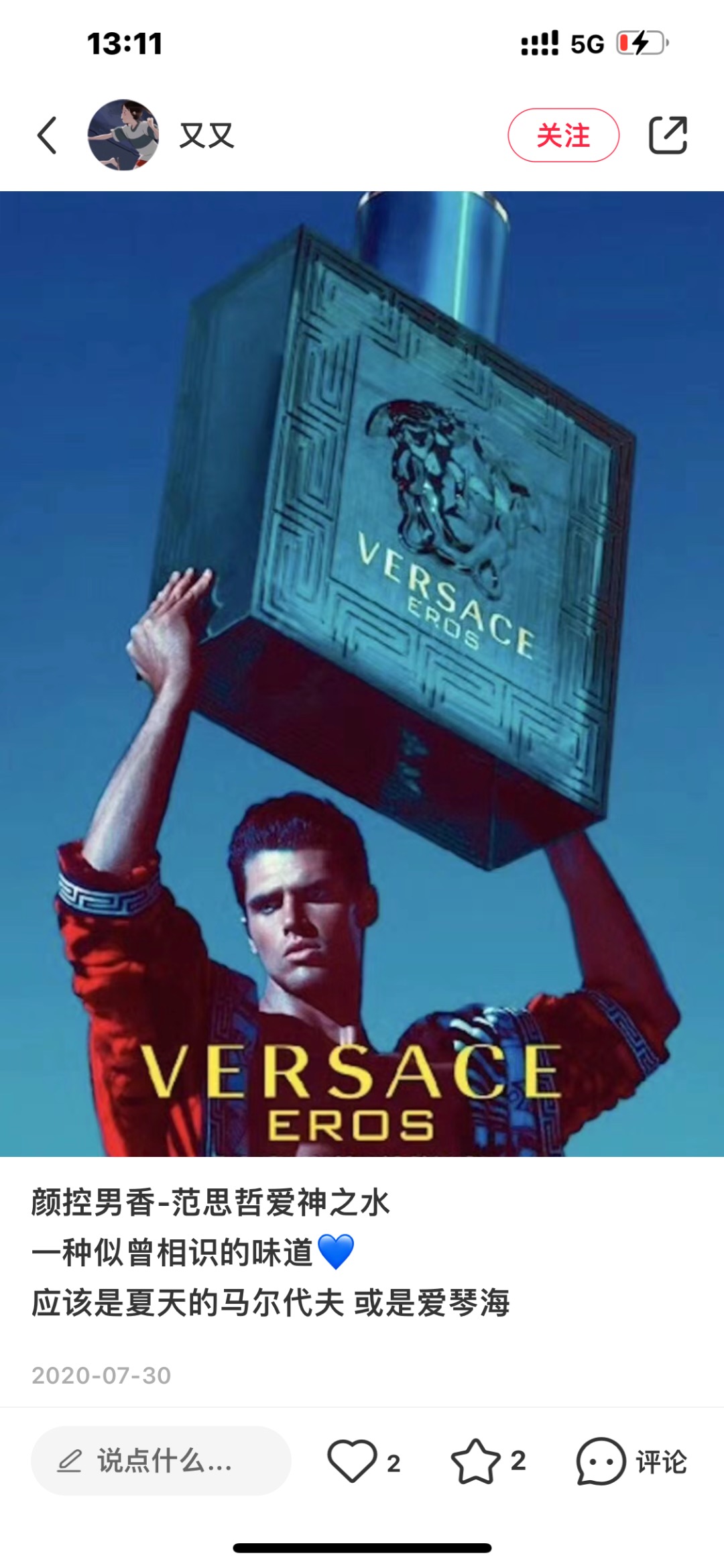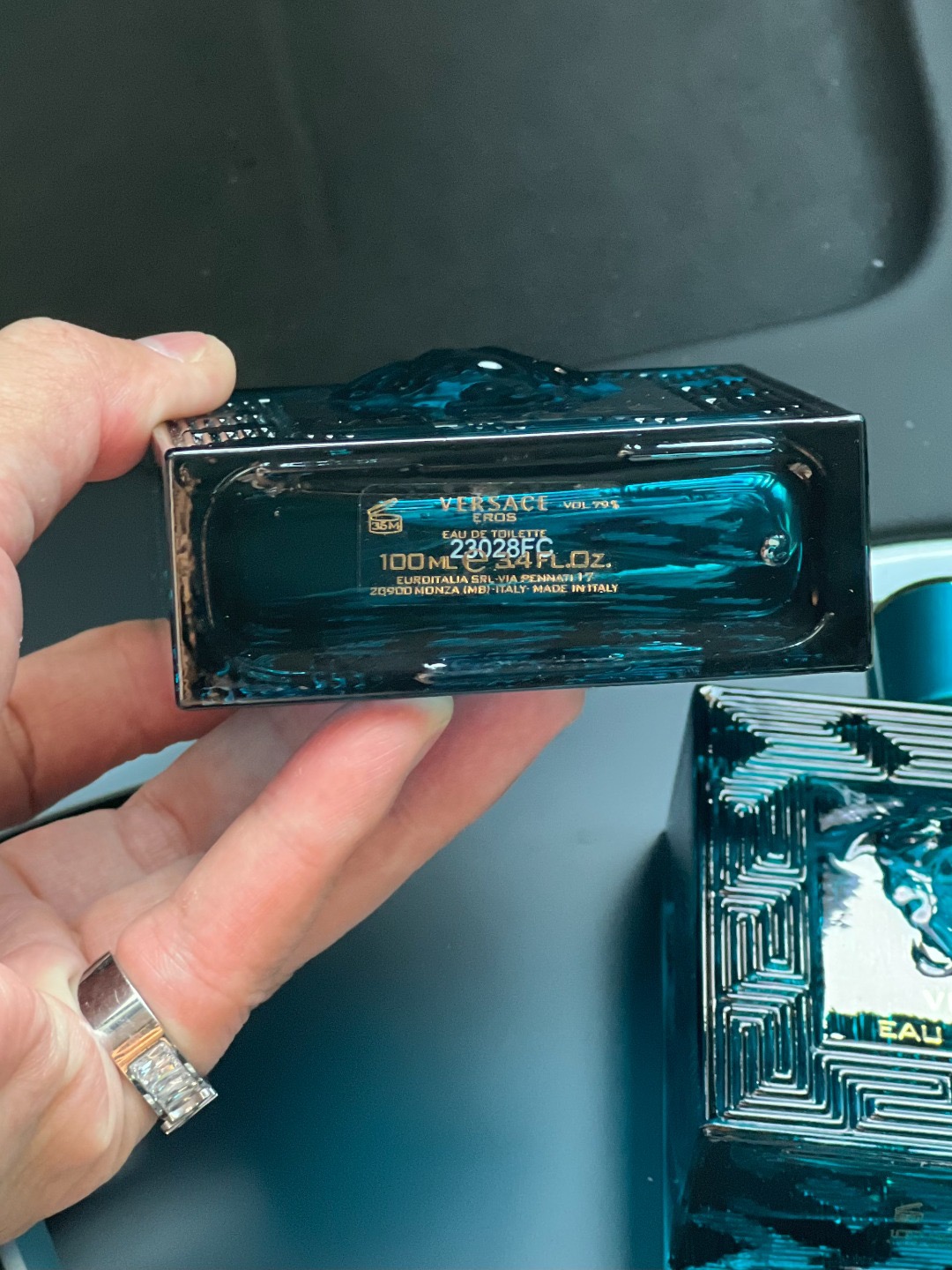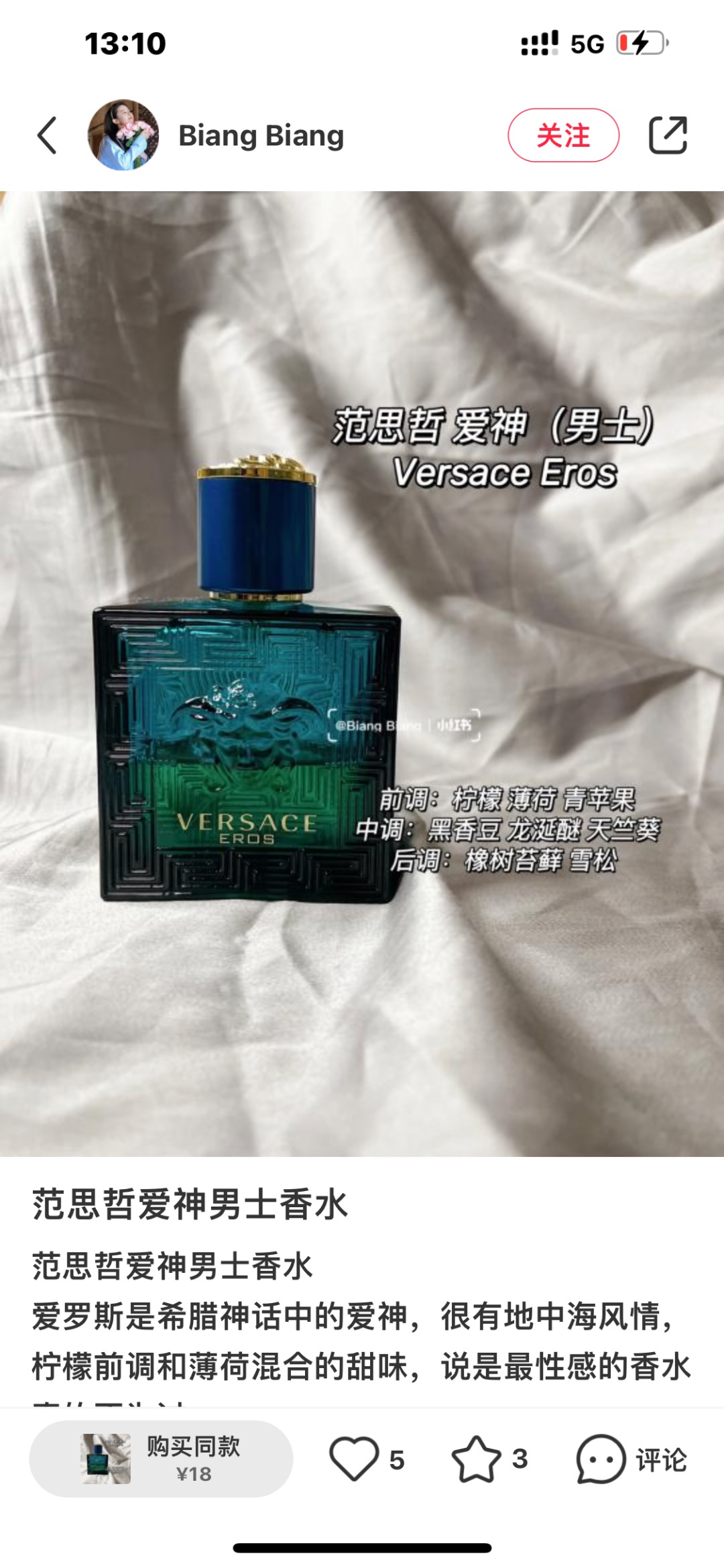 淡香浓香2个款!! VERSACE EROS 范思哲渣男! 爱神香水100ml,如果说香水是男生的第二张名片,爱神香水则是你表达自我的一部分,代表着个性和态度,范思哲EROS香水,颇有 I AM PRETTY MY WAY 的气势。范思哲推出这款以希腊爱神为名的男香,旨在致敬范思哲创始人Gianni Versace。香水瓶身犹如一件工艺品,地中海蓝的半透明瓶身配金色的元素高级华丽,浮雕的范思哲蛇发女妖充满古希腊气息,神秘又玄妙。前调:柠檬 薄荷 苹果 中调:黑香豆 龙涎醚 天竺葵花 后调:橡树苔藓 北非雪松 弗吉尼亚雪松木。初闻的清新香甜只是它的障眼法,强悍有力的致命性感才是它的真谛,大胆 率真 自由 洒脱!!