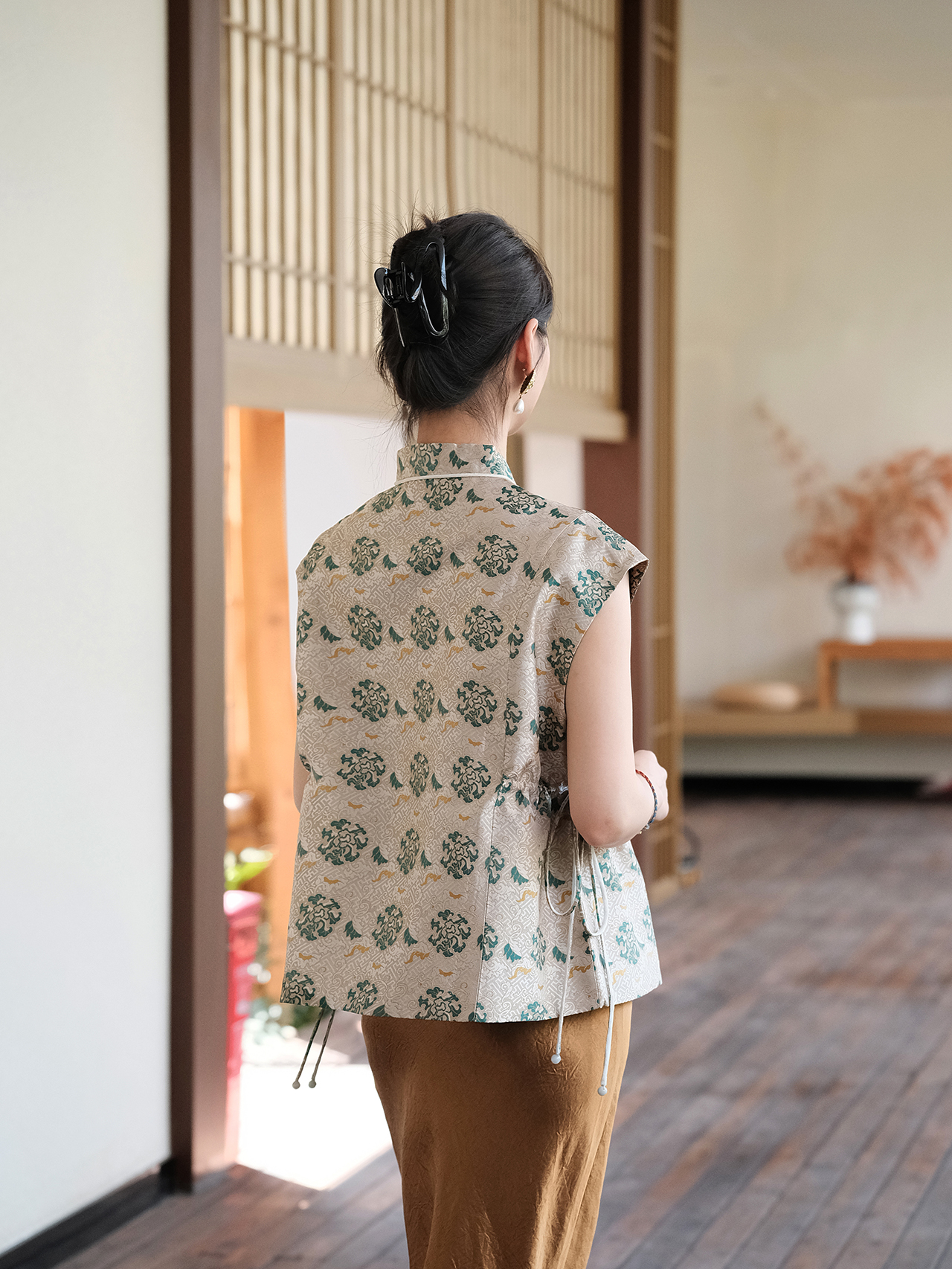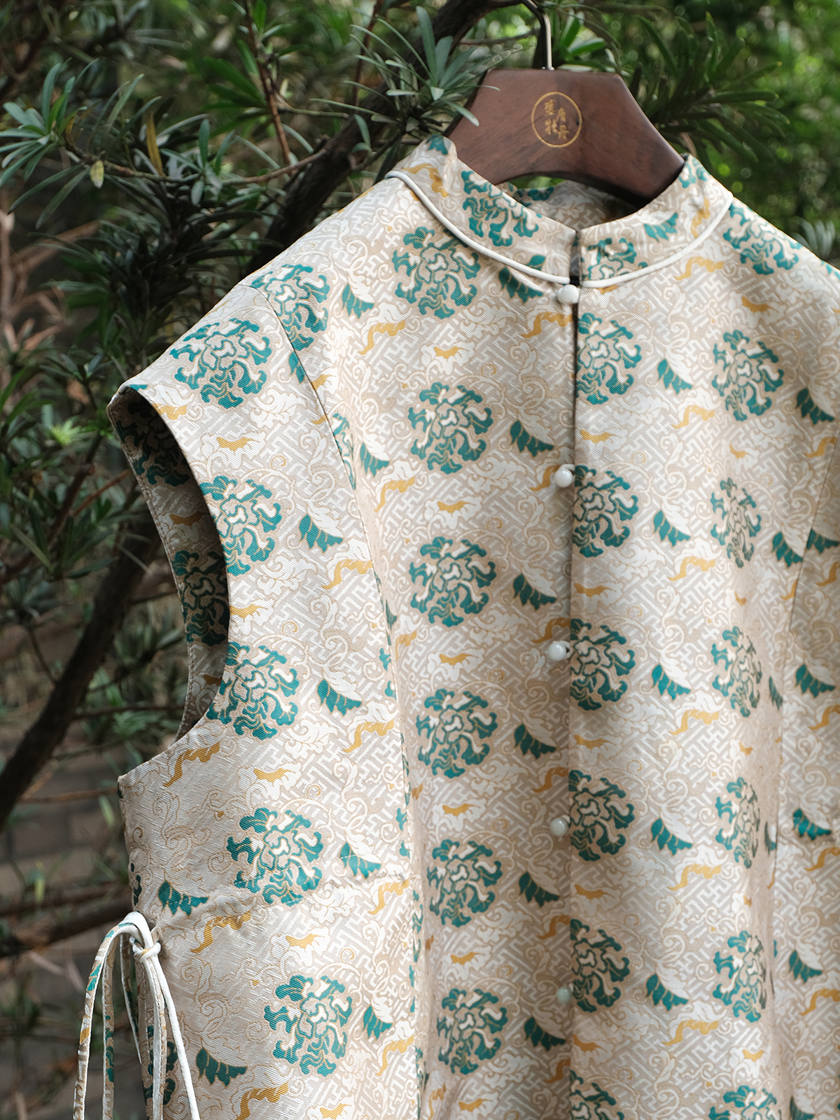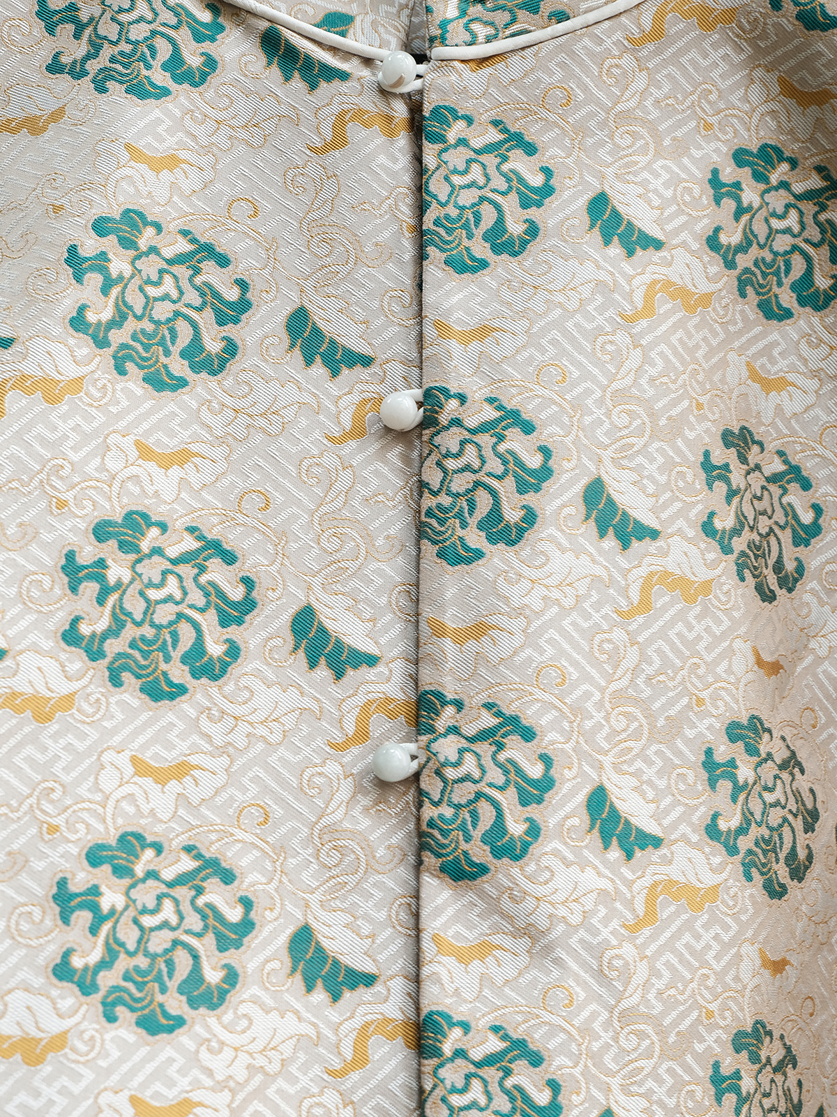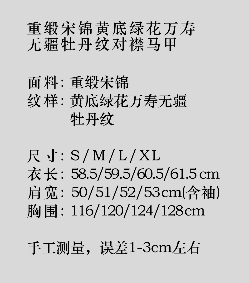 盛唐牡丹 |重缎宋锦黄底绿花万寿无疆牡丹纹对襟马甲