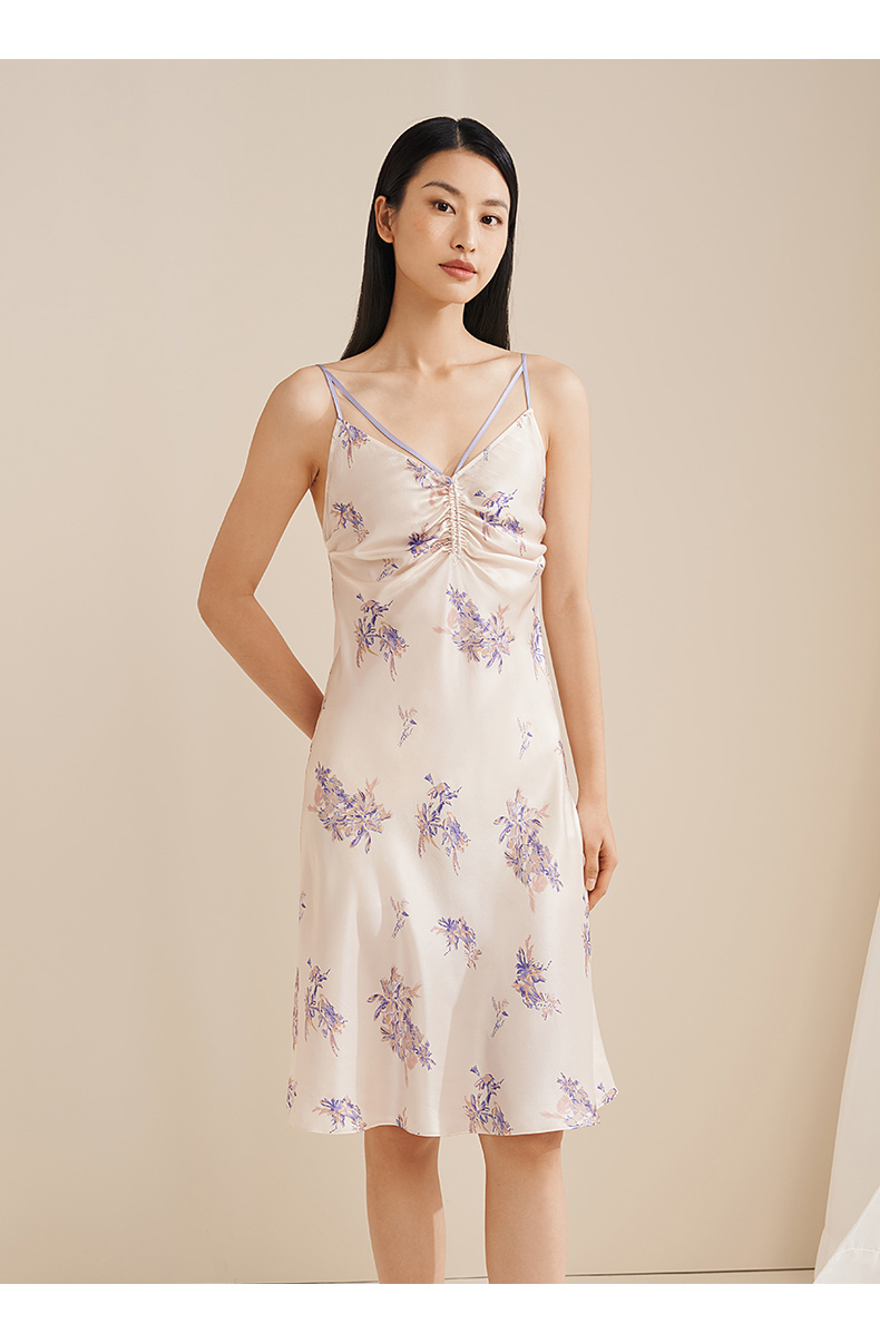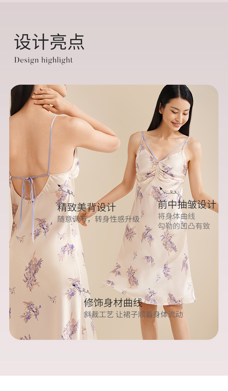 【加州假日】真丝睡裙100%桑蚕丝印花吊带裙精致美背家居服金三塔 YSFEB307