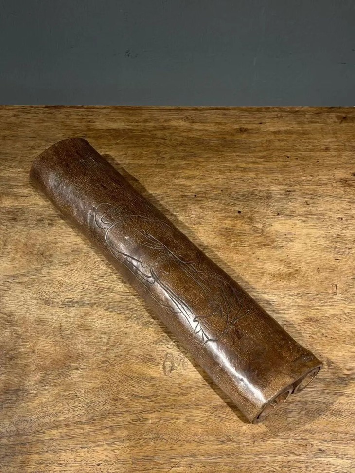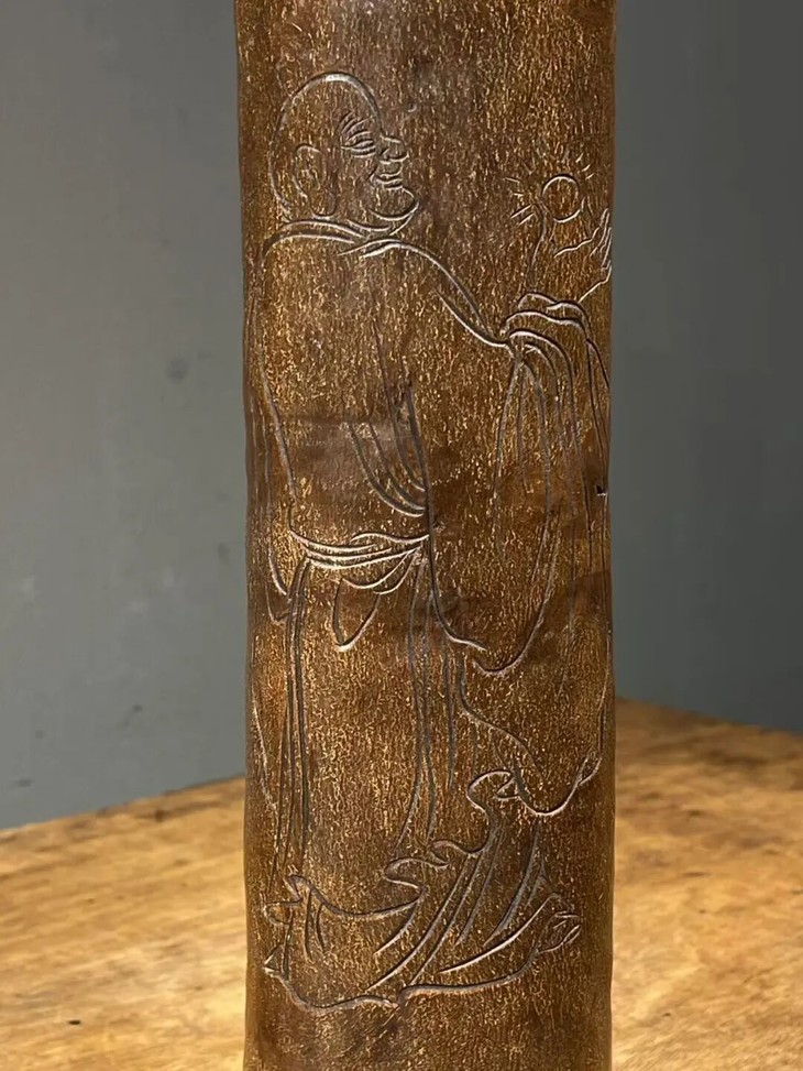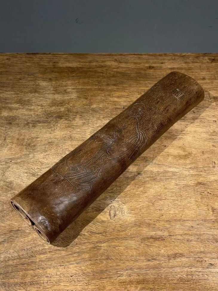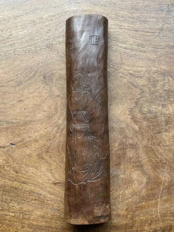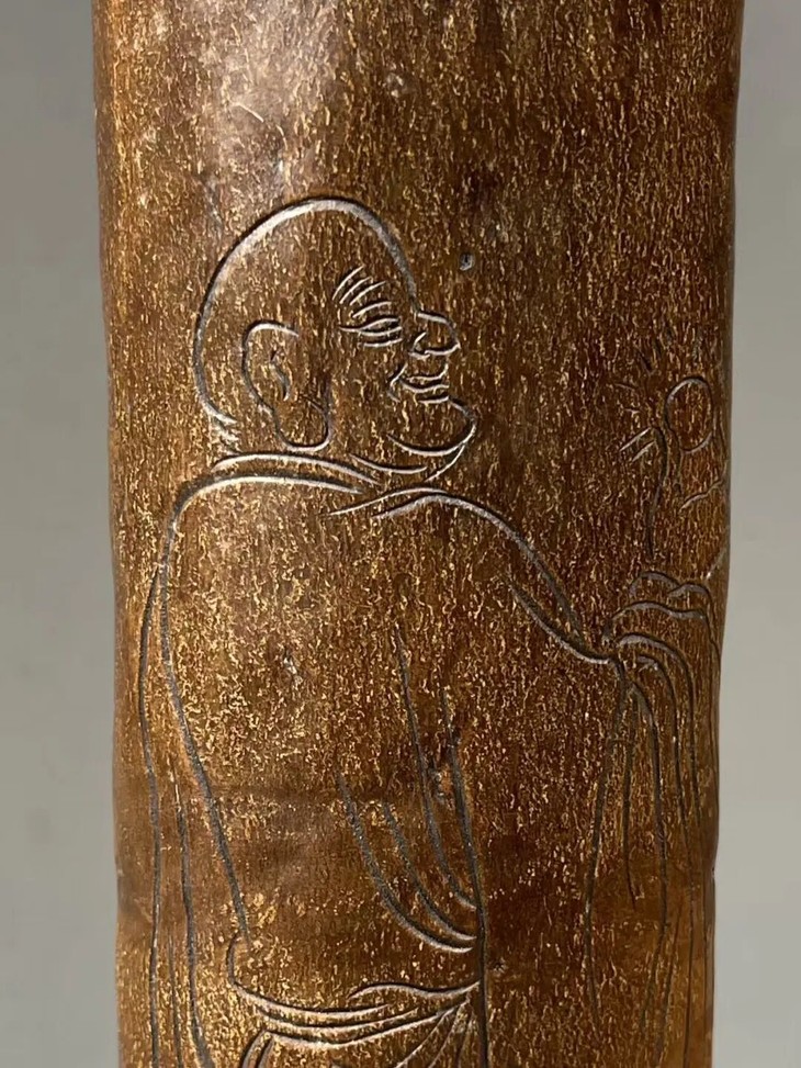 此天然桂皮雕罗汉纹臂搁,取材天然桂皮、质地坚硬纹理清晰、形状优雅浑然天成,线条简洁、比例和谐,自然风干材质包浆浑厚,纹饰雕琢文气雅緻却不繁复,是典型明清文人喜爱的简约风格,属年代久遠、收藏级别的老文房雅器。