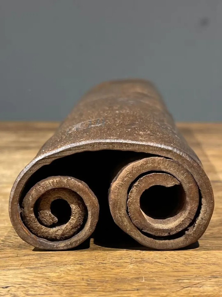 这是一件以质量上好的天然随形卷曲桂皮,表面精心阴刻罗汉立像而成的文人案头臂搁。古代文人除了取材竹、木、玉石、与象牙等制作文房用具,其它各式天然材质也因独特形状而吸引文人雅士的眼光,比如,天然桂皮卷缩成书卷形状特显文雅气质,稍加修饰雕琢即可成为优雅器具,此件桂皮随形臂搁正是最好的范例,取材质地坚硬,随形卷曲,形状浑然天成优美动人,上方圆弧面阴刻罗汉立像与章款”吉人”,底部随形天然卷曲,两侧截断面可见桂皮卷曲线条生动流畅,优雅大方,是难得一见的高雅文房用具。